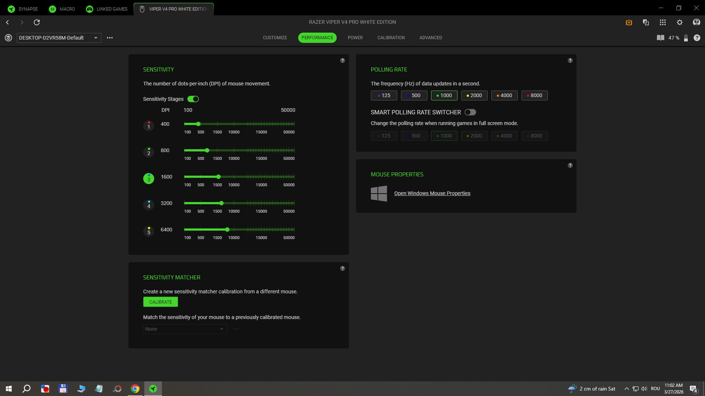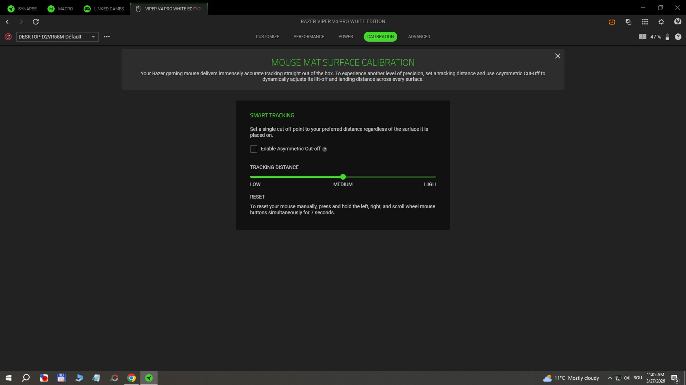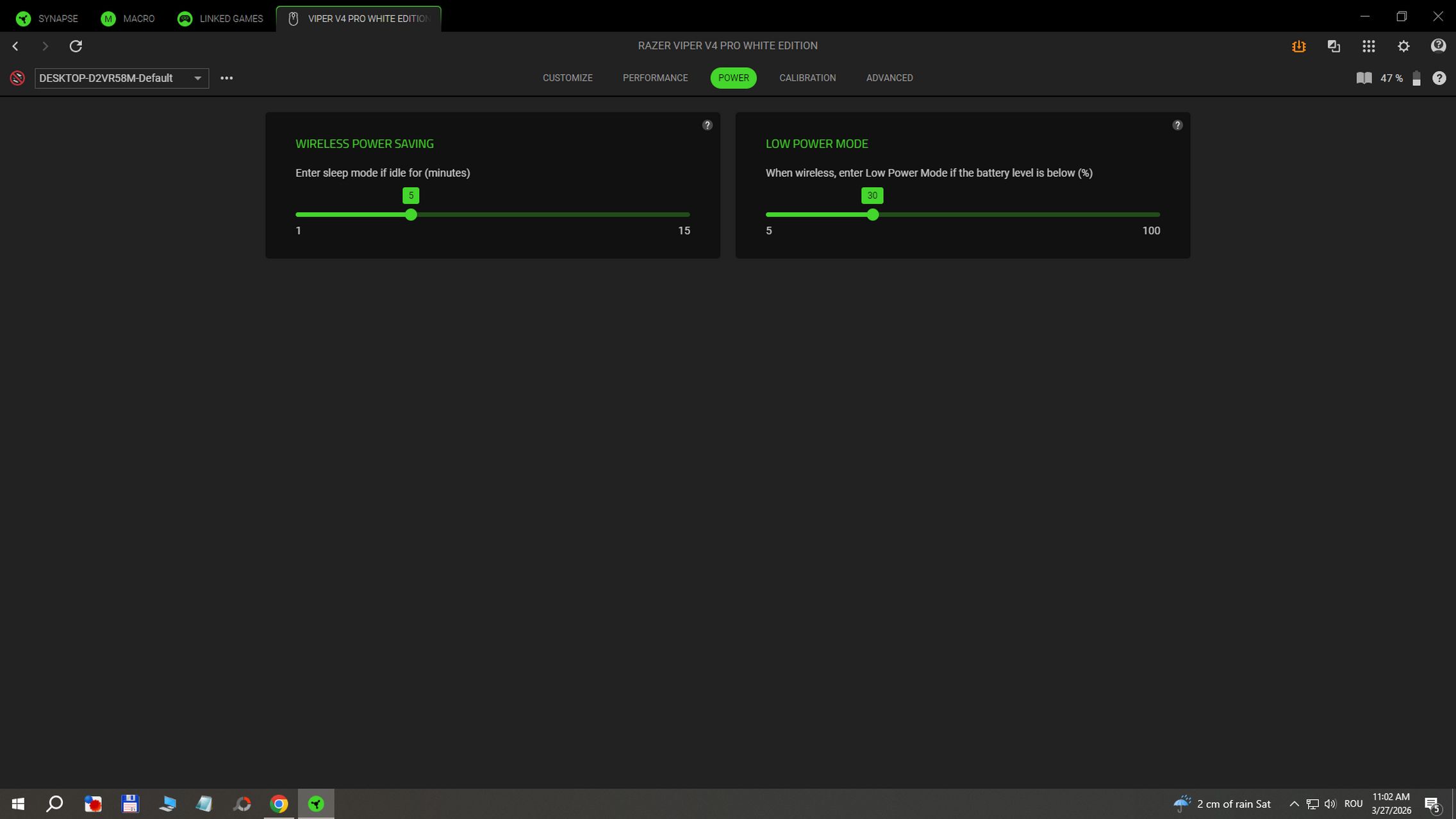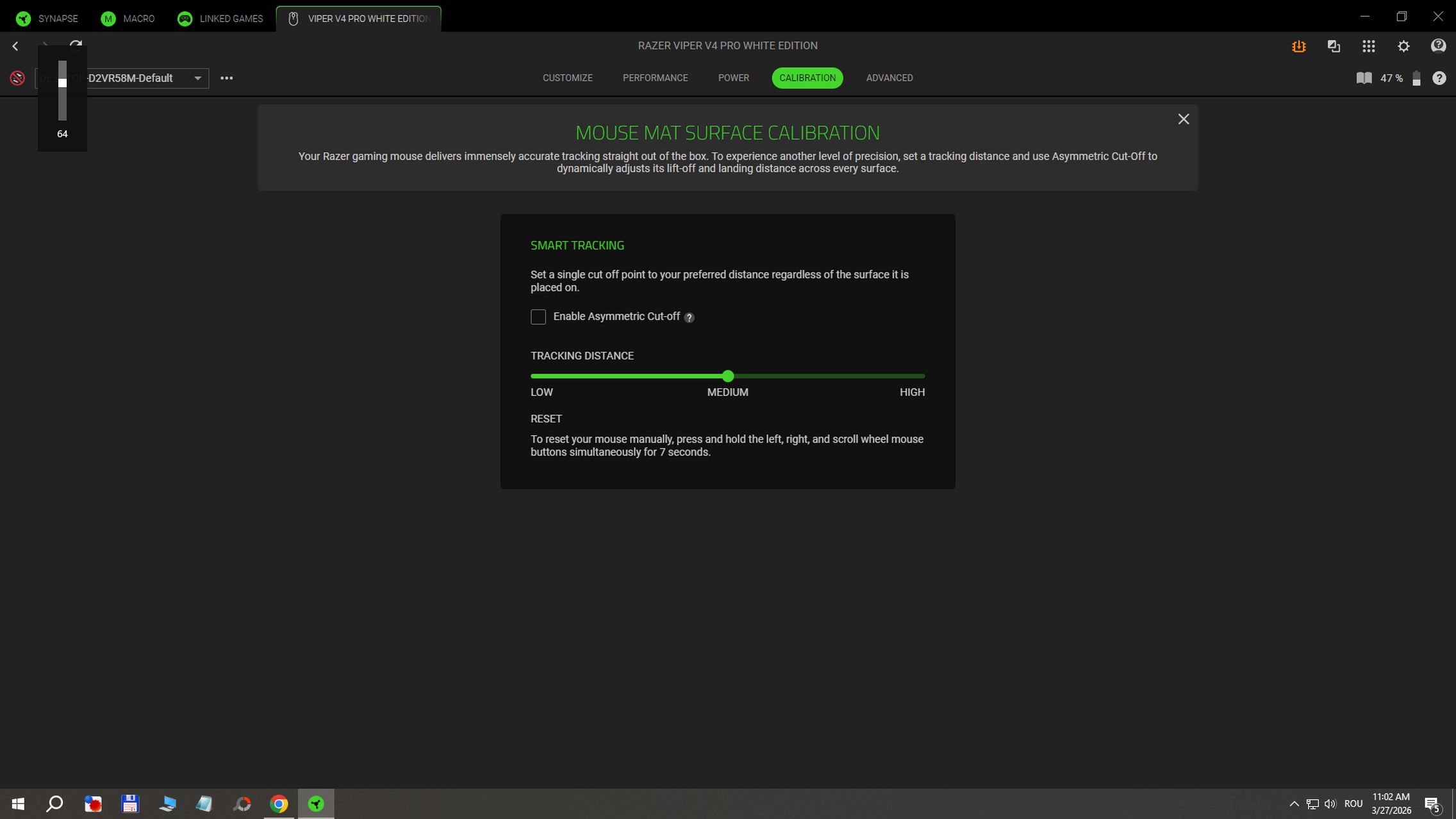 Există și soluția Razer Synapse Web pentru configurarea setărilor esențiale direct din browser. Cea instalată pe desktop mi-a mai oferit acces la moduri Power Saving în wireless sau la Low Power Mode activat la atingerea unui anumit procent de baterie. Există și calibrare pentru suprafața mousepad-ului unde poți seta distanța de tracking pe low, medium sau high.