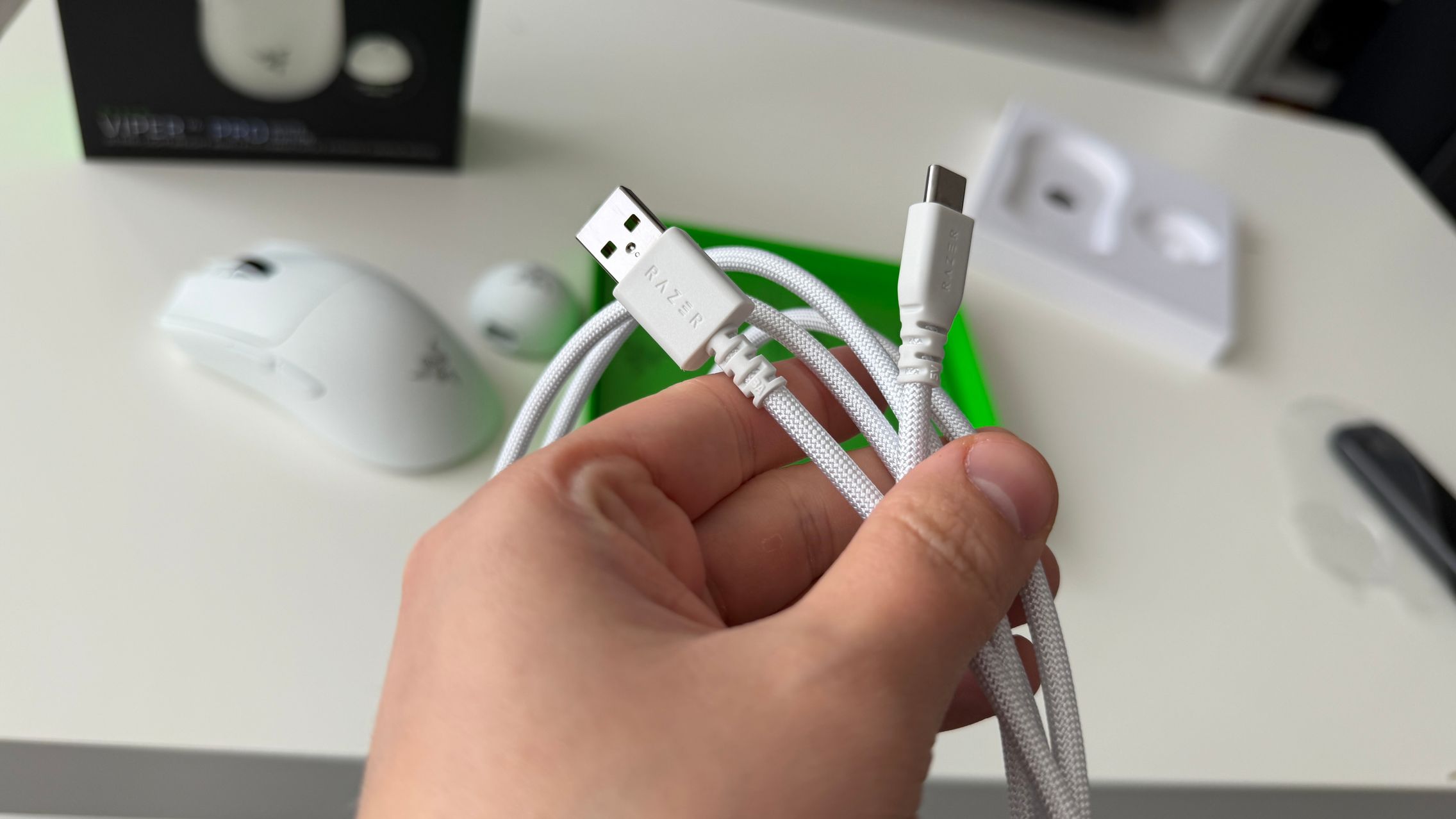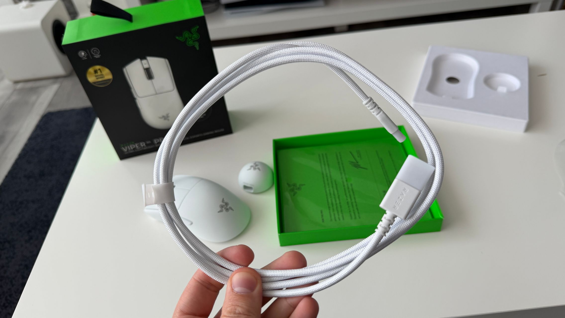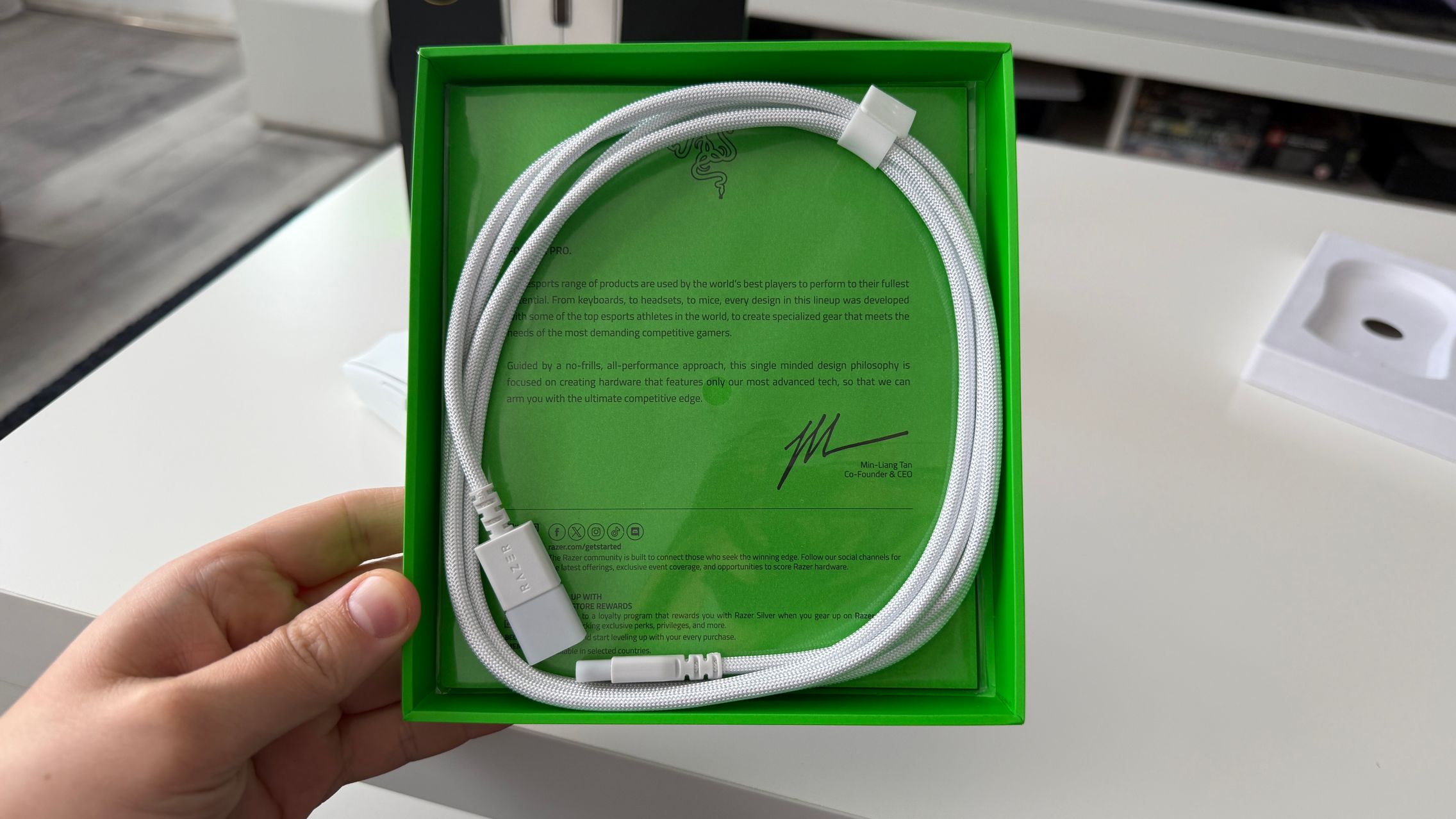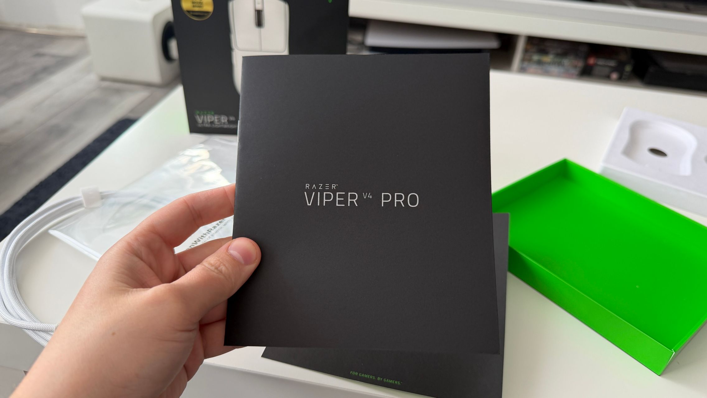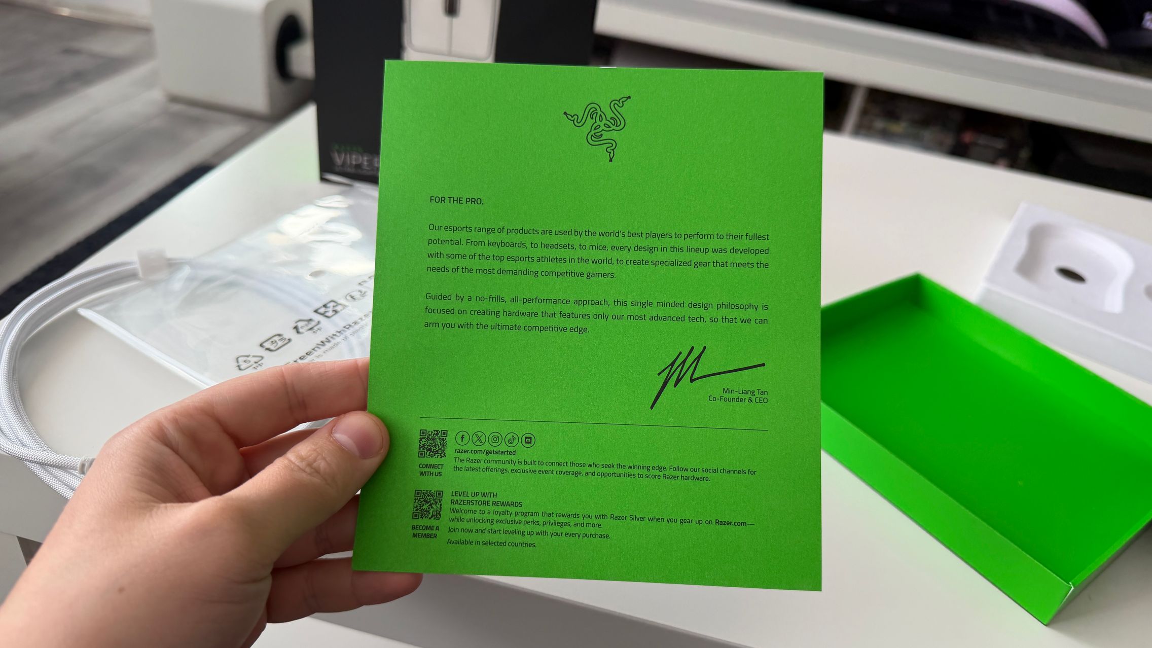 În cutia lui Viper V4 Pro am găsit mouse-ul, în varianta pe alb, alături de dongle-ul USB pentru semnal, cablul textil de la USB-C la USB-A. Am dat și de gripuri, stickere RAZER, manualul de utilizare și un mesaj de la Min-Liang Tan, co-fondator și CEO al companiei. El ne spune că acest mouse a fost creat pentru a mulțumi și cei mai competitivi gameri.