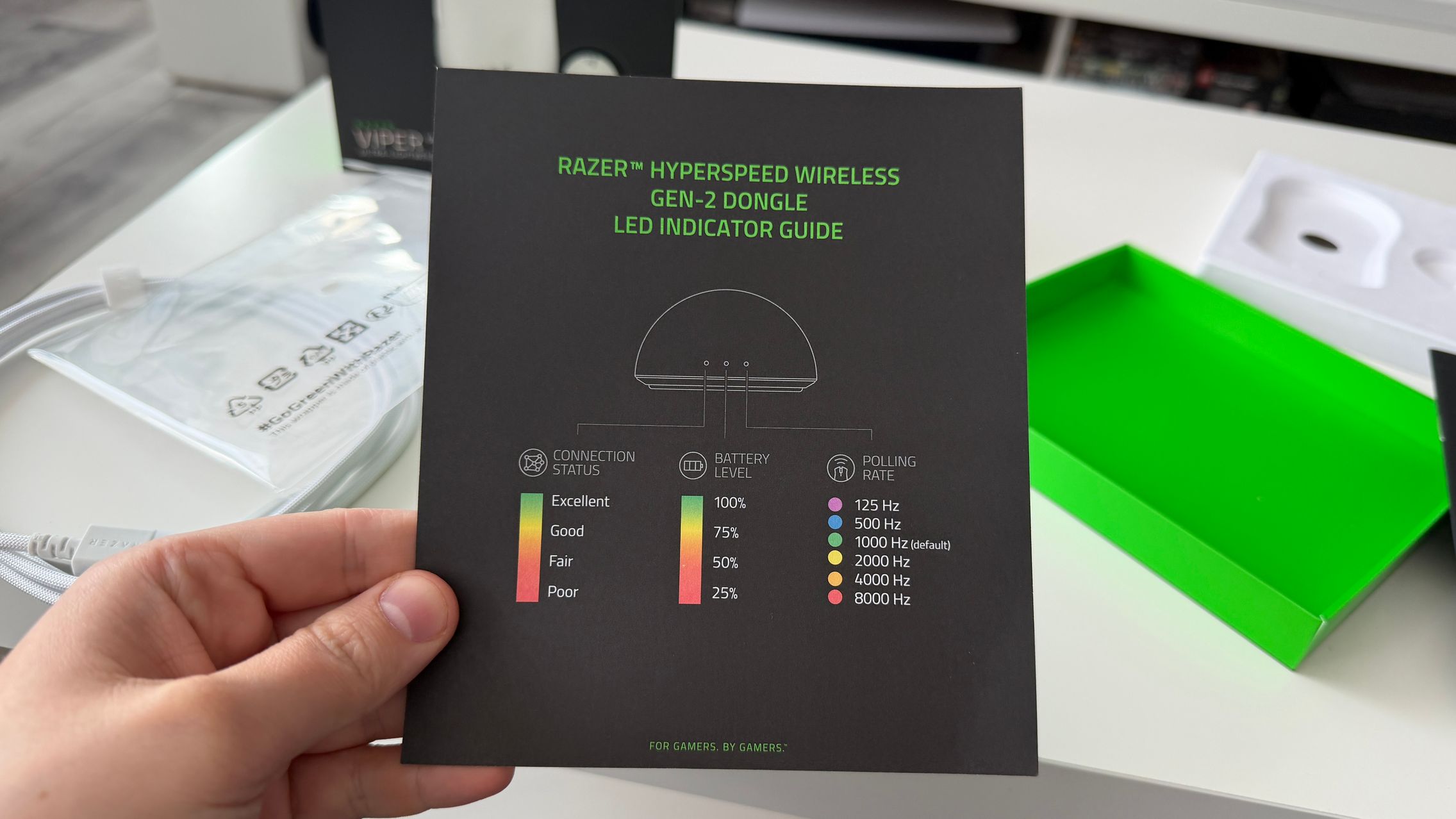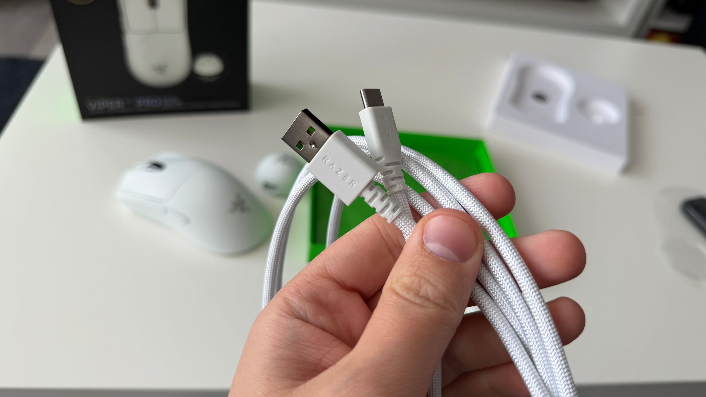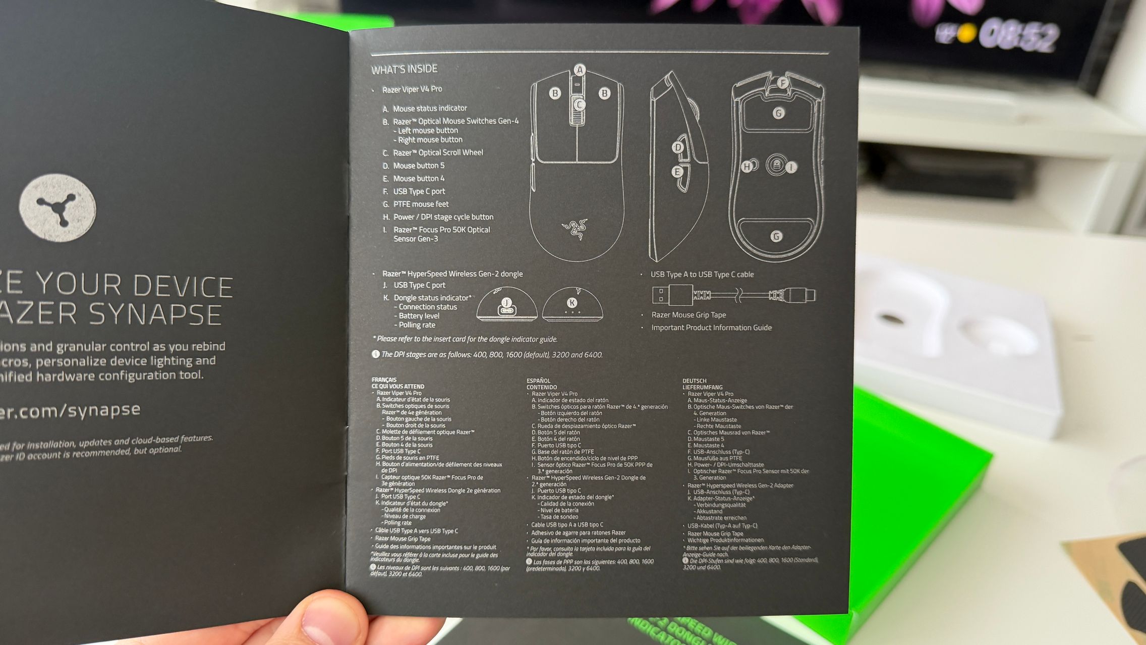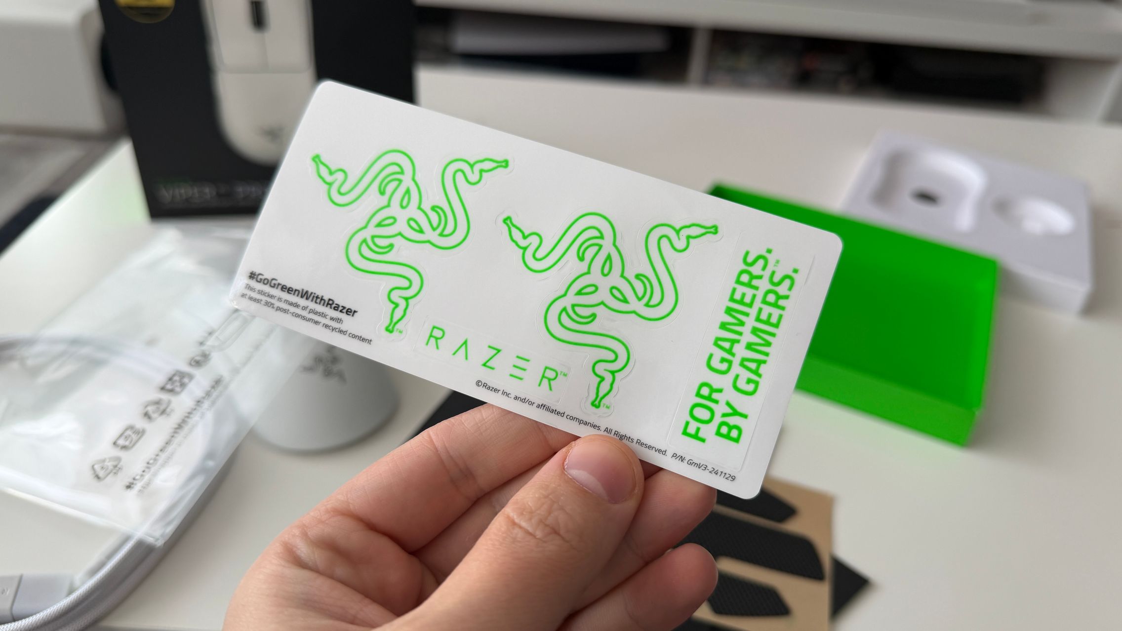 În cutia lui Viper V4 Pro am găsit mouse-ul, în varianta pe alb, alături de dongle-ul USB pentru semnal, cablul textil de la USB-C la USB-A. Am dat și de gripuri, stickere RAZER, manualul de utilizare și un mesaj de la Min-Liang Tan, co-fondator și CEO al companiei. El ne spune că acest mouse a fost creat pentru a mulțumi și cei mai competitivi gameri.