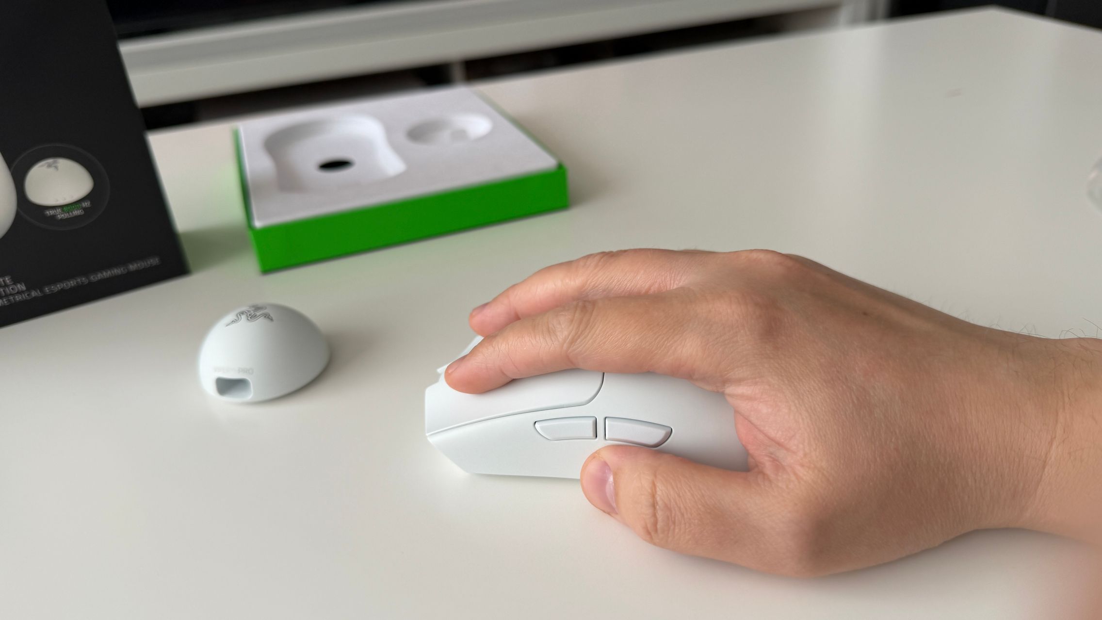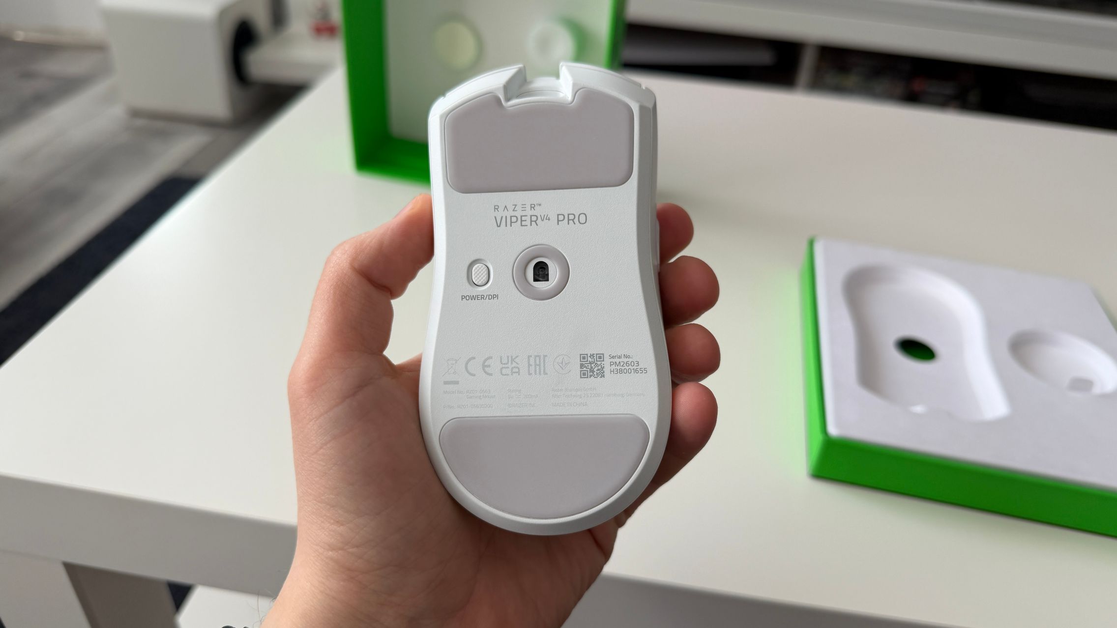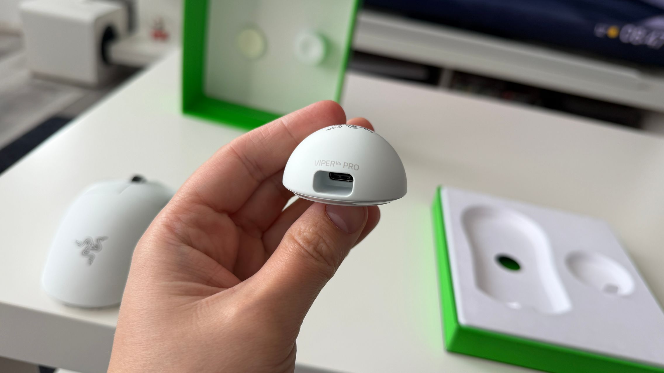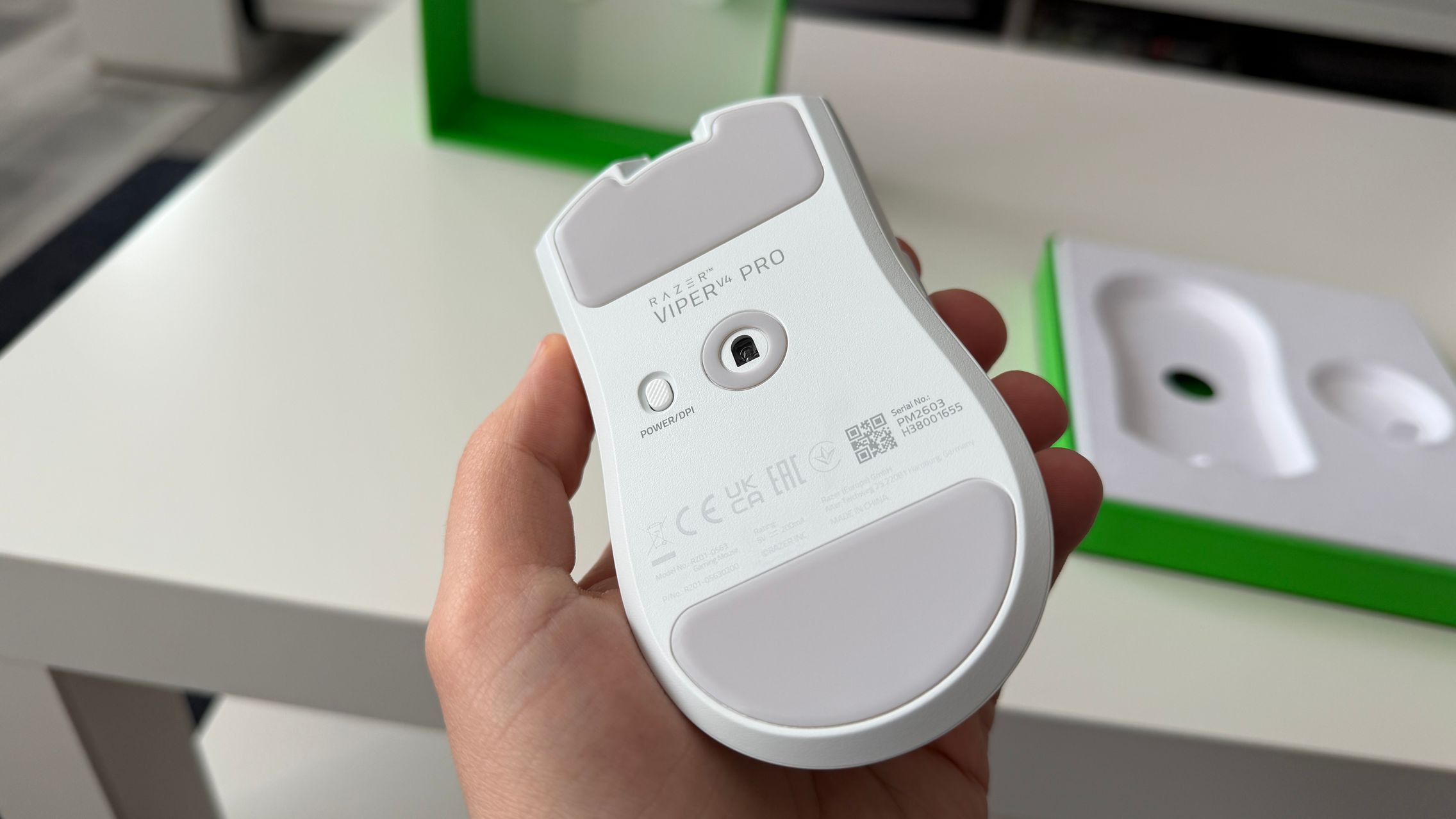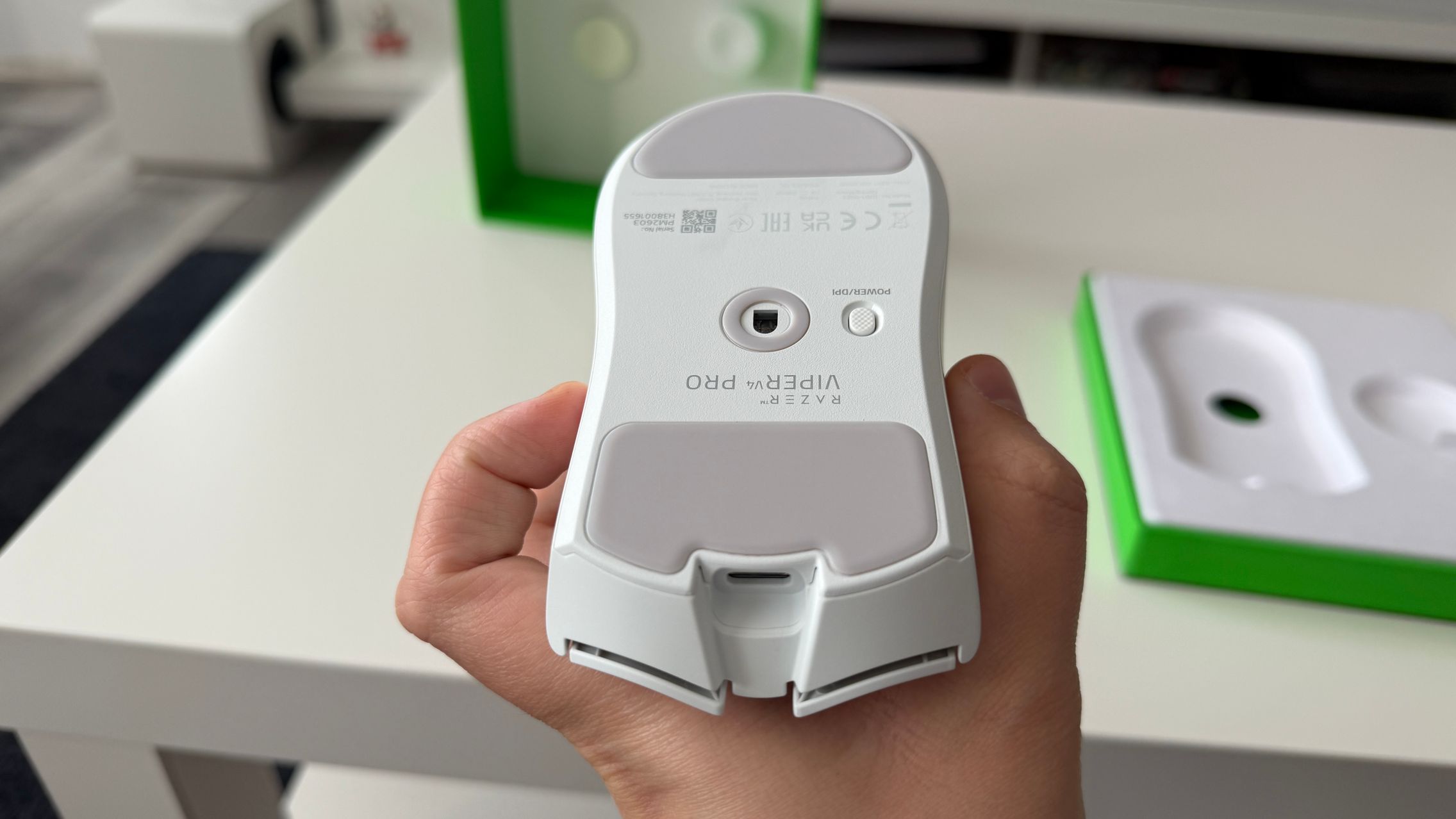 În cutia lui Viper V4 Pro am găsit mouse-ul, în varianta pe alb, alături de dongle-ul USB pentru semnal, cablul textil de la USB-C la USB-A. Am dat și de gripuri, stickere RAZER, manualul de utilizare și un mesaj de la Min-Liang Tan, co-fondator și CEO al companiei. El ne spune că acest mouse a fost creat pentru a mulțumi și cei mai competitivi gameri.