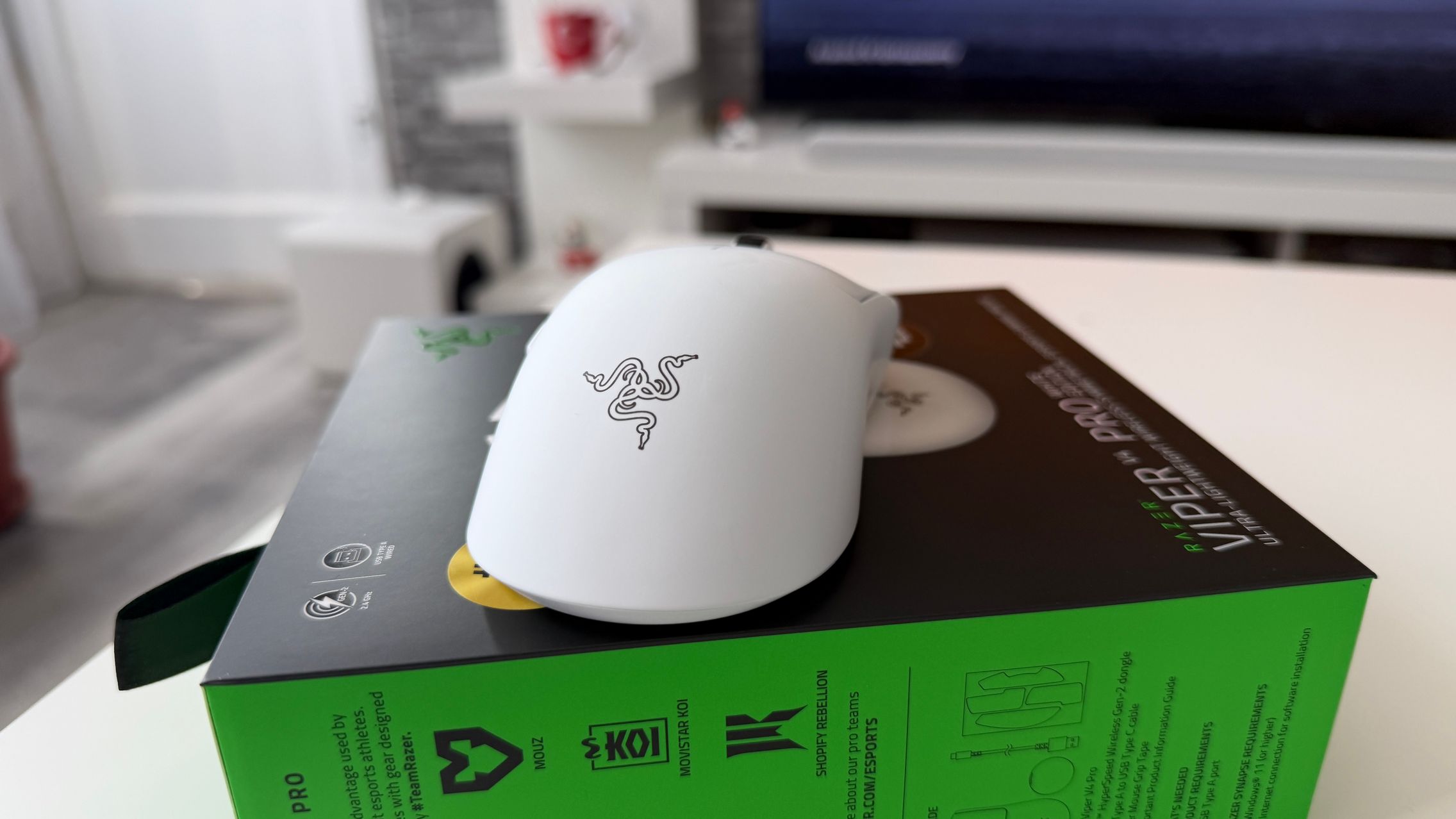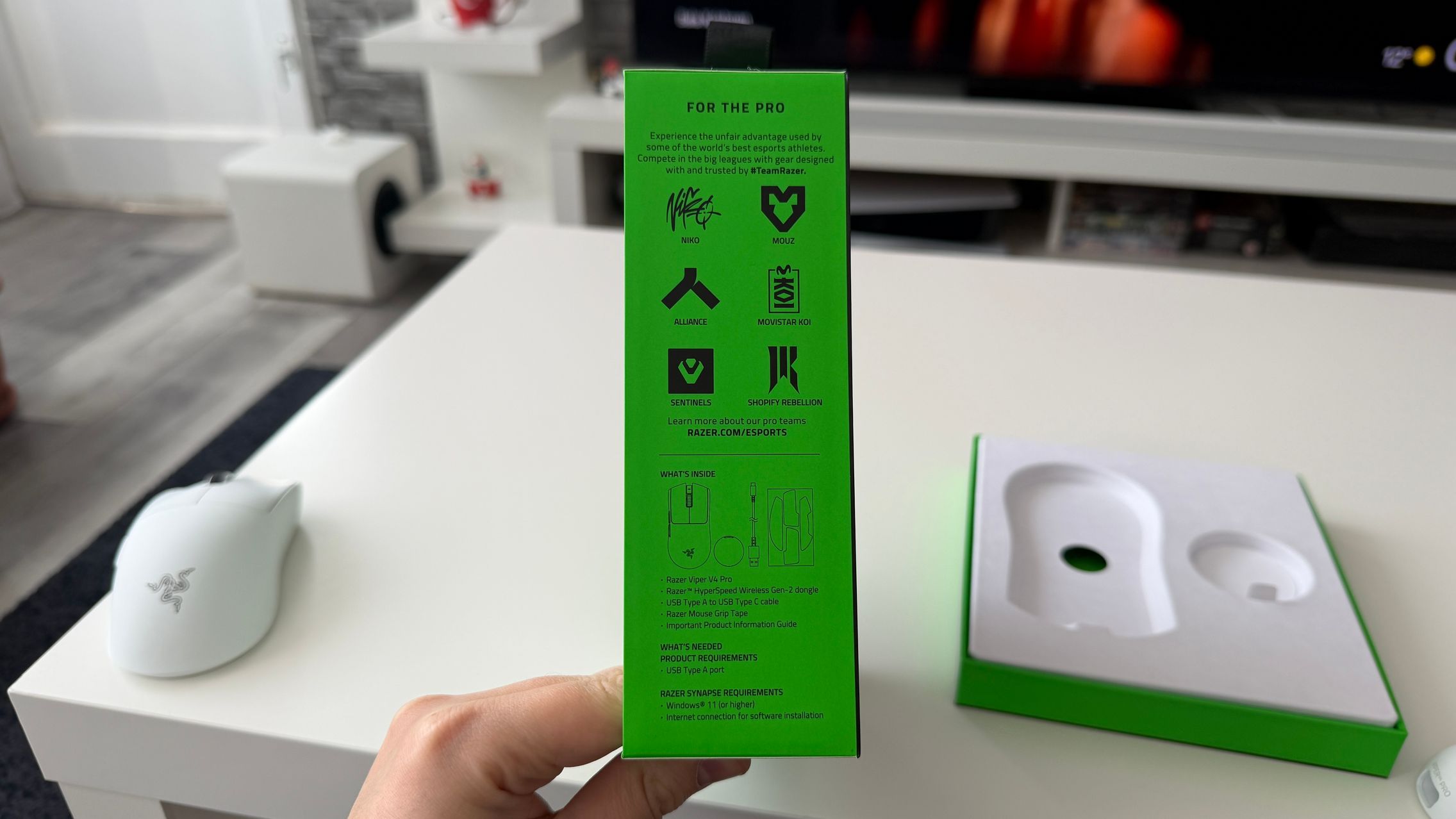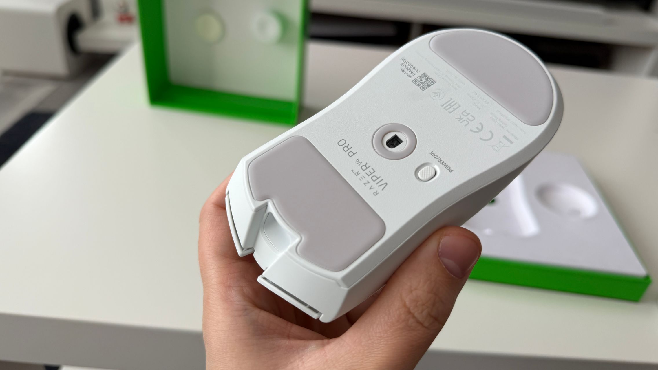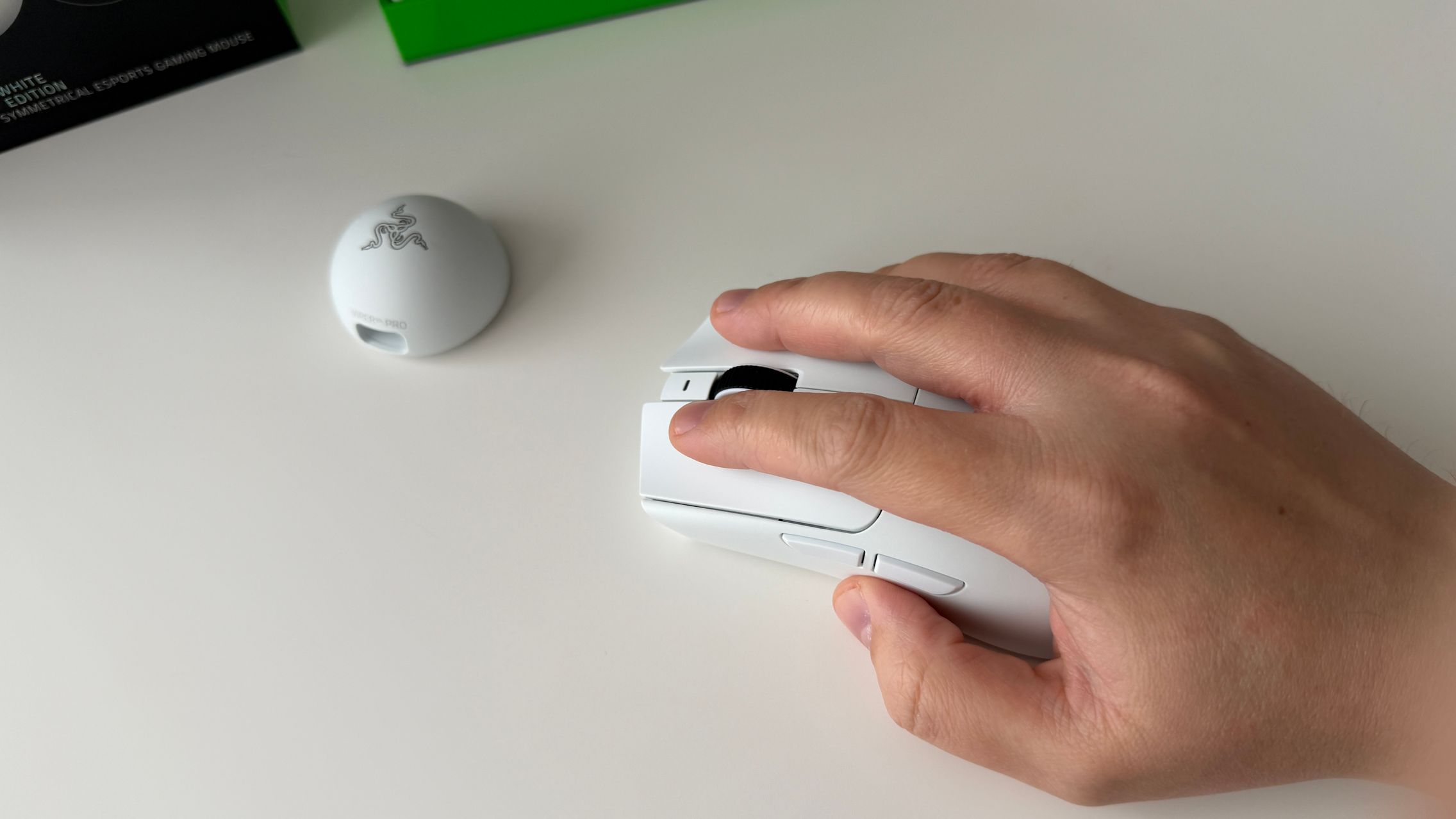 În cutia lui Viper V4 Pro am găsit mouse-ul, în varianta pe alb, alături de dongle-ul USB pentru semnal, cablul textil de la USB-C la USB-A. Am dat și de gripuri, stickere RAZER, manualul de utilizare și un mesaj de la Min-Liang Tan, co-fondator și CEO al companiei. El ne spune că acest mouse a fost creat pentru a mulțumi și cei mai competitivi gameri.