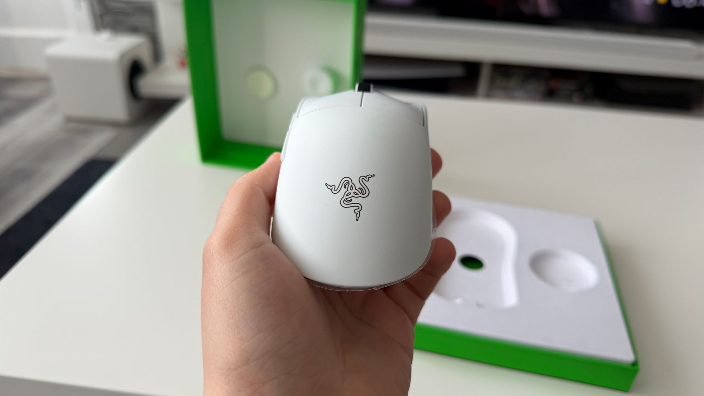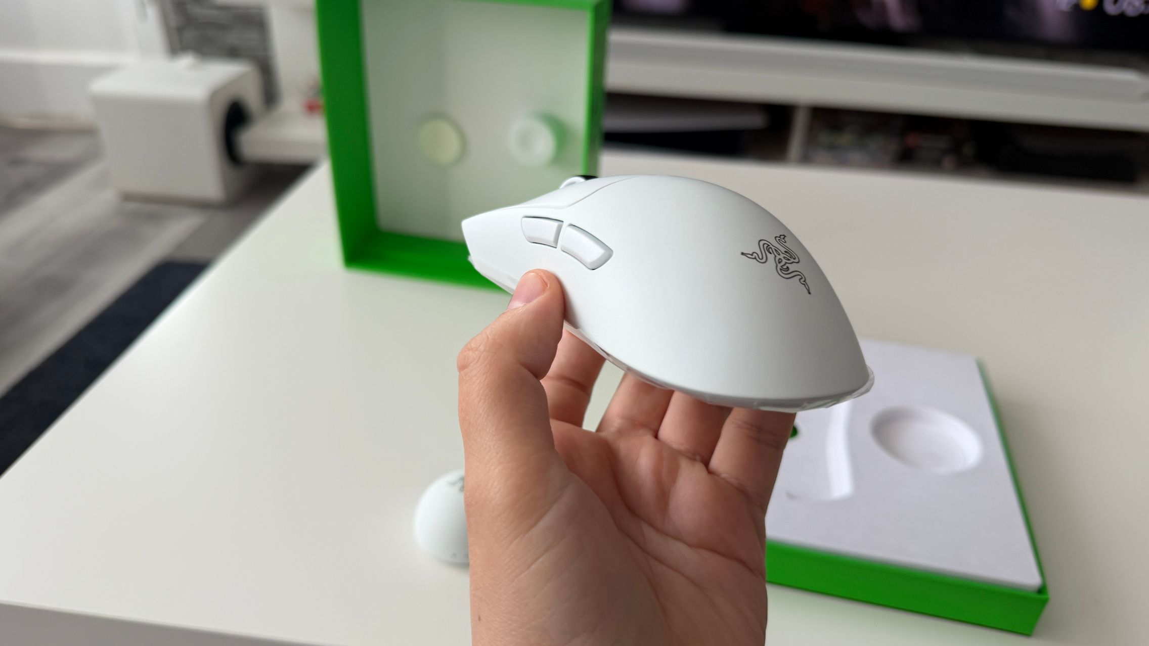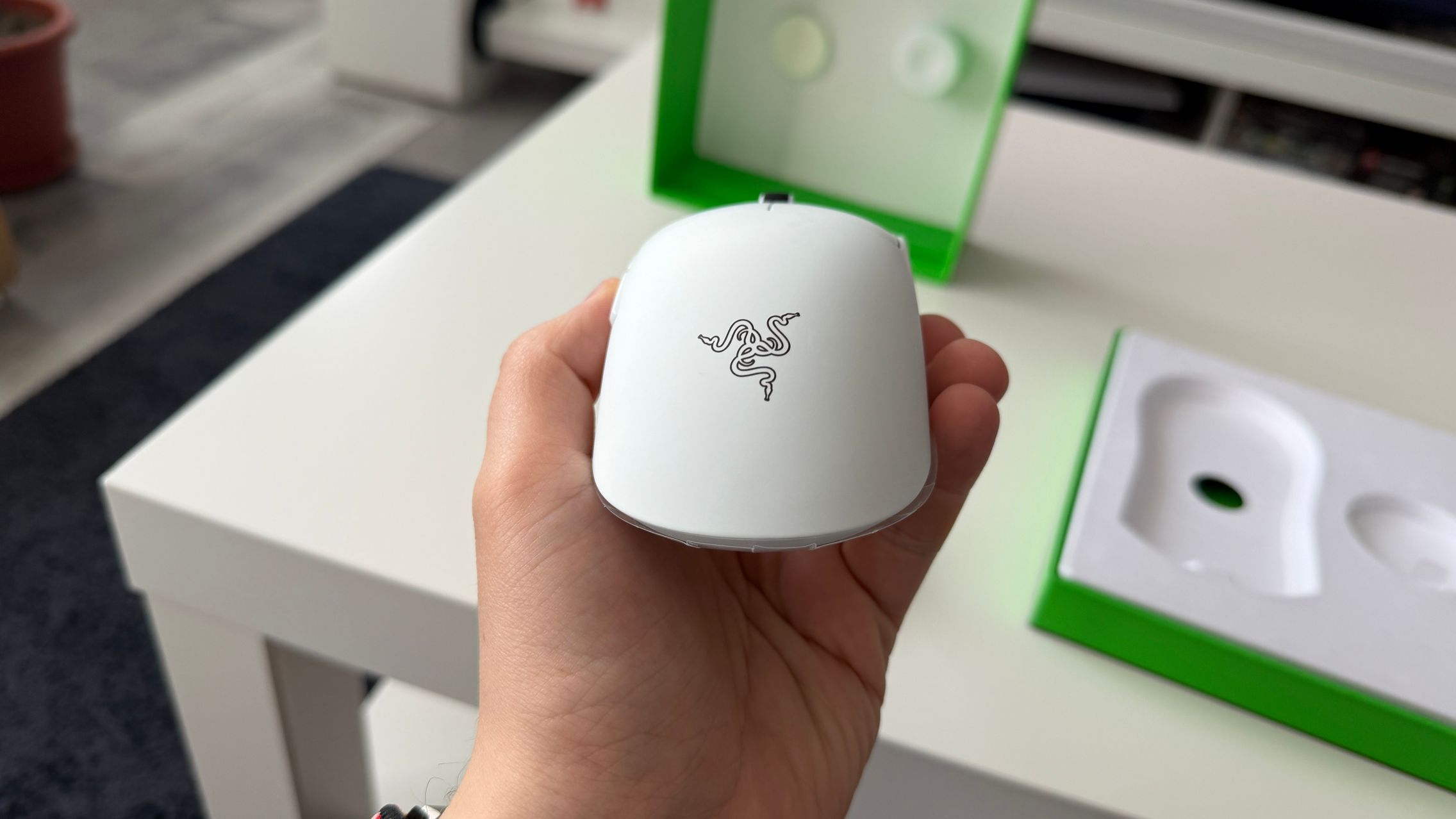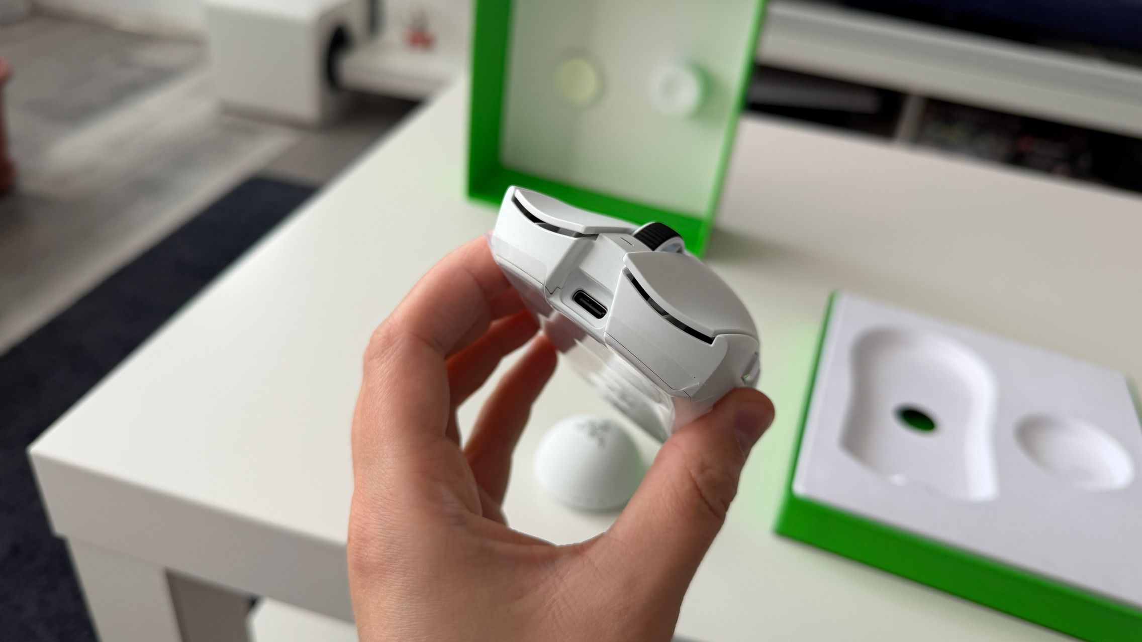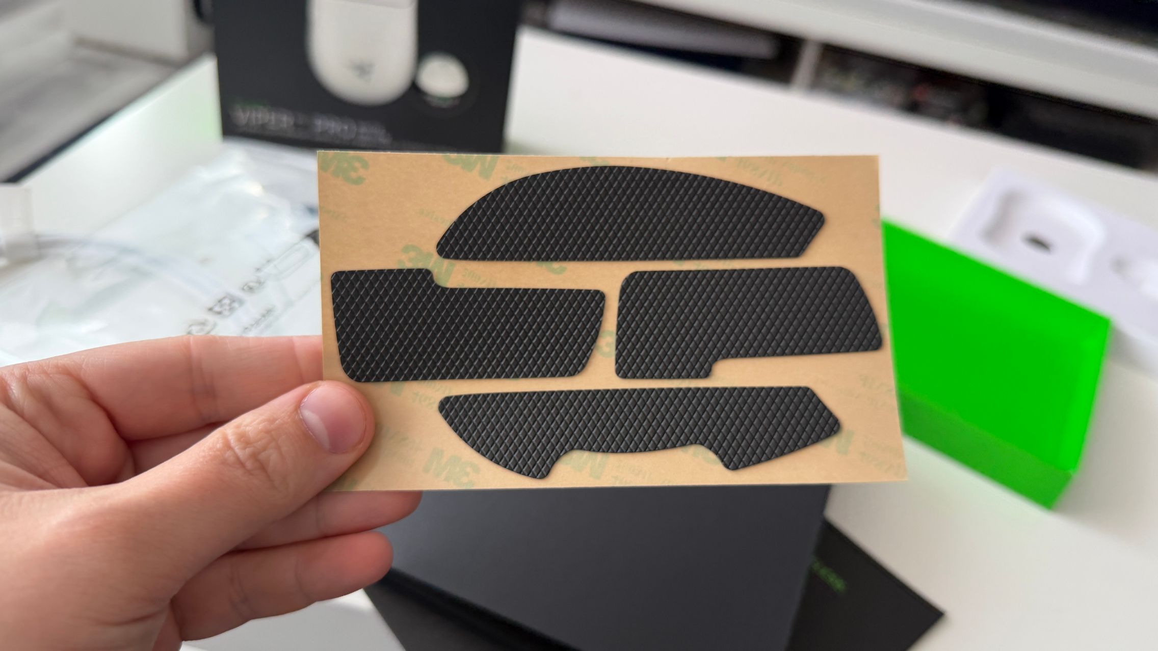 În cutia lui Viper V4 Pro am găsit mouse-ul, în varianta pe alb, alături de dongle-ul USB pentru semnal, cablul textil de la USB-C la USB-A. Am dat și de gripuri, stickere RAZER, manualul de utilizare și un mesaj de la Min-Liang Tan, co-fondator și CEO al companiei. El ne spune că acest mouse a fost creat pentru a mulțumi și cei mai competitivi gameri.