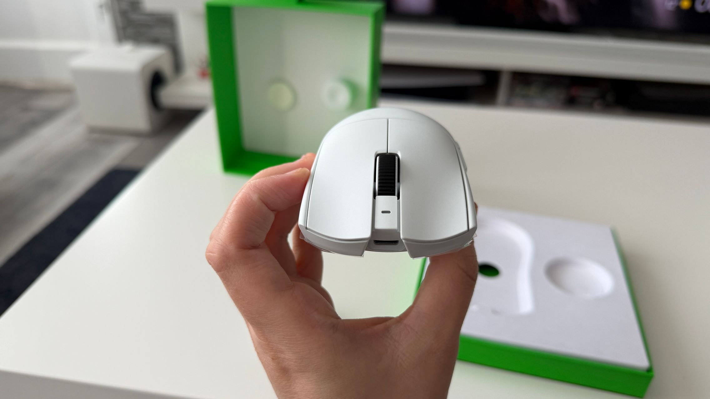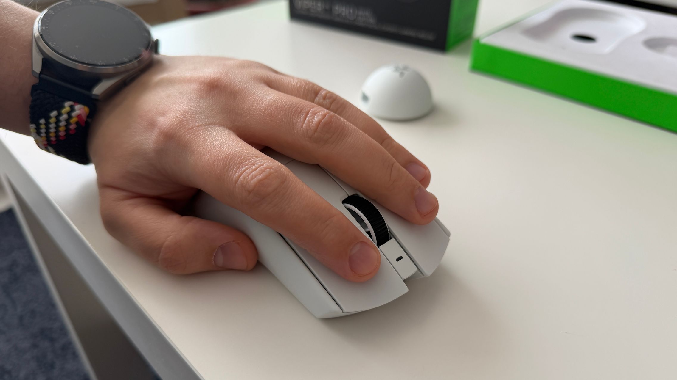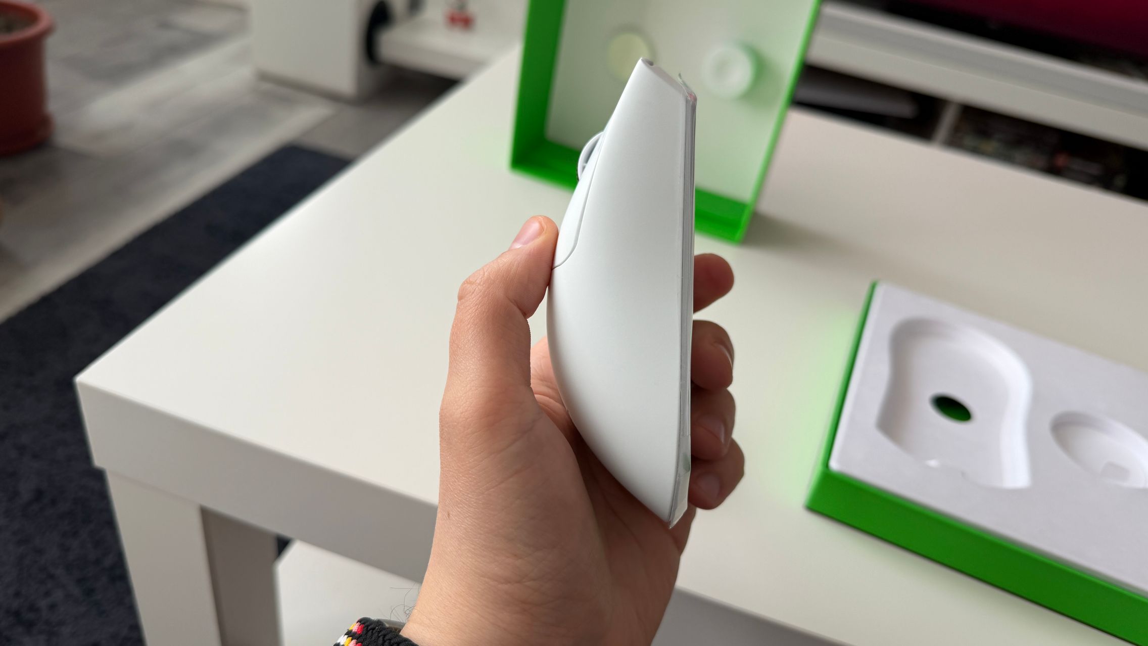 Mouse-ul a venit pe alb la mine, așa cum spuneam și mai sus, dar există și varianta pe negru pentru cei care preferă această abordare vizuală. Mie îmi place albul, e minimalist, are un finisaj premium plăcut la atingere și simt că se potrivește cu palma mea mai mică. E comod și îmi odihnesc perfect mâna pe acesta.