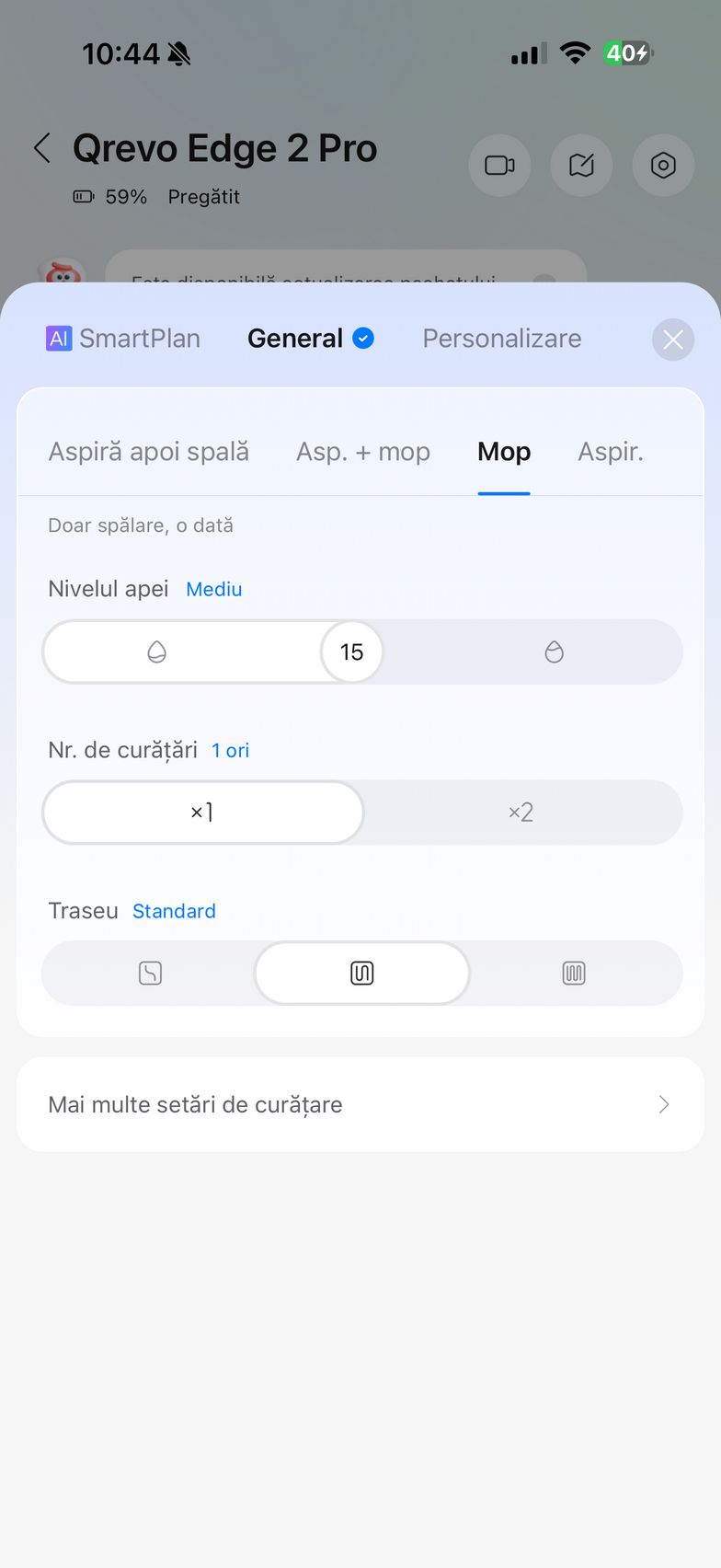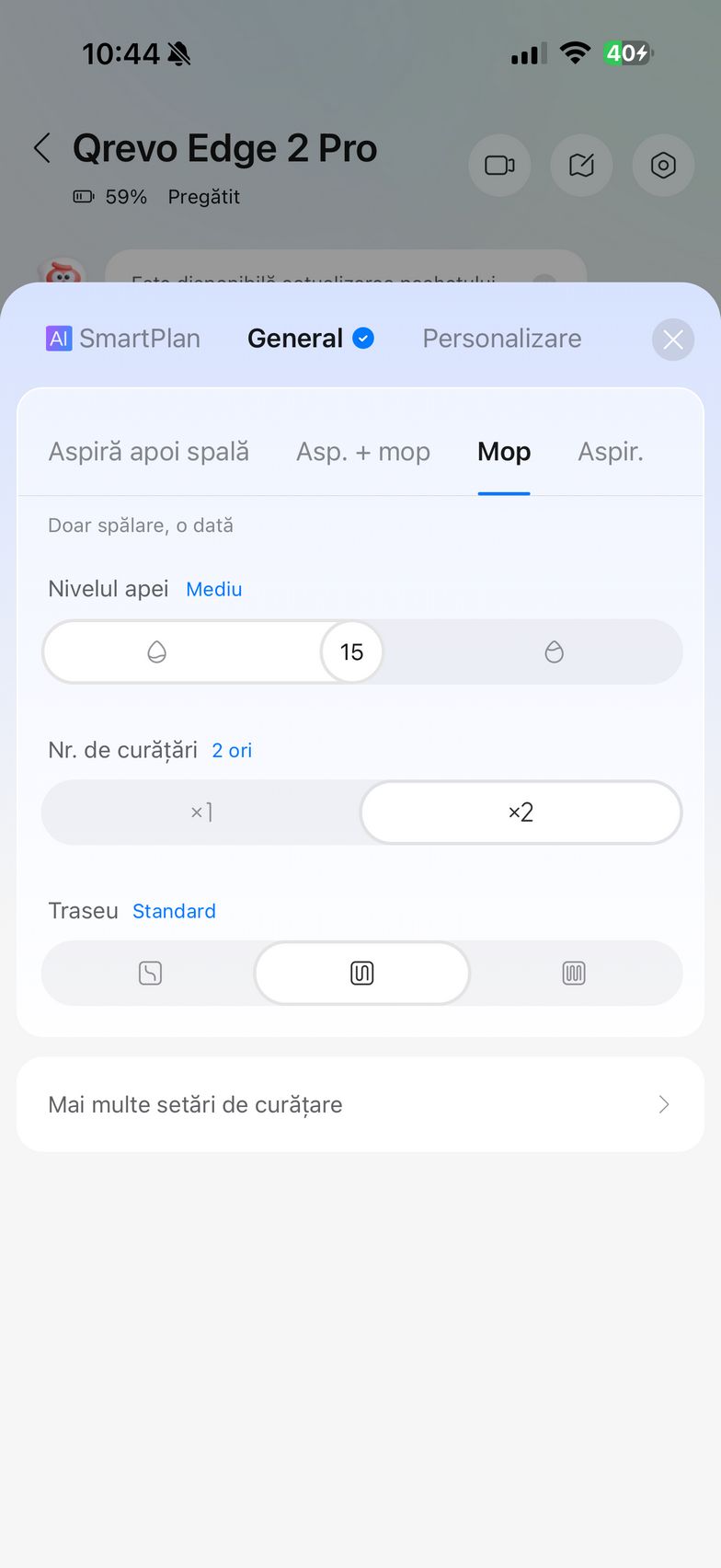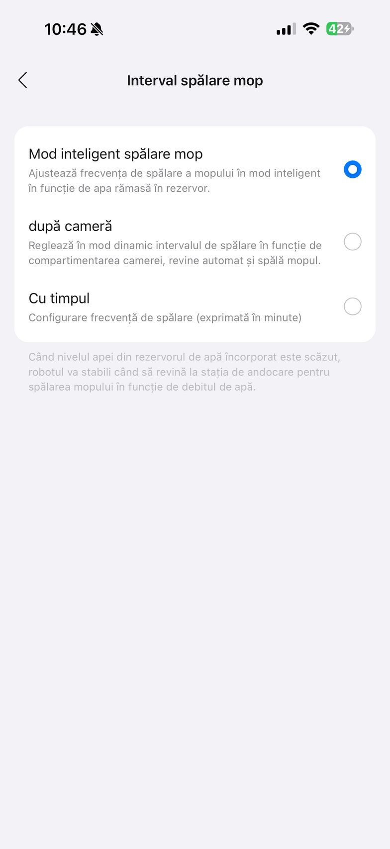 - Interval spălare mop - mod inteligent, după cameră, cu timpul (10-15-20-25 min)