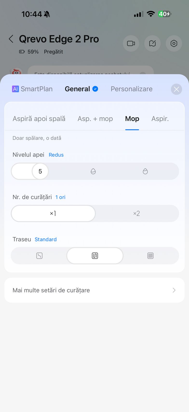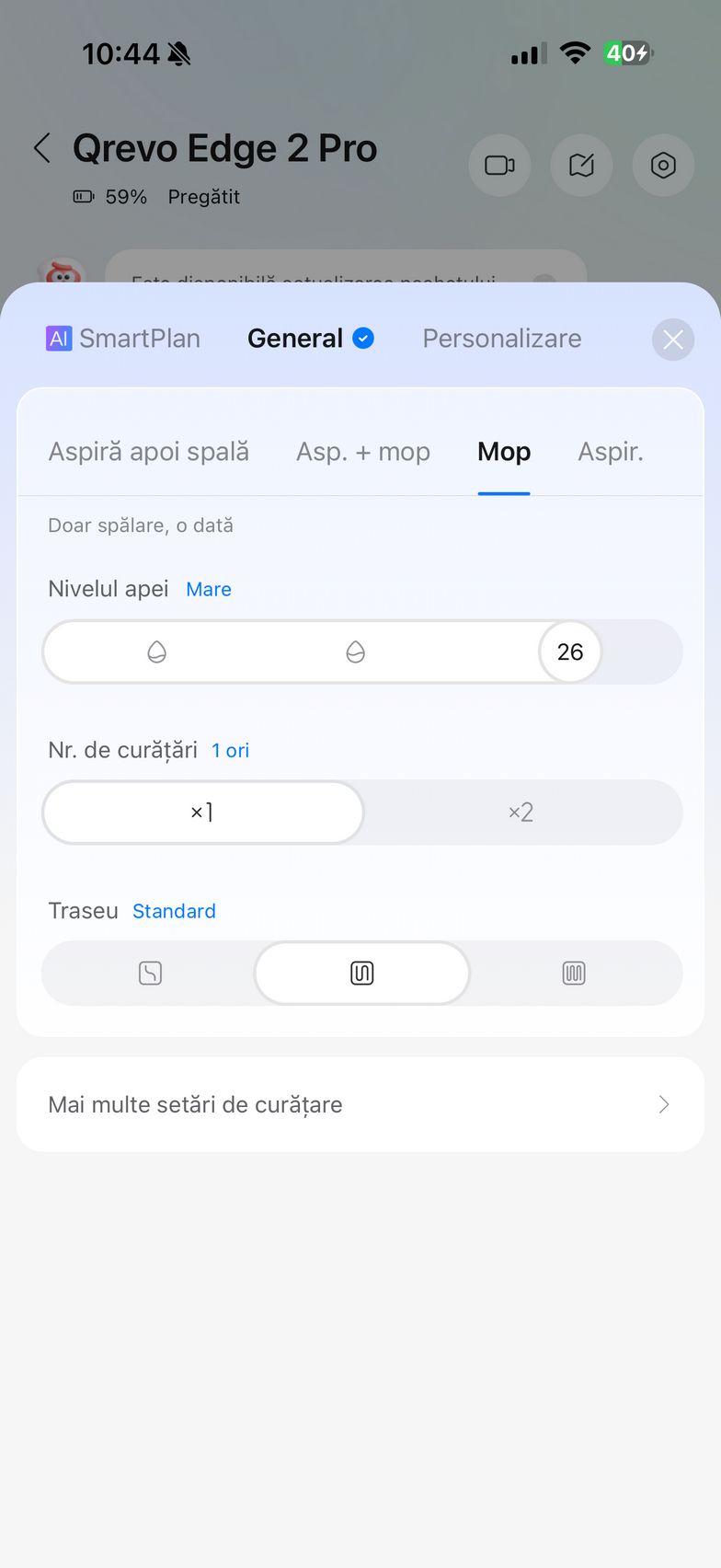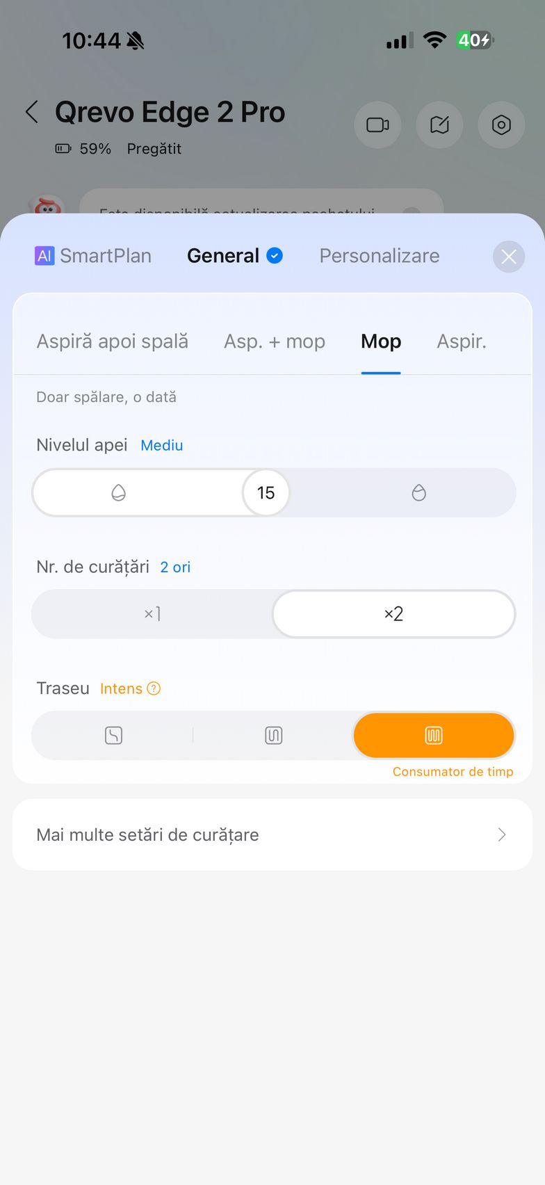 - Interval spălare mop - mod inteligent, după cameră, cu timpul (10-15-20-25 min)