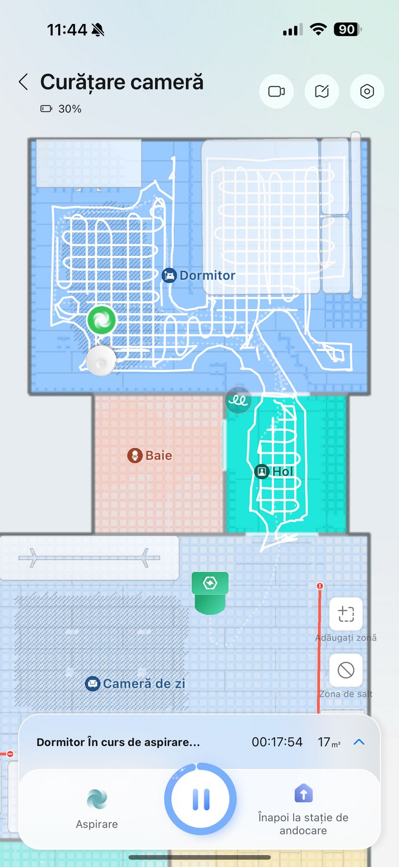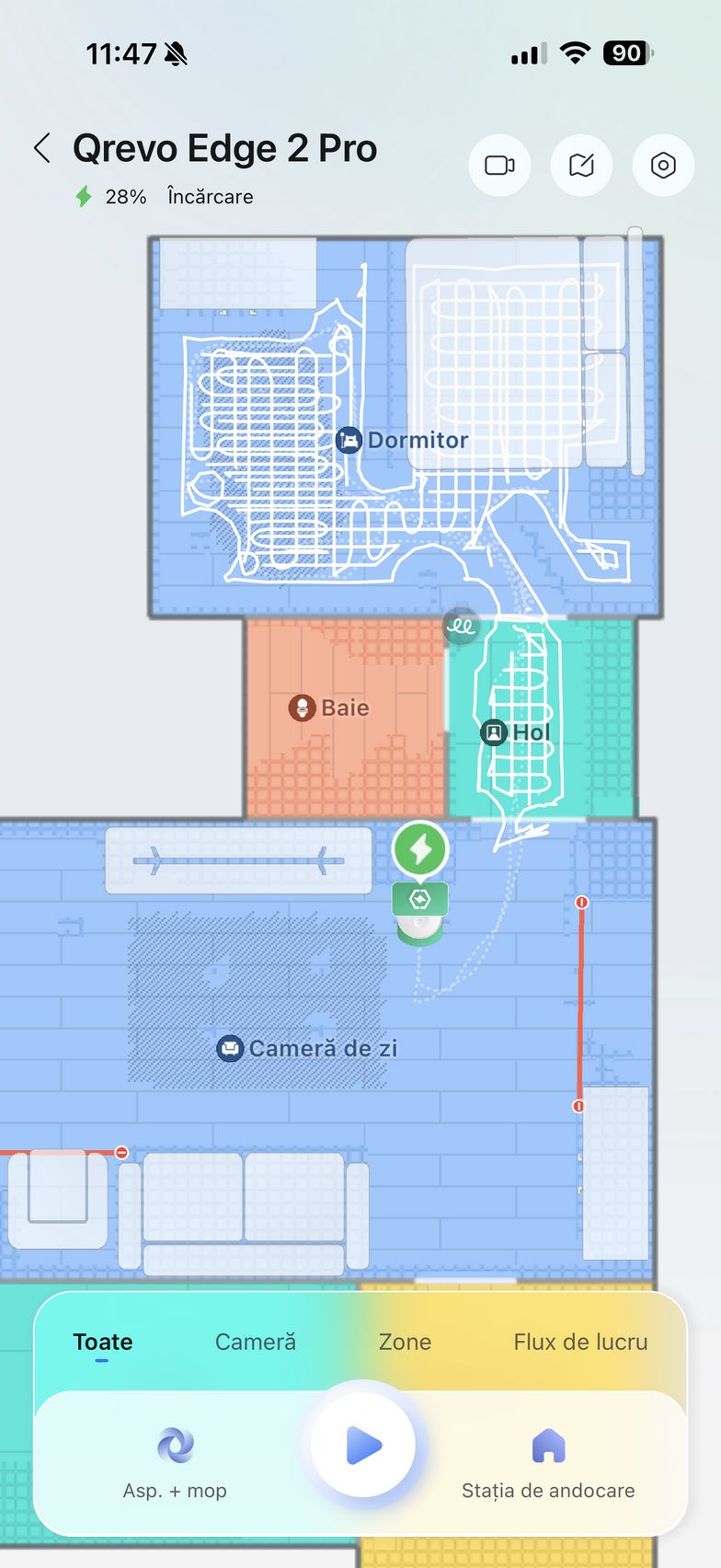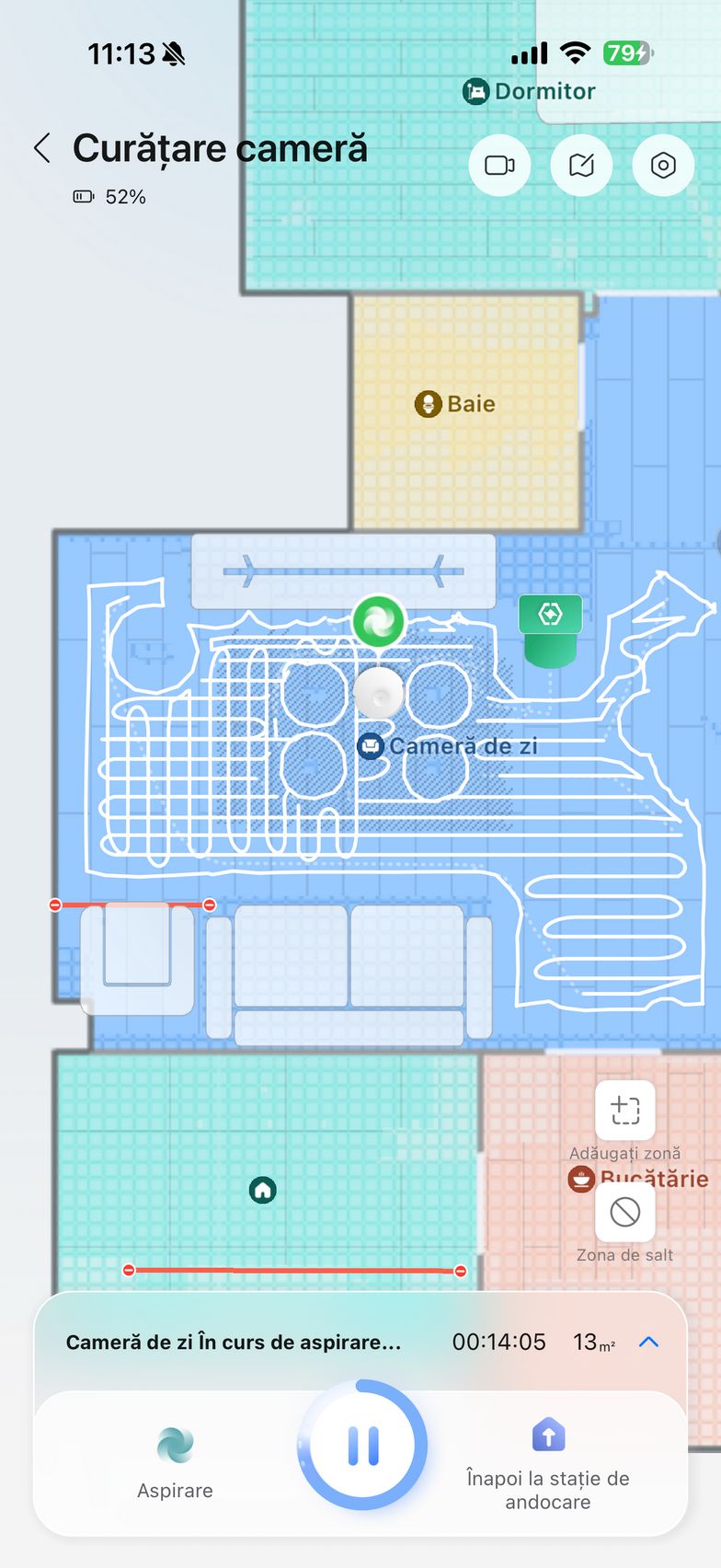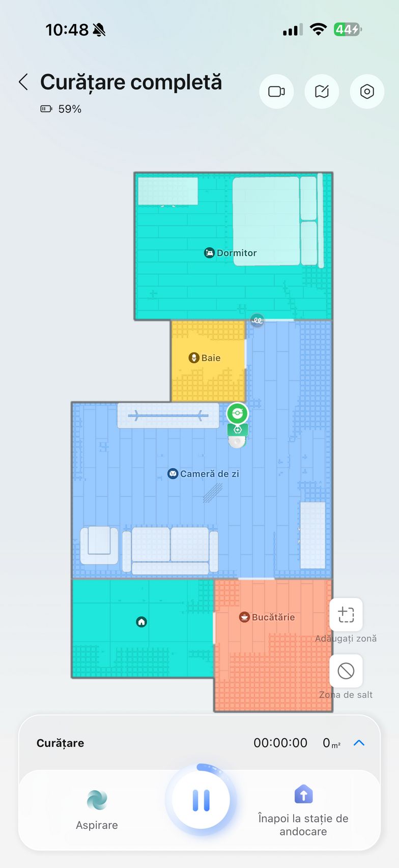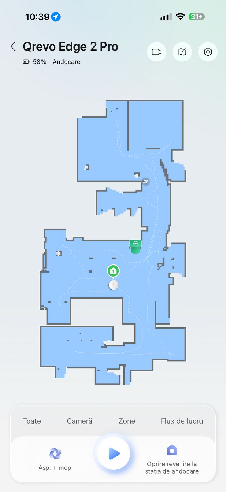 Ca interfață aplicația îmi e foarte familiară după atâtea aspiratoare Roborock testate. Vezi harta în pagina principală, jos ai opțiunile de curățare - Toate, Cameră, Zone și Flux de Lucru, iar mai jos sunt butoanele tipului de curățare. Poți alege Aspiră apoi spală, Aspirare + Mop, Mop, Aspirare sau opta pentru AI Smart Plan care personalizează un plan optim de curățare.