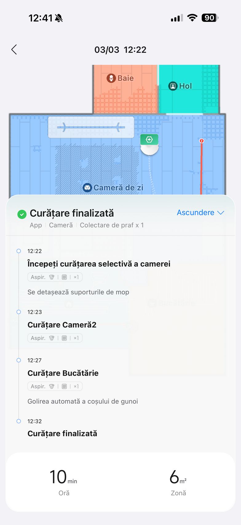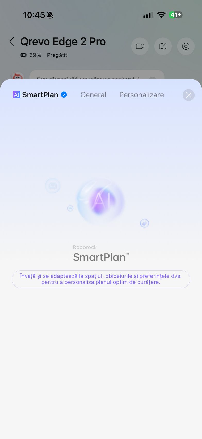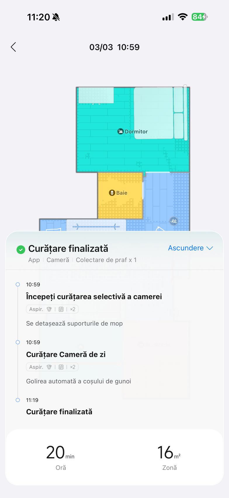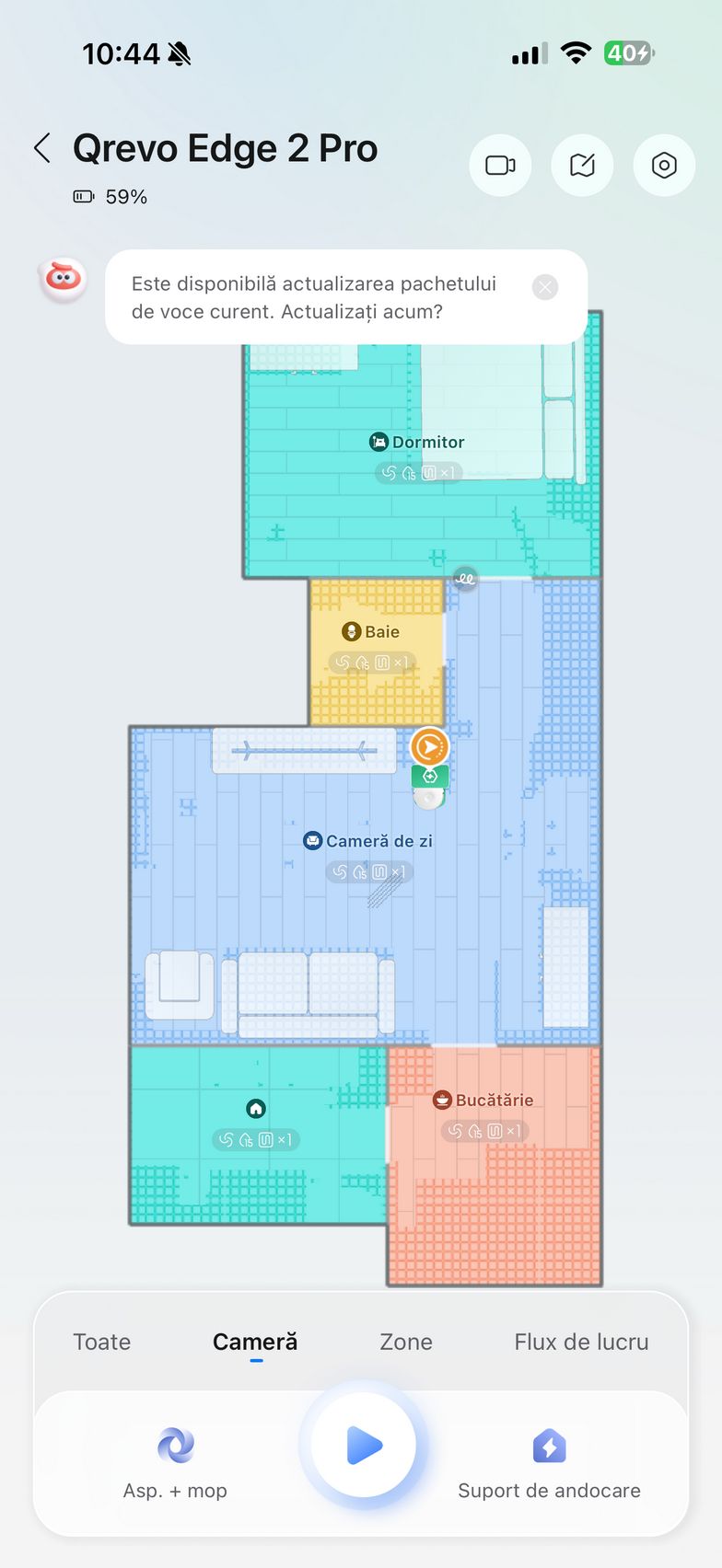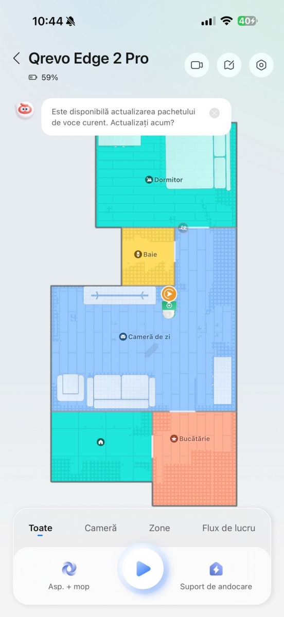 Ca interfață aplicația îmi e foarte familiară după atâtea aspiratoare Roborock testate. Vezi harta în pagina principală, jos ai opțiunile de curățare - Toate, Cameră, Zone și Flux de Lucru, iar mai jos sunt butoanele tipului de curățare. Poți alege Aspiră apoi spală, Aspirare + Mop, Mop, Aspirare sau opta pentru AI Smart Plan care personalizează un plan optim de curățare.