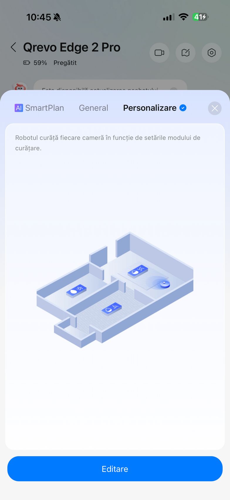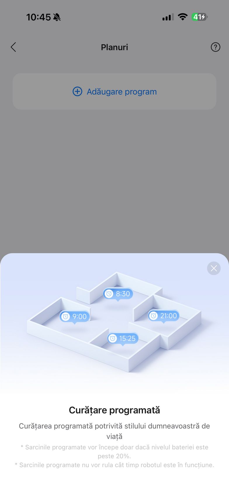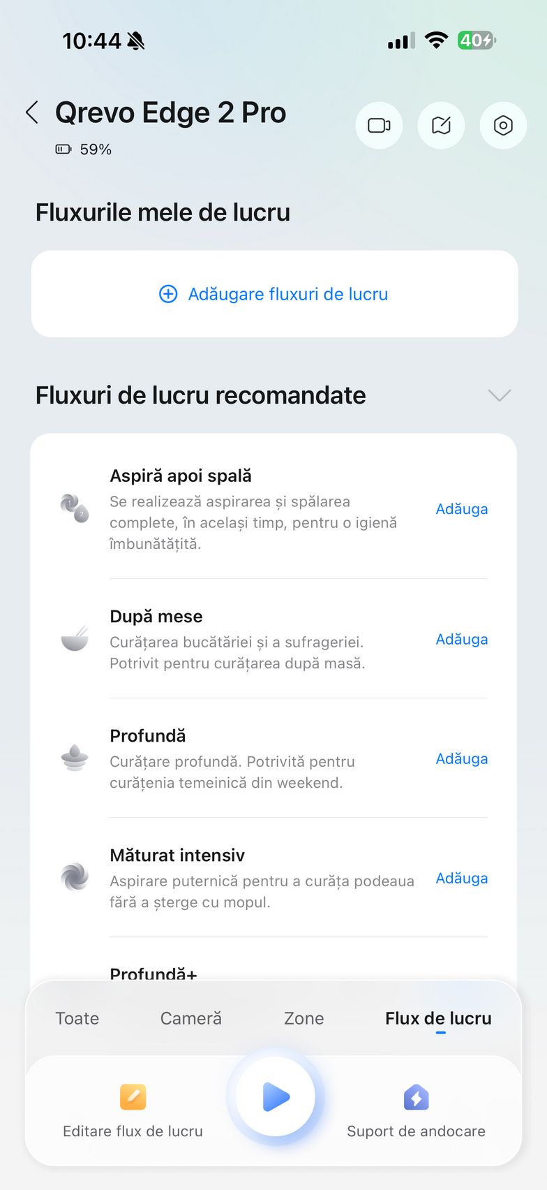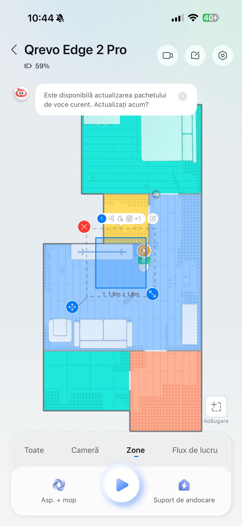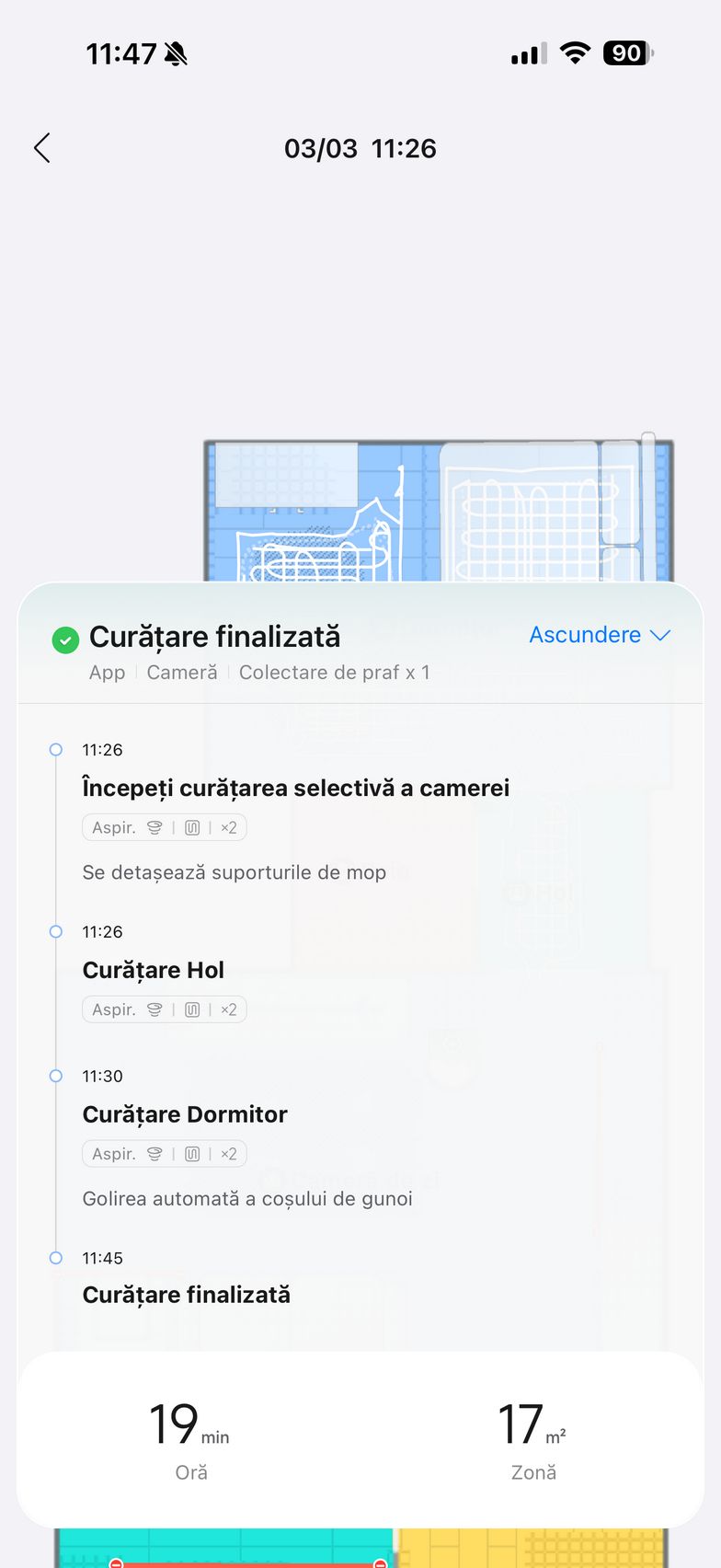 Ca interfață aplicația îmi e foarte familiară după atâtea aspiratoare Roborock testate. Vezi harta în pagina principală, jos ai opțiunile de curățare - Toate, Cameră, Zone și Flux de Lucru, iar mai jos sunt butoanele tipului de curățare. Poți alege Aspiră apoi spală, Aspirare + Mop, Mop, Aspirare sau opta pentru AI Smart Plan care personalizează un plan optim de curățare.