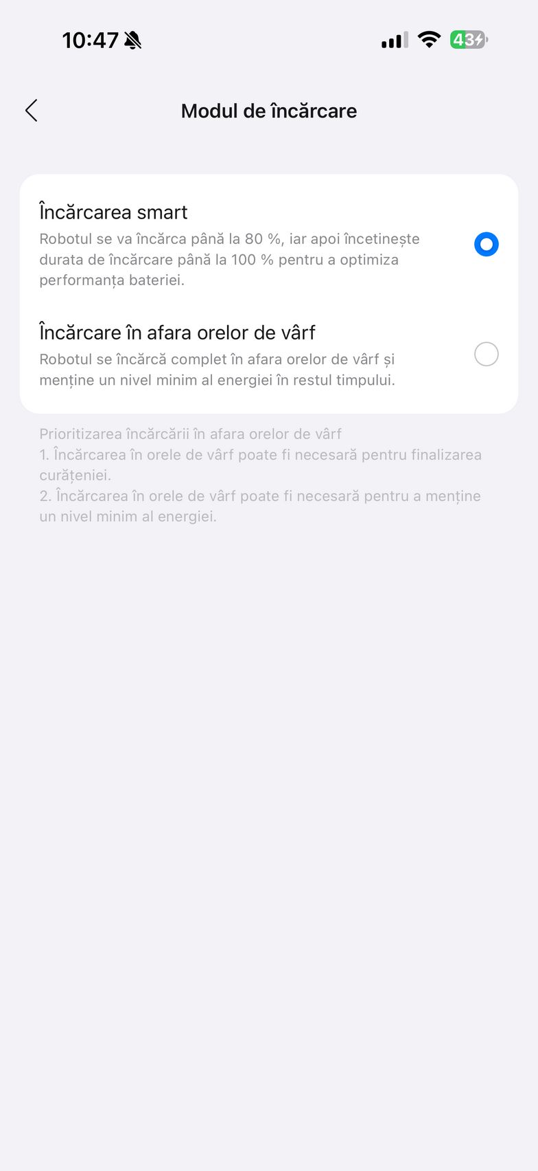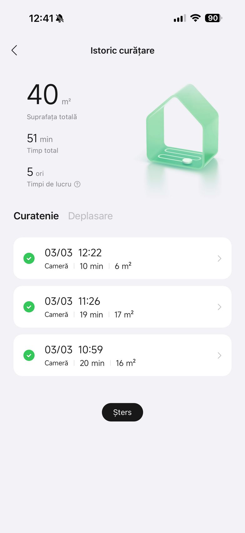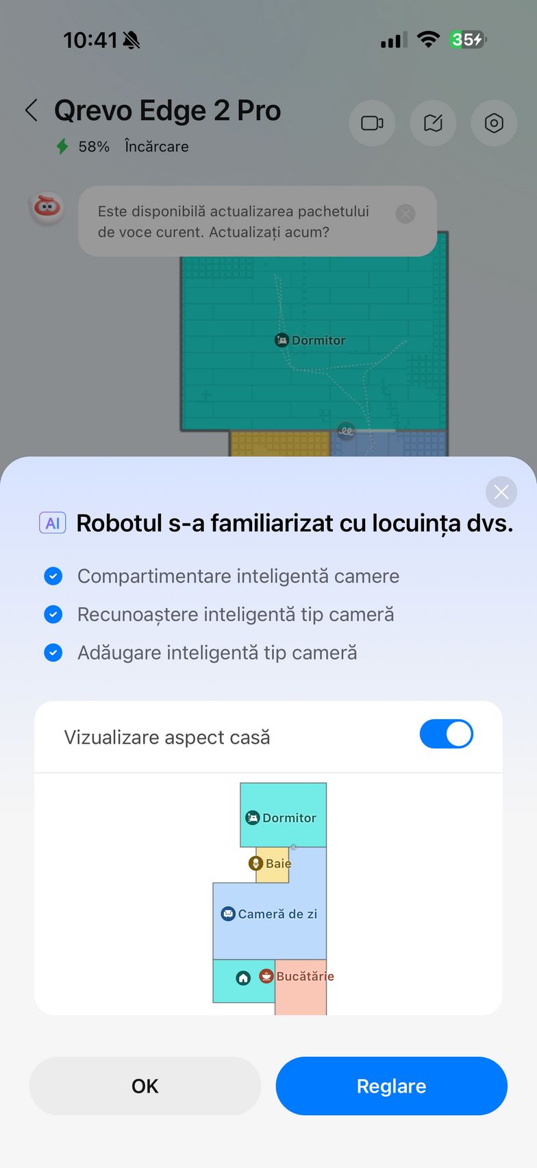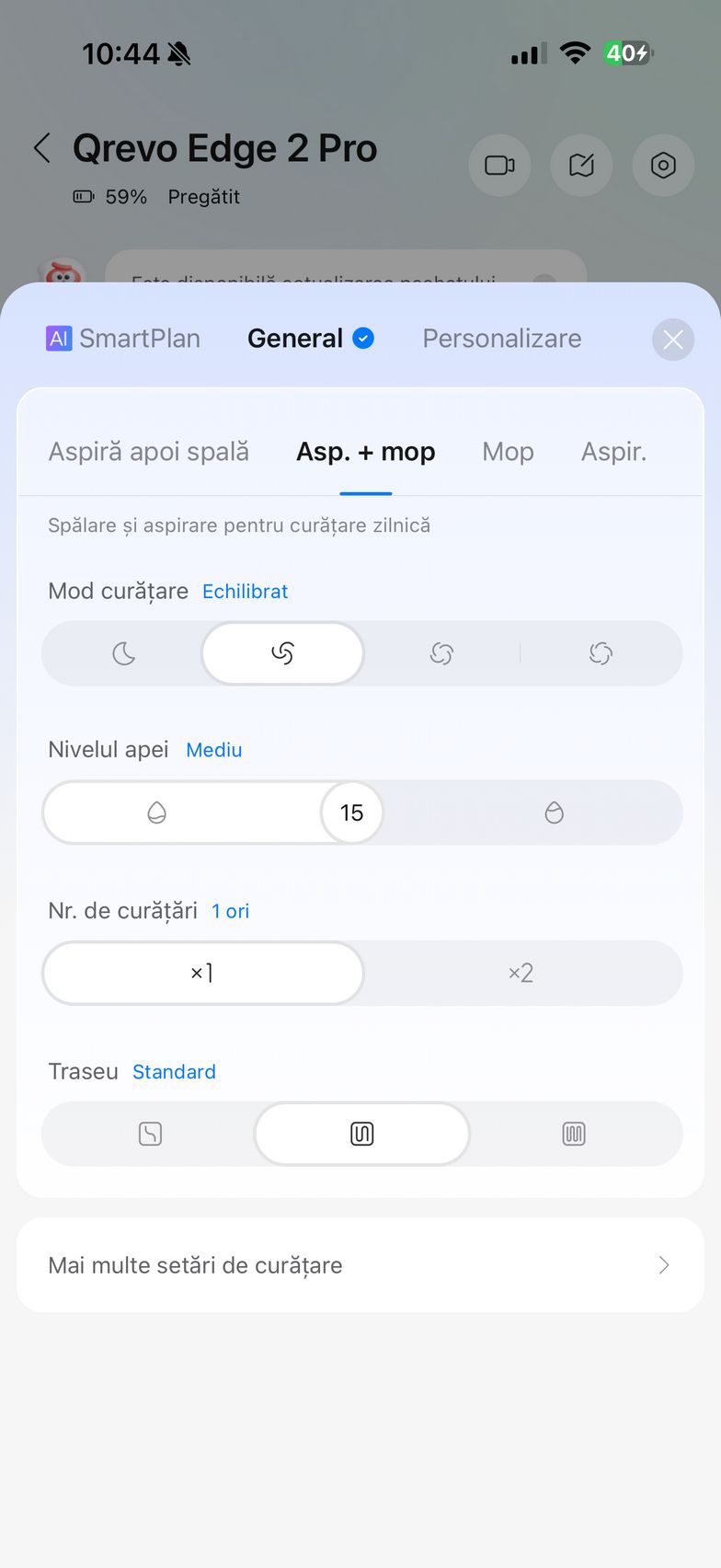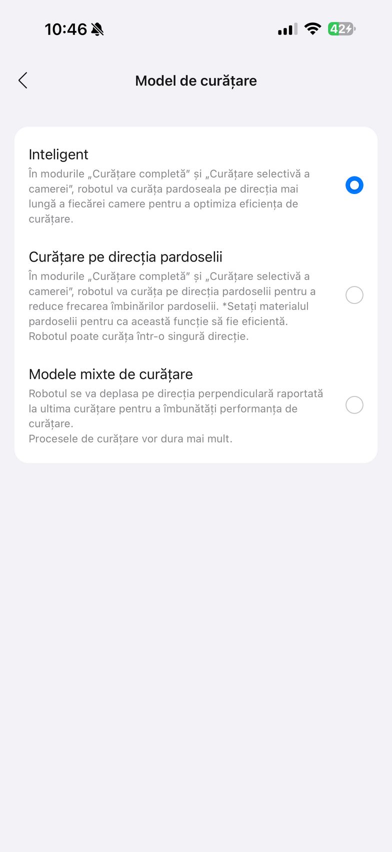 Ca interfață aplicația îmi e foarte familiară după atâtea aspiratoare Roborock testate. Vezi harta în pagina principală, jos ai opțiunile de curățare - Toate, Cameră, Zone și Flux de Lucru, iar mai jos sunt butoanele tipului de curățare. Poți alege Aspiră apoi spală, Aspirare + Mop, Mop, Aspirare sau opta pentru AI Smart Plan care personalizează un plan optim de curățare.