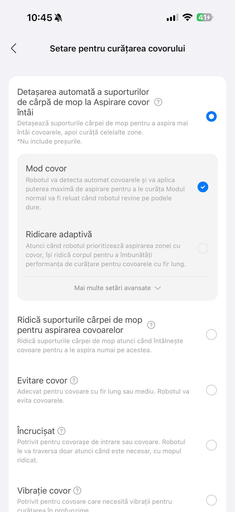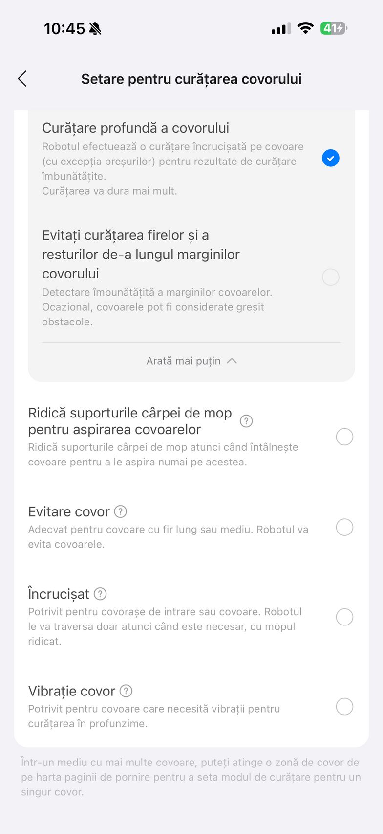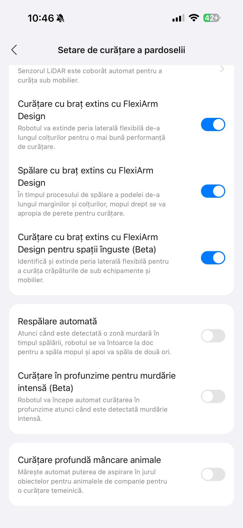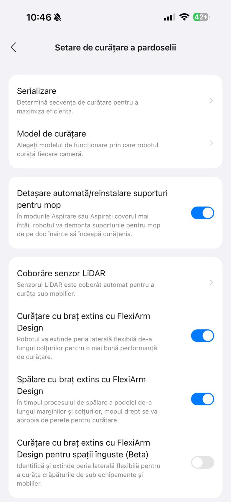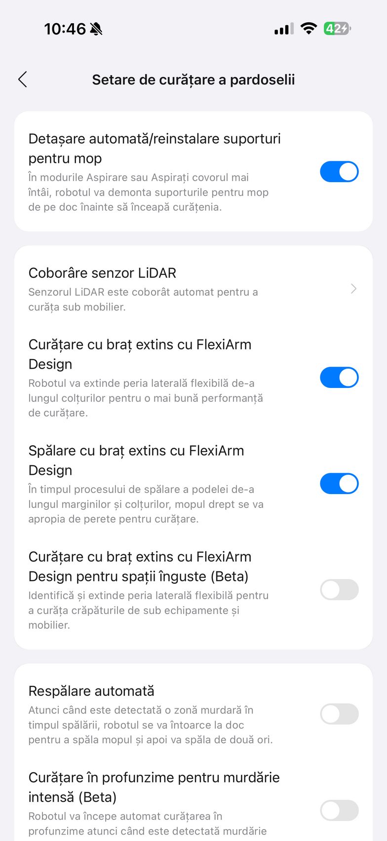Pentru că tot am vorbit de covoare, în setări am găsit și opțiuni pentru tipul de covor din casa mea. Sunt opțiuni pentru covoare cu fir mediu și lung (lungime fir de la 15 mm la 30 mm), covoare cu fir scurt (lungime fir mai mică de 15mm). La aspirare, sunt modurile de putere - Silențios, Echilibrat, Turbo, Max, Max+, număr de curățări (x1, x2) și traseu (puternic, standard, intens). Apropo, apare și o perie laterală FlexiArm care se extinde pentru a duce praful de sub mobilier spre gura de aspirare.