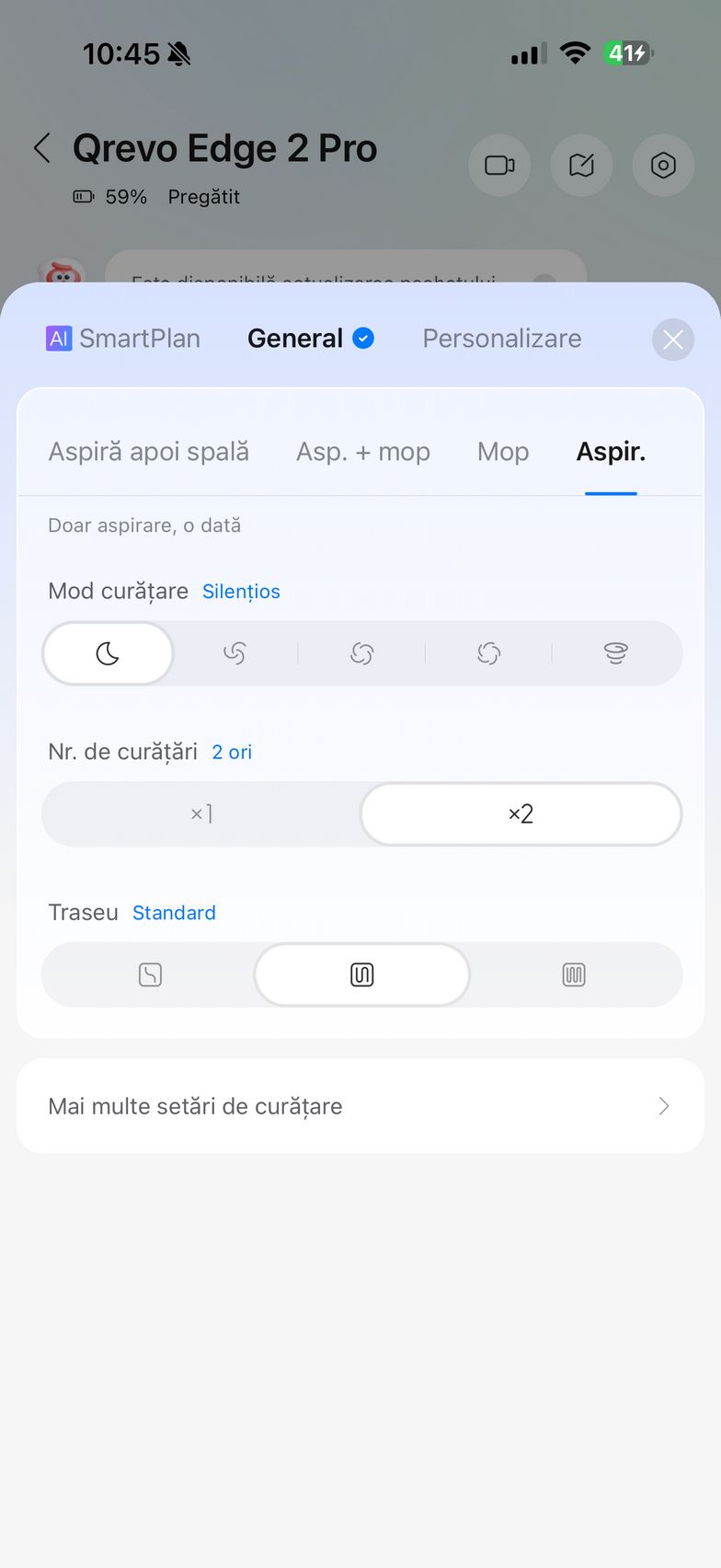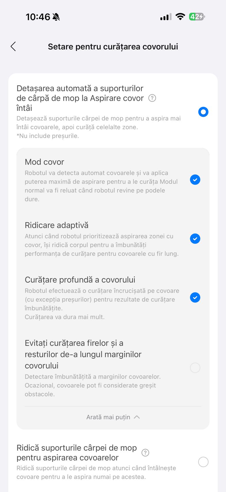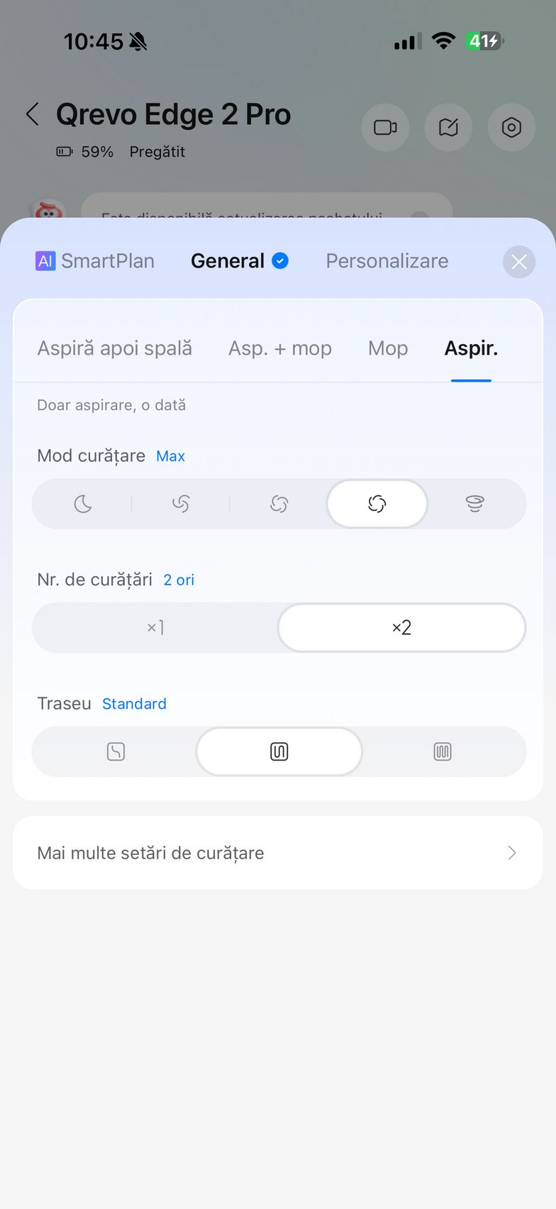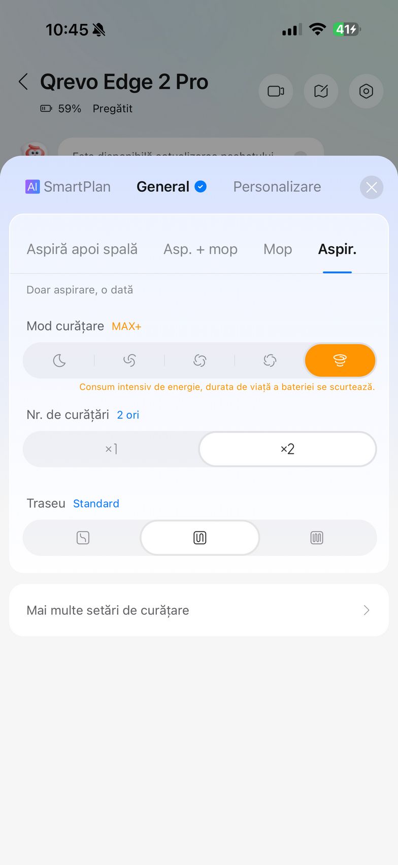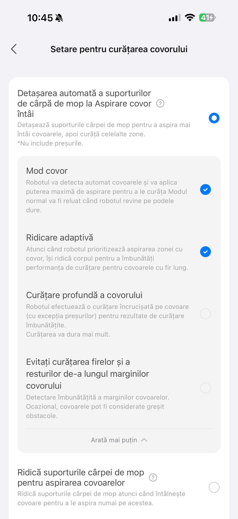 Pentru că tot am vorbit de covoare, în setări am găsit și opțiuni pentru tipul de covor din casa mea. Sunt opțiuni pentru covoare cu fir mediu și lung (lungime fir de la 15 mm la 30 mm), covoare cu fir scurt (lungime fir mai mică de 15mm). La aspirare, sunt modurile de putere - Silențios, Echilibrat, Turbo, Max, Max+, număr de curățări (x1, x2) și traseu (puternic, standard, intens). Apropo, apare și o perie laterală FlexiArm care se extinde pentru a duce praful de sub mobilier spre gura de aspirare.