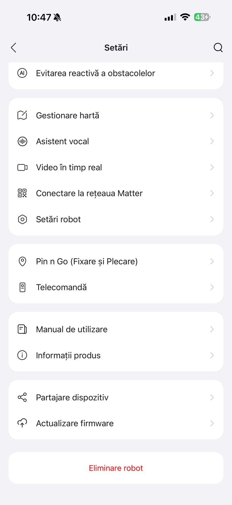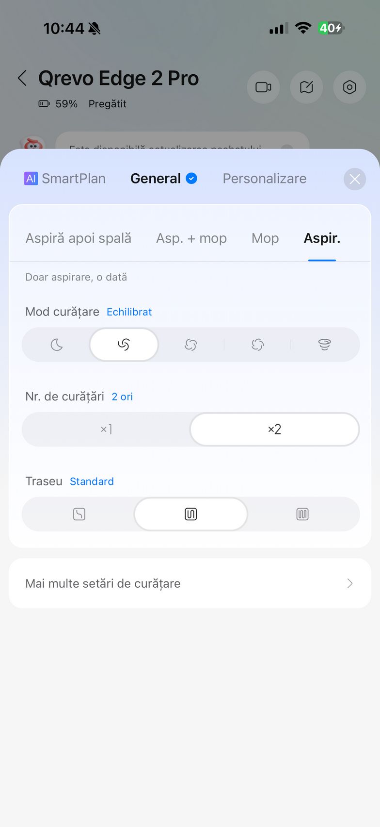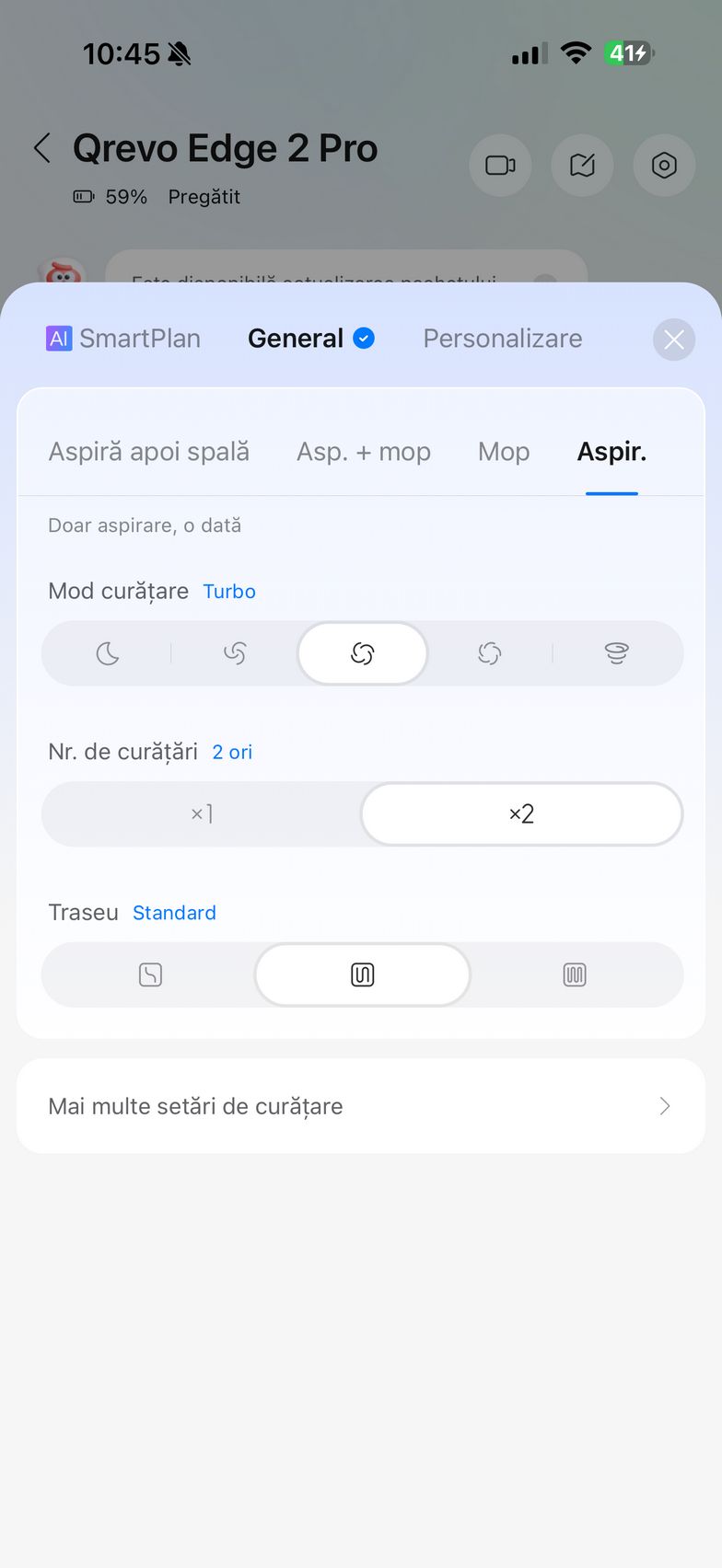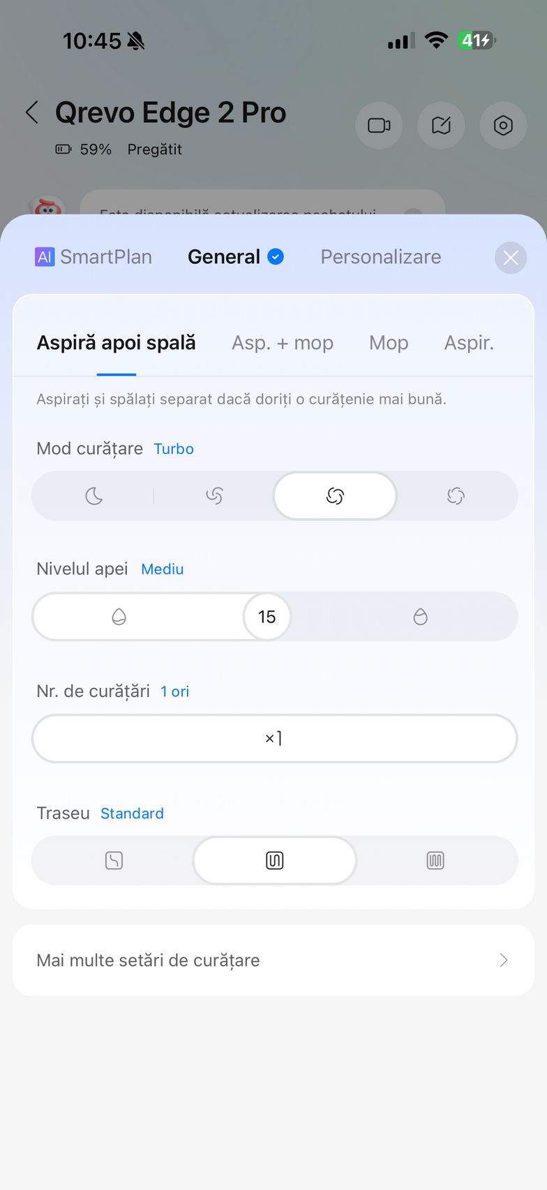 Pentru că tot am vorbit de covoare, în setări am găsit și opțiuni pentru tipul de covor din casa mea. Sunt opțiuni pentru covoare cu fir mediu și lung (lungime fir de la 15 mm la 30 mm), covoare cu fir scurt (lungime fir mai mică de 15mm). La aspirare, sunt modurile de putere - Silențios, Echilibrat, Turbo, Max, Max+, număr de curățări (x1, x2) și traseu (puternic, standard, intens). Apropo, apare și o perie laterală FlexiArm care se extinde pentru a duce praful de sub mobilier spre gura de aspirare.