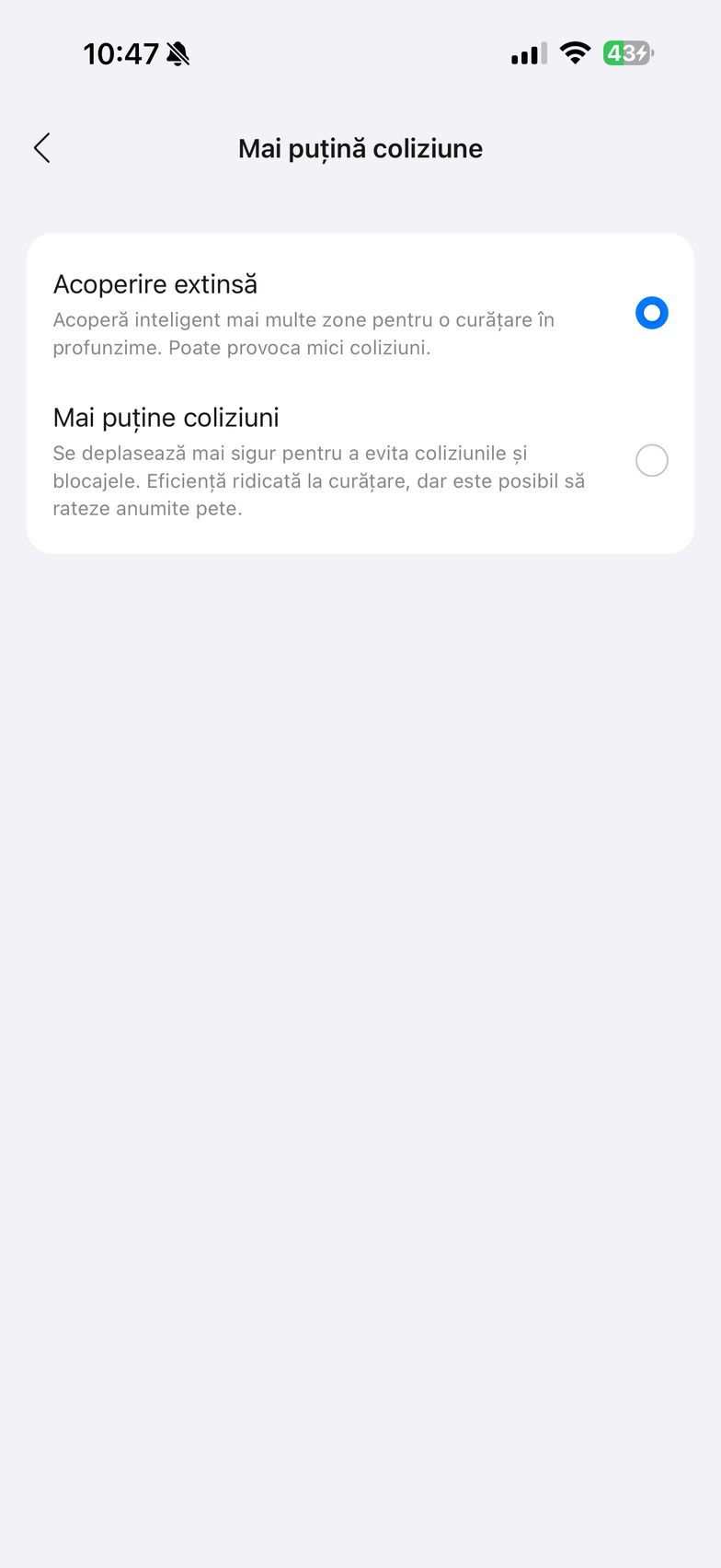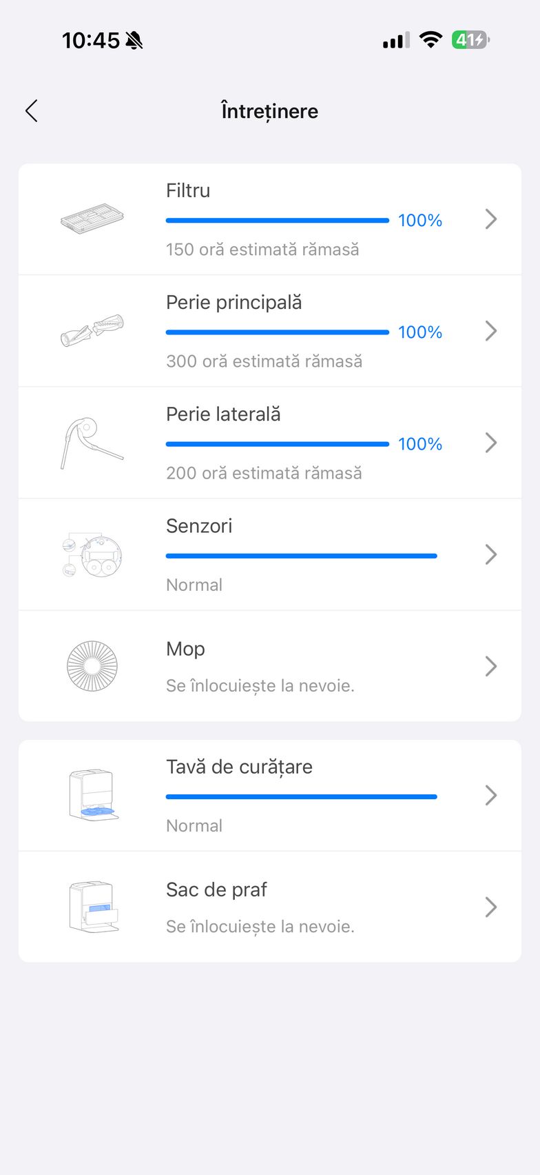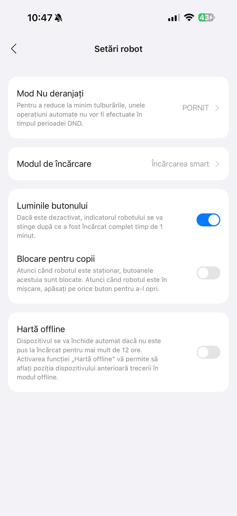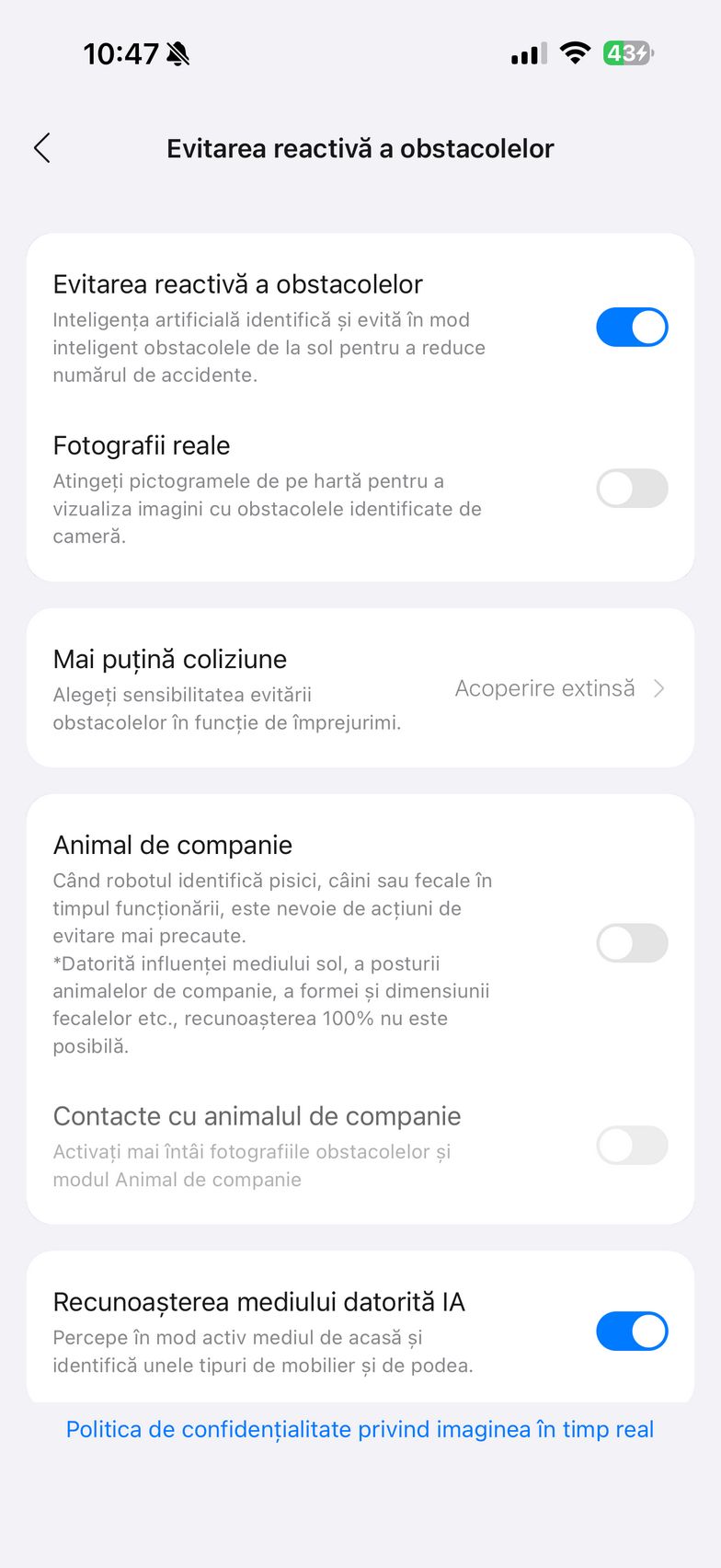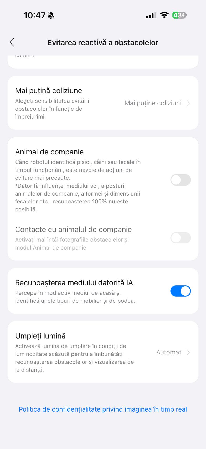 Pentru că tot am vorbit de covoare, în setări am găsit și opțiuni pentru tipul de covor din casa mea. Sunt opțiuni pentru covoare cu fir mediu și lung (lungime fir de la 15 mm la 30 mm), covoare cu fir scurt (lungime fir mai mică de 15mm). La aspirare, sunt modurile de putere - Silențios, Echilibrat, Turbo, Max, Max+, număr de curățări (x1, x2) și traseu (puternic, standard, intens). Apropo, apare și o perie laterală FlexiArm care se extinde pentru a duce praful de sub mobilier spre gura de aspirare.