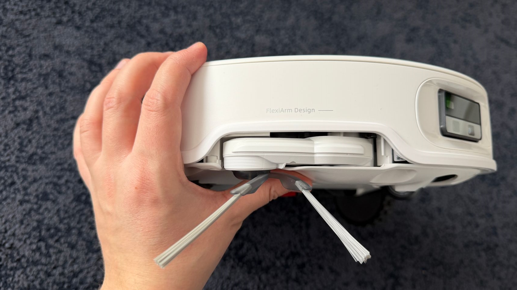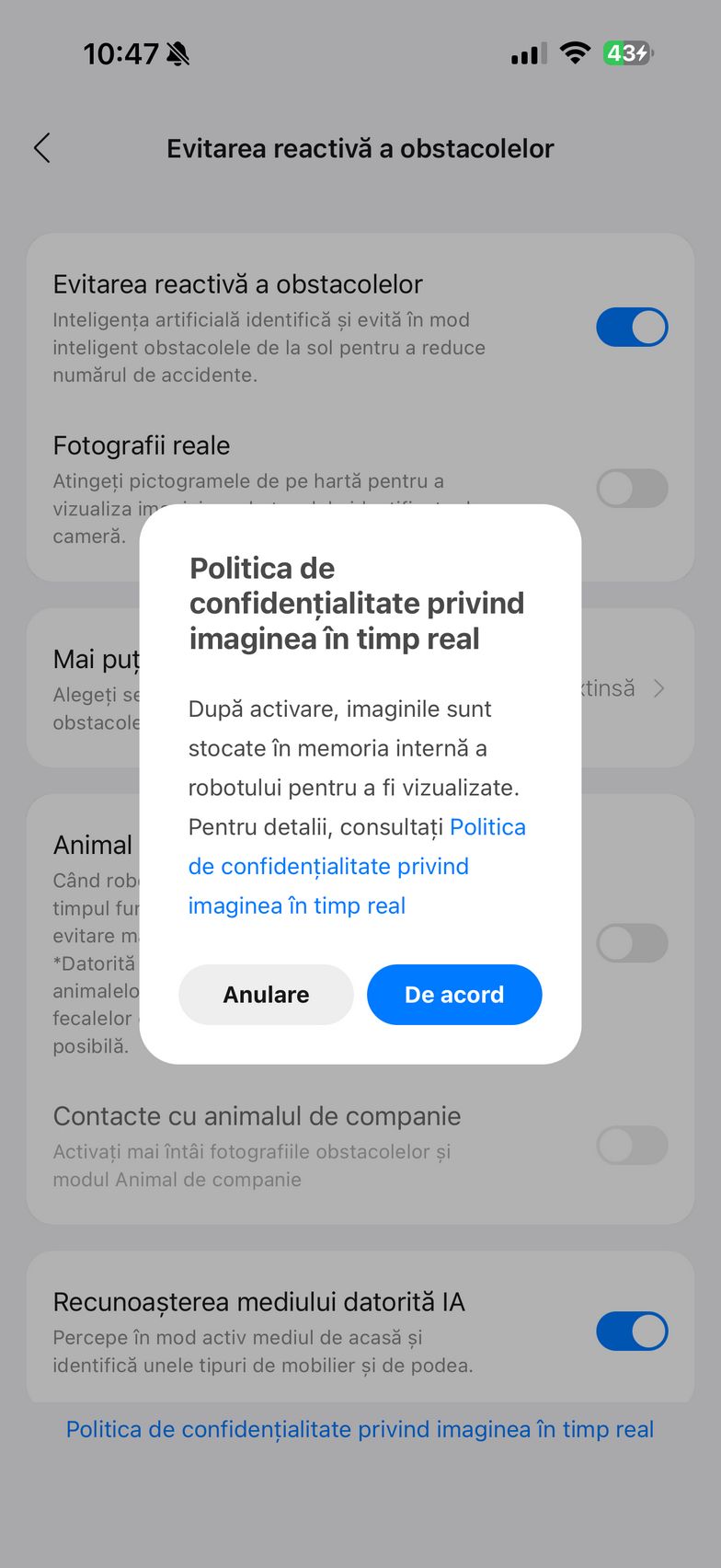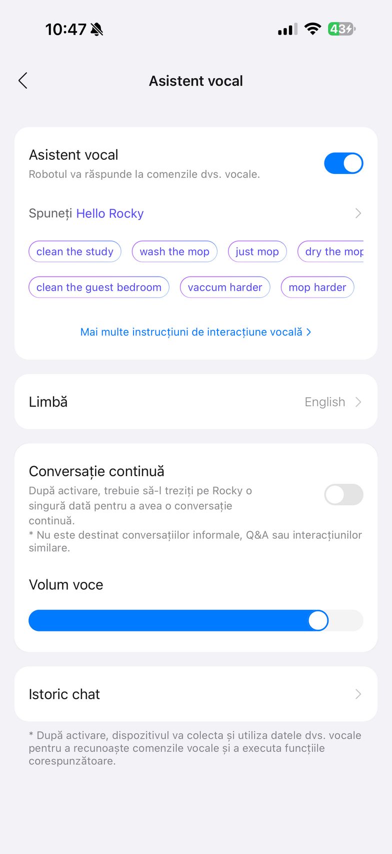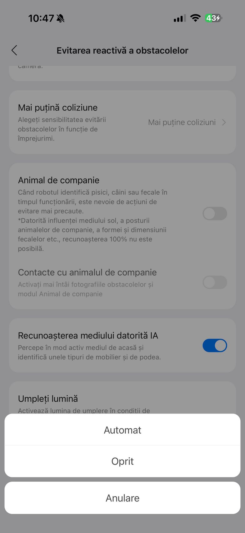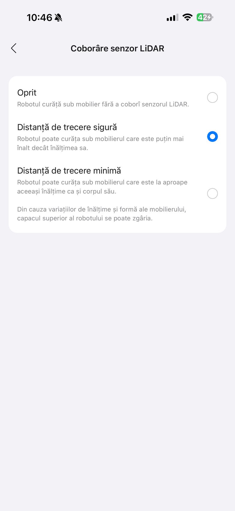 Pentru că tot am vorbit de covoare, în setări am găsit și opțiuni pentru tipul de covor din casa mea. Sunt opțiuni pentru covoare cu fir mediu și lung (lungime fir de la 15 mm la 30 mm), covoare cu fir scurt (lungime fir mai mică de 15mm). La aspirare, sunt modurile de putere - Silențios, Echilibrat, Turbo, Max, Max+, număr de curățări (x1, x2) și traseu (puternic, standard, intens). Apropo, apare și o perie laterală FlexiArm care se extinde pentru a duce praful de sub mobilier spre gura de aspirare.