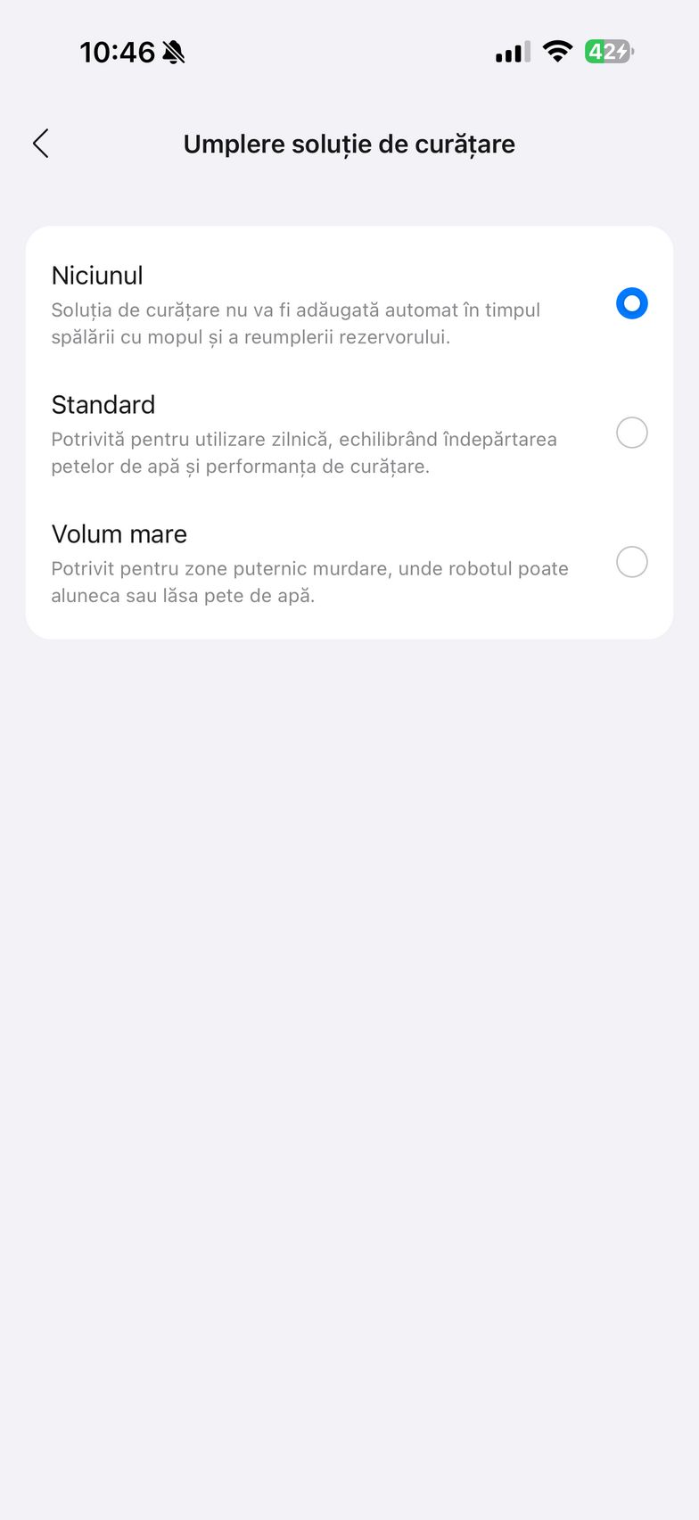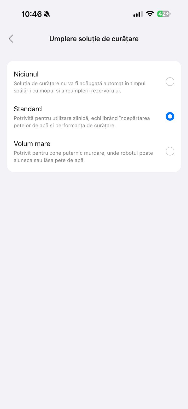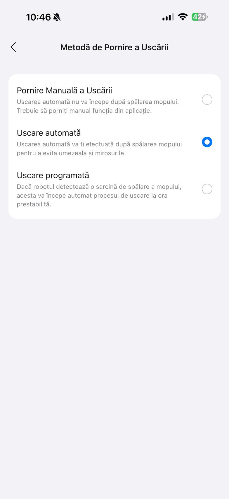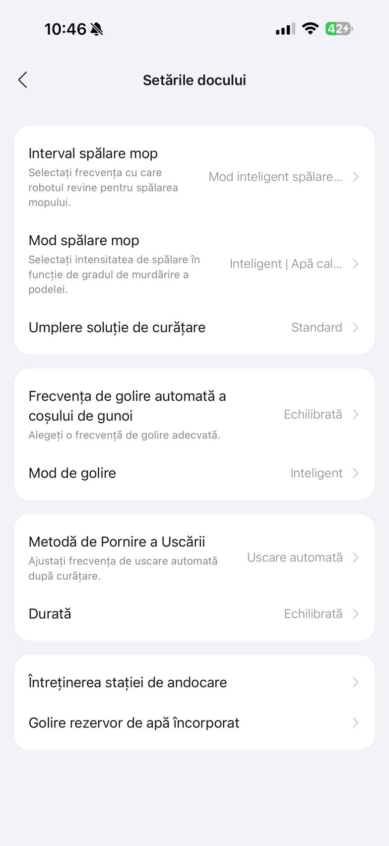 Revin la pagina principală pentru a vorbi și despre butonul Stația de andocare cu opțiuni pentru golirea rezervorului de praf, spălare mop și uscare. Sunt și setările sale asociate aici.