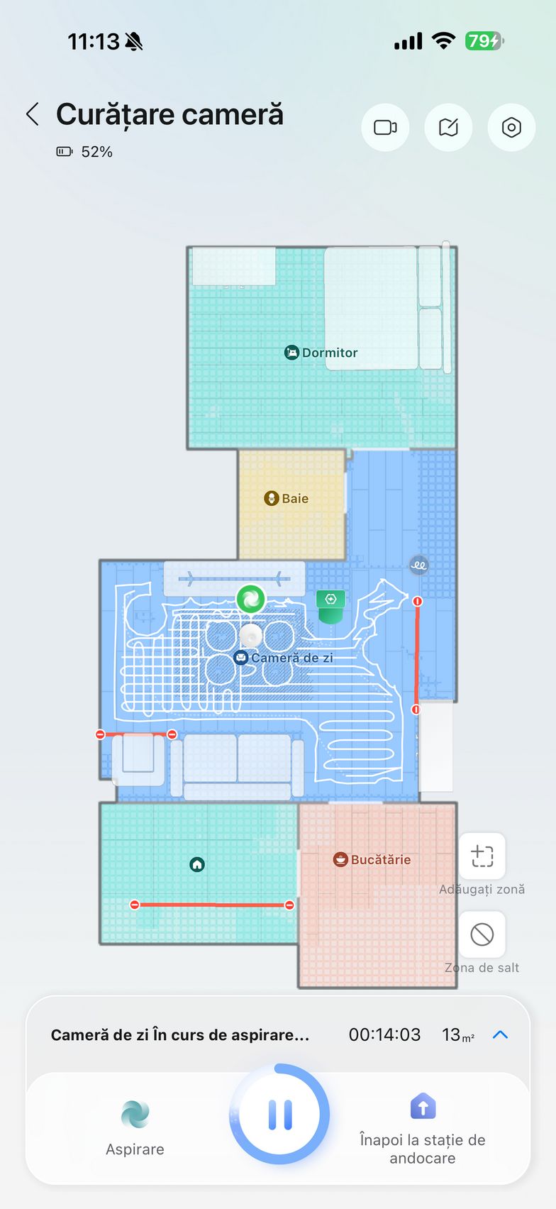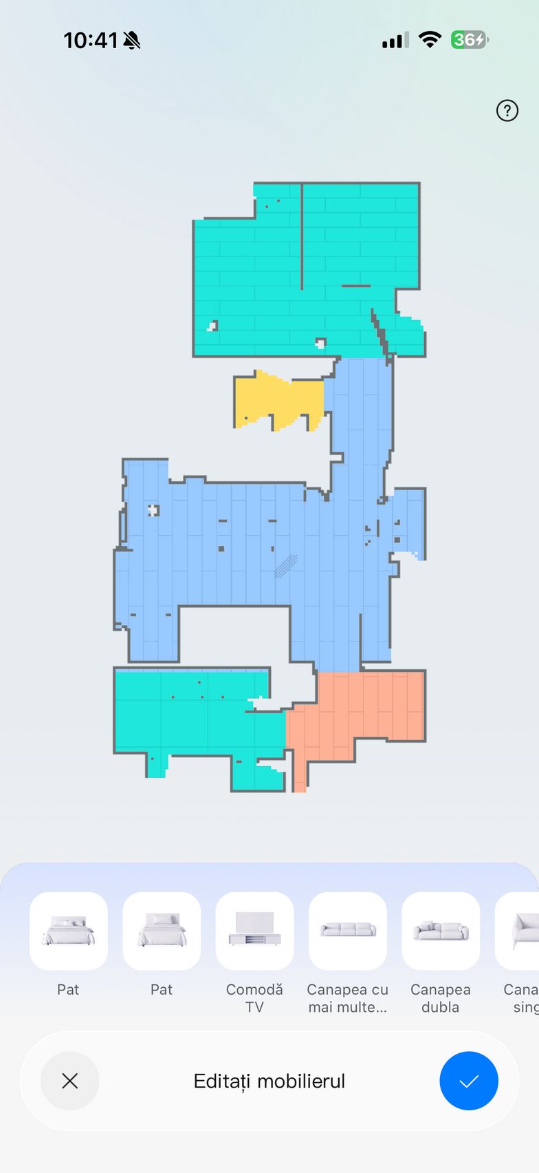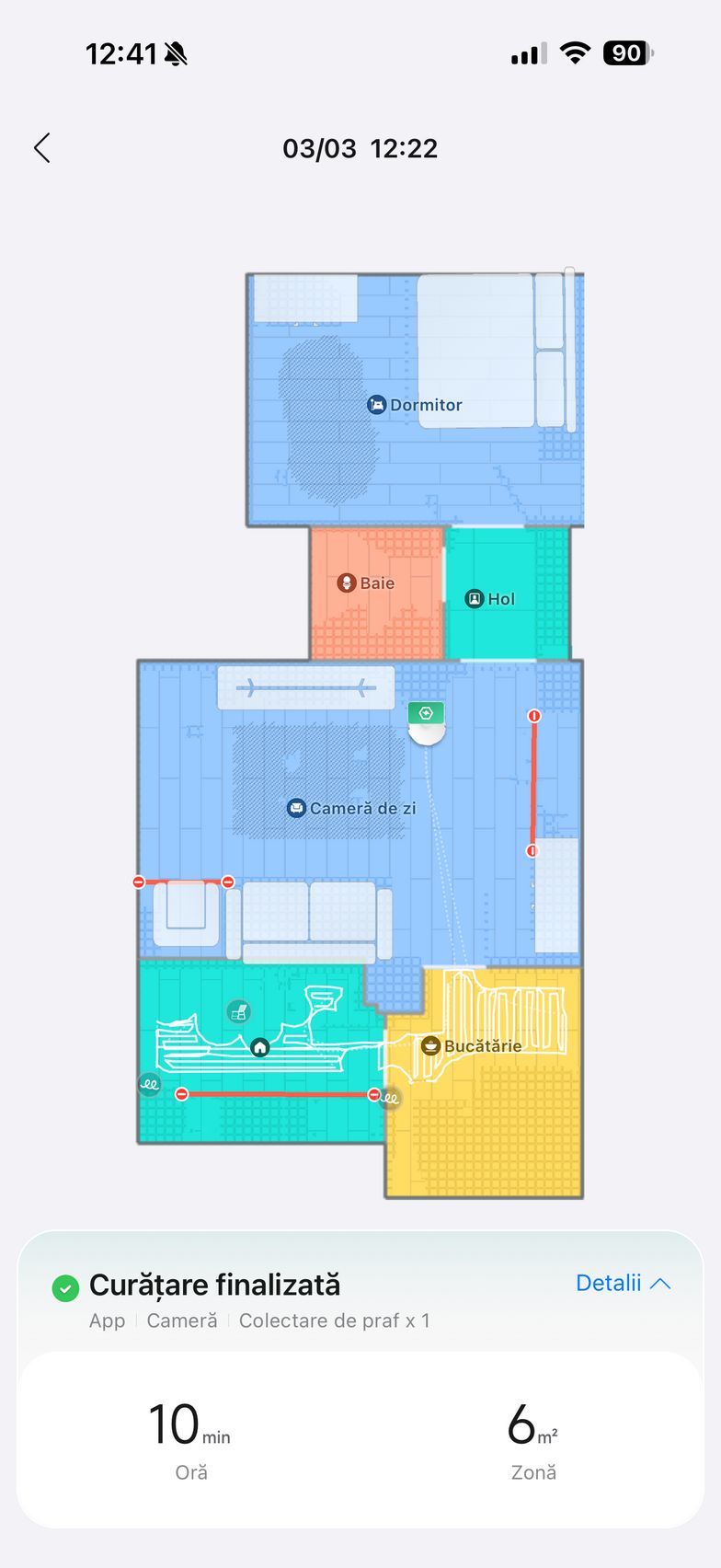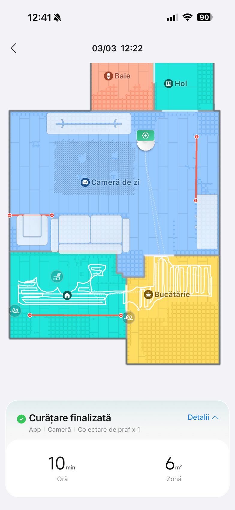 A urmat o cartografiere rapidă care nu cred că a durat mai mult de 10 minute și la acest pas am urmat indicațiile Roborock de a deschide larg ușile, ridica obiectele de pe podea, cablurile și toate cele pentru această primă tură de casă. M-am ales cu o hartă detaliată, camere împărțite și eu apoi doar am adăugat obiectele de mobilier în locurile fixate, plus zone no-go precum sub birou unde am foarte multe cabluri ce atârnă, cât și sub dulapurile din bucătărie unde la fel e risc mare de încurcare.