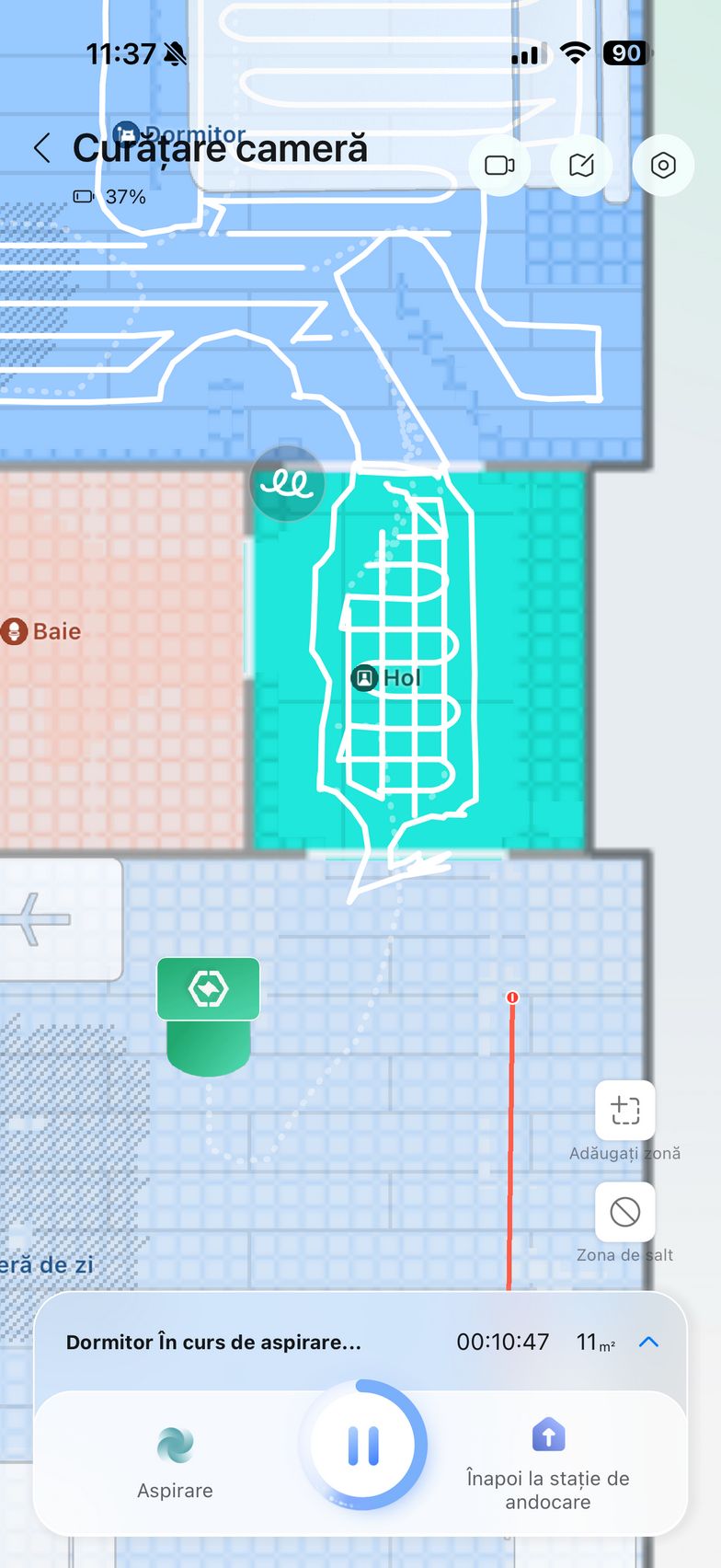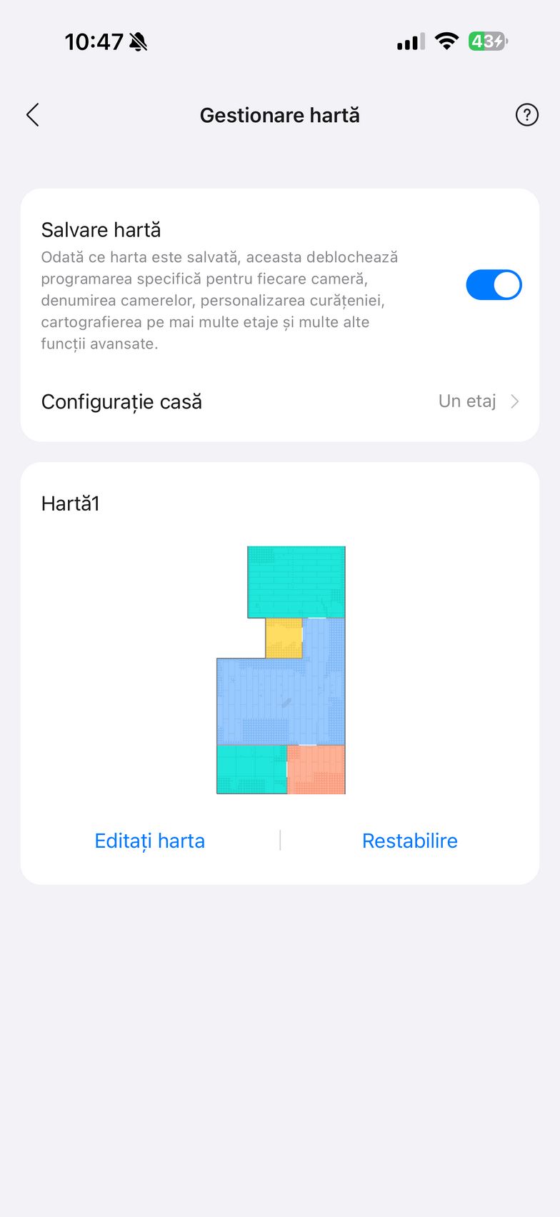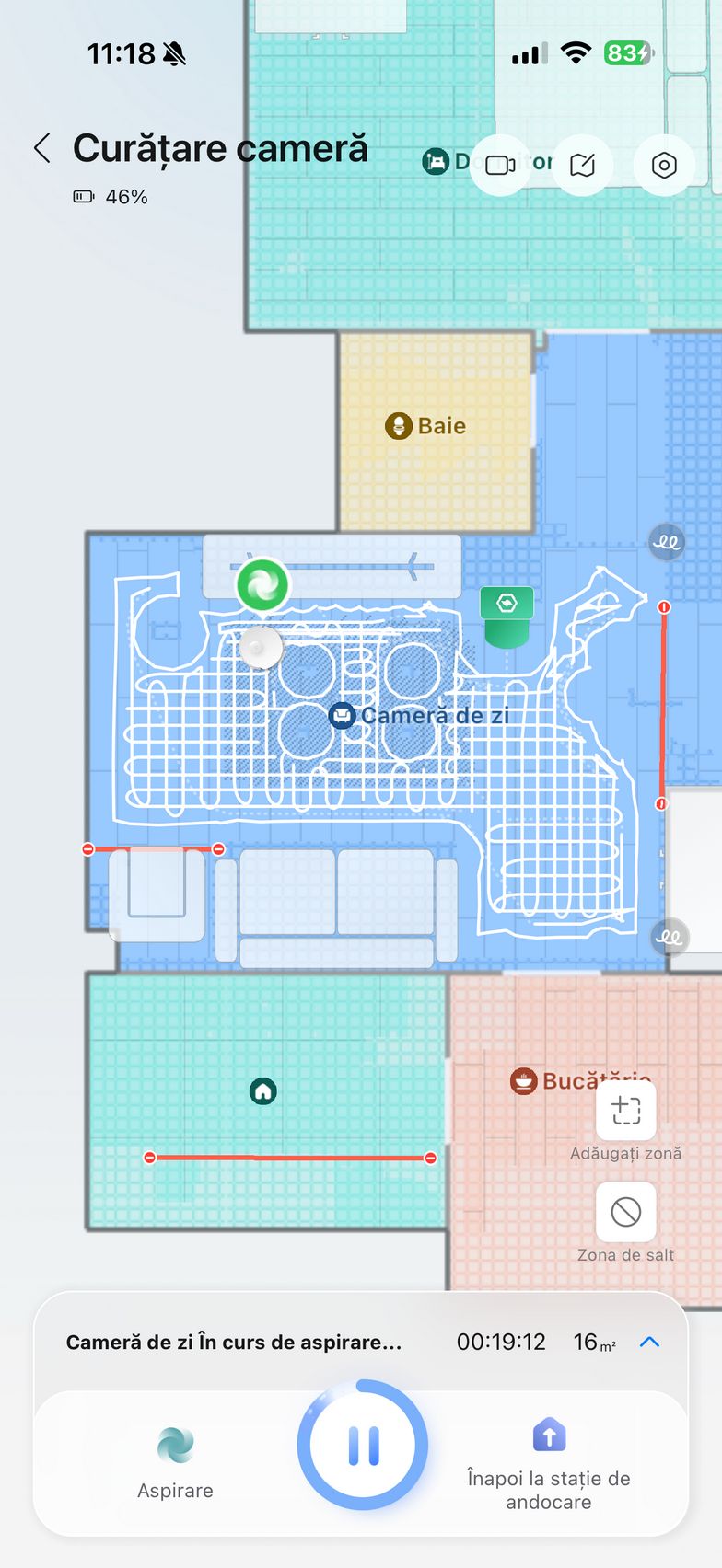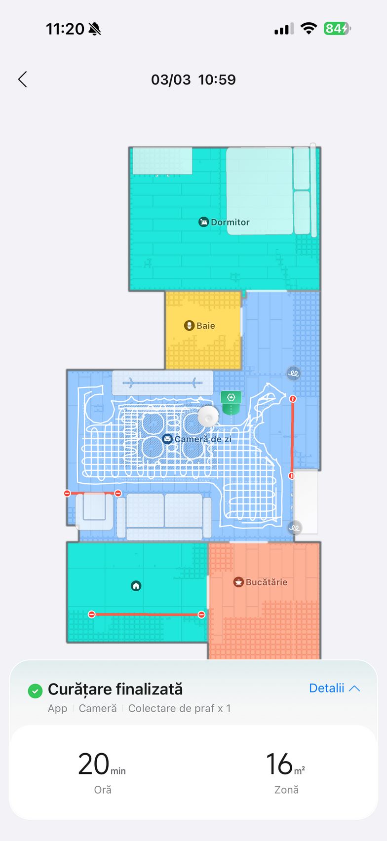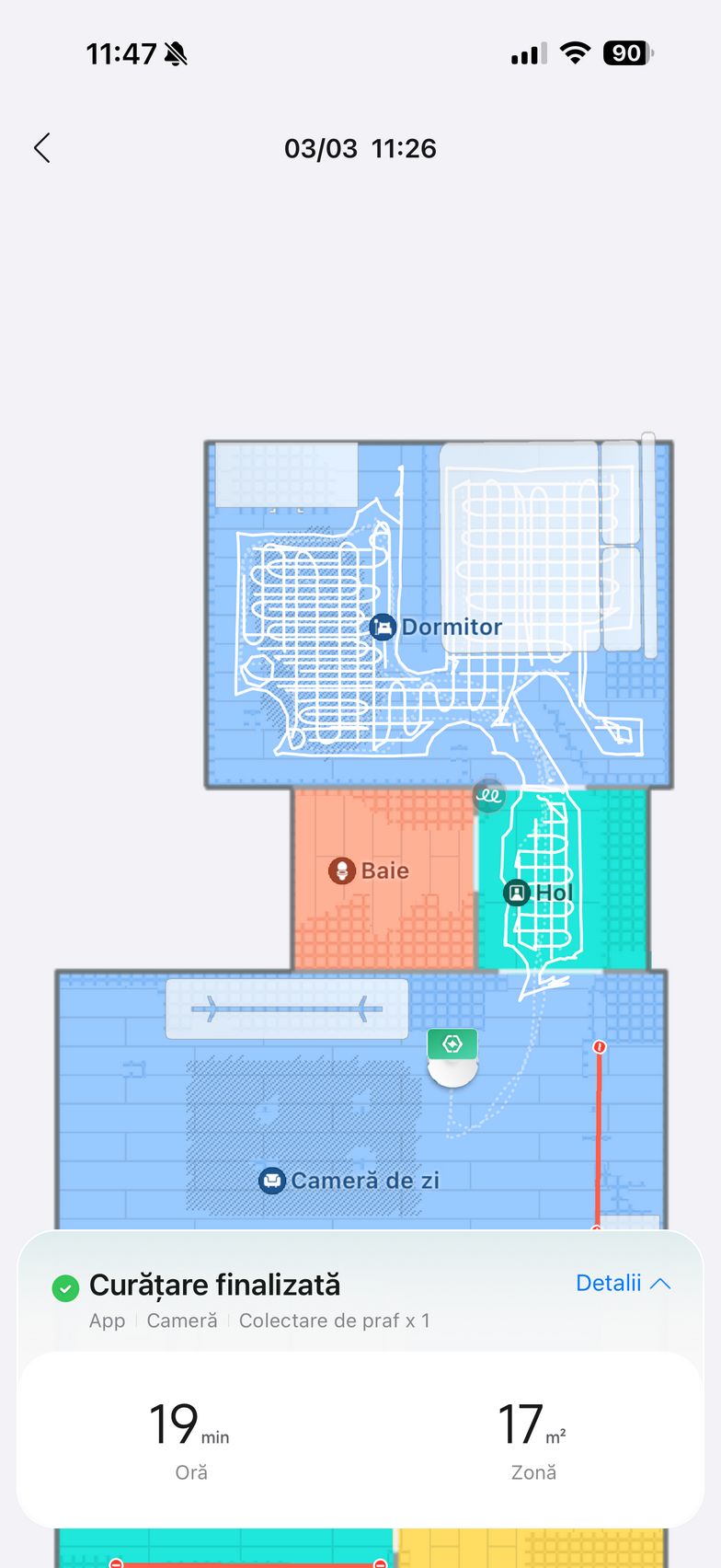 A urmat o cartografiere rapidă care nu cred că a durat mai mult de 10 minute și la acest pas am urmat indicațiile Roborock de a deschide larg ușile, ridica obiectele de pe podea, cablurile și toate cele pentru această primă tură de casă. M-am ales cu o hartă detaliată, camere împărțite și eu apoi doar am adăugat obiectele de mobilier în locurile fixate, plus zone no-go precum sub birou unde am foarte multe cabluri ce atârnă, cât și sub dulapurile din bucătărie unde la fel e risc mare de încurcare.