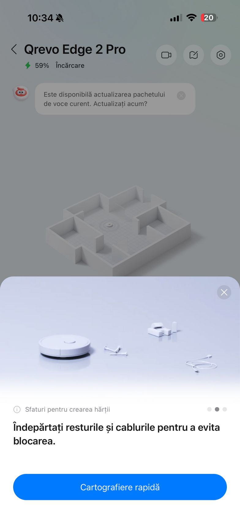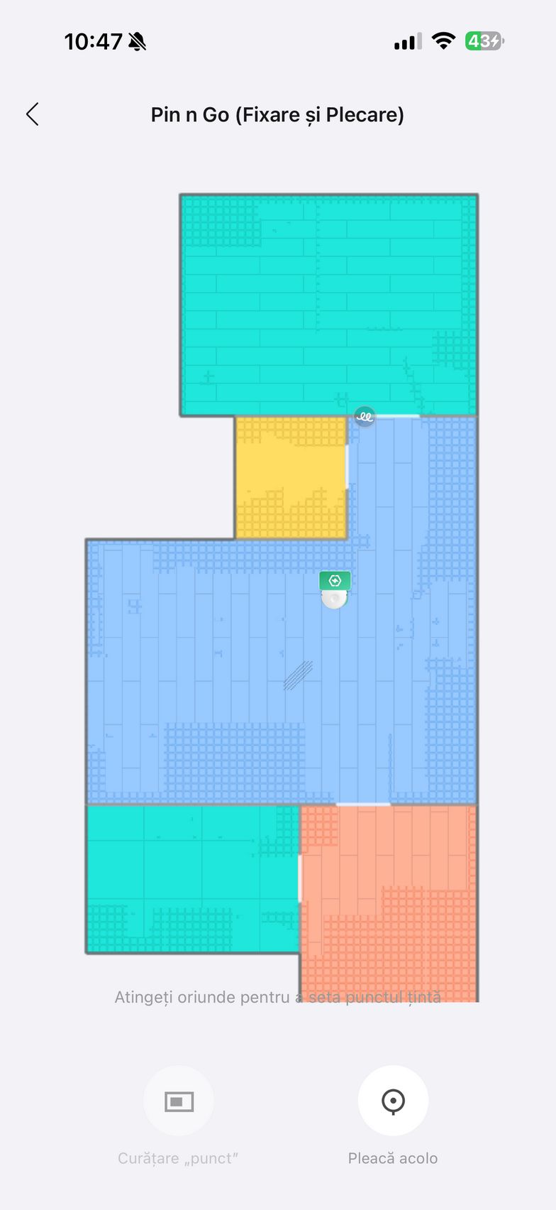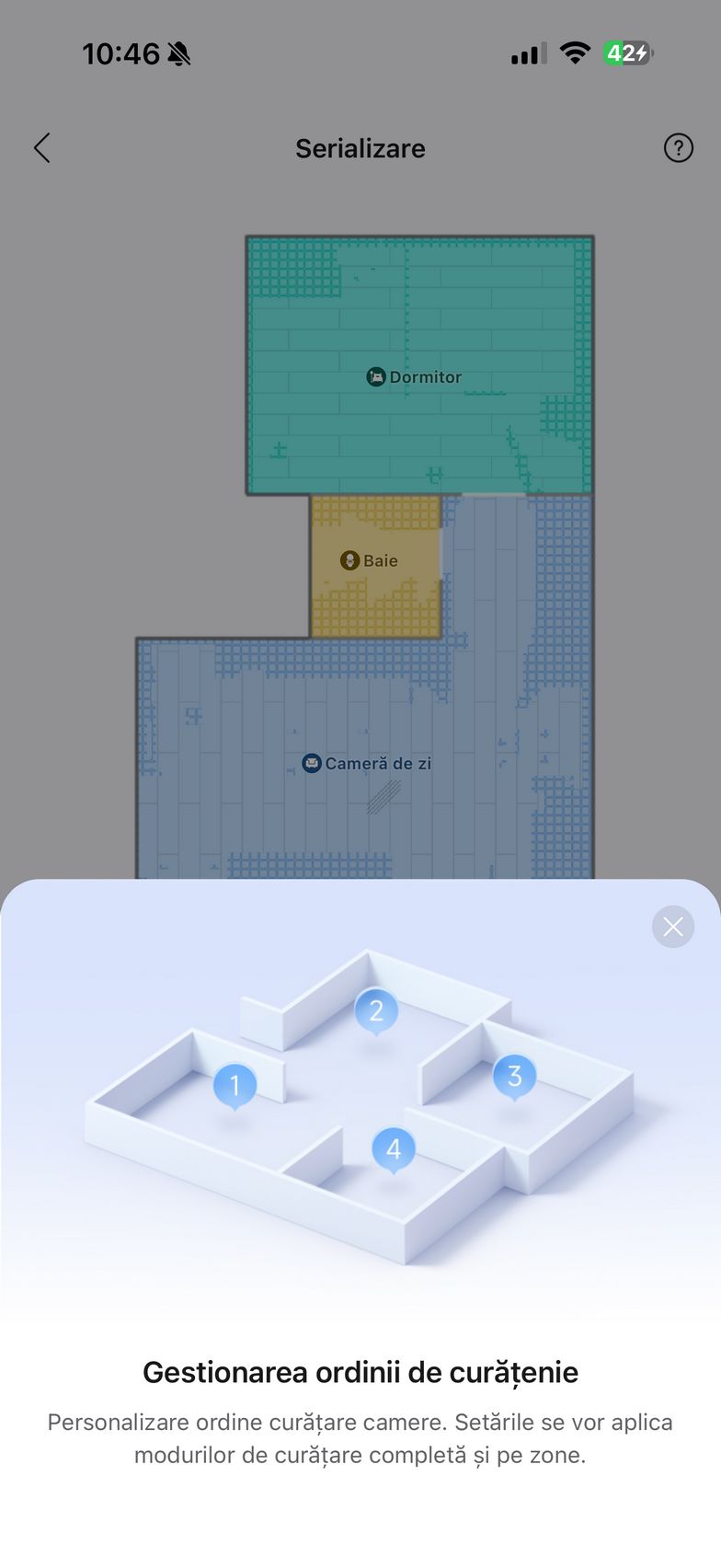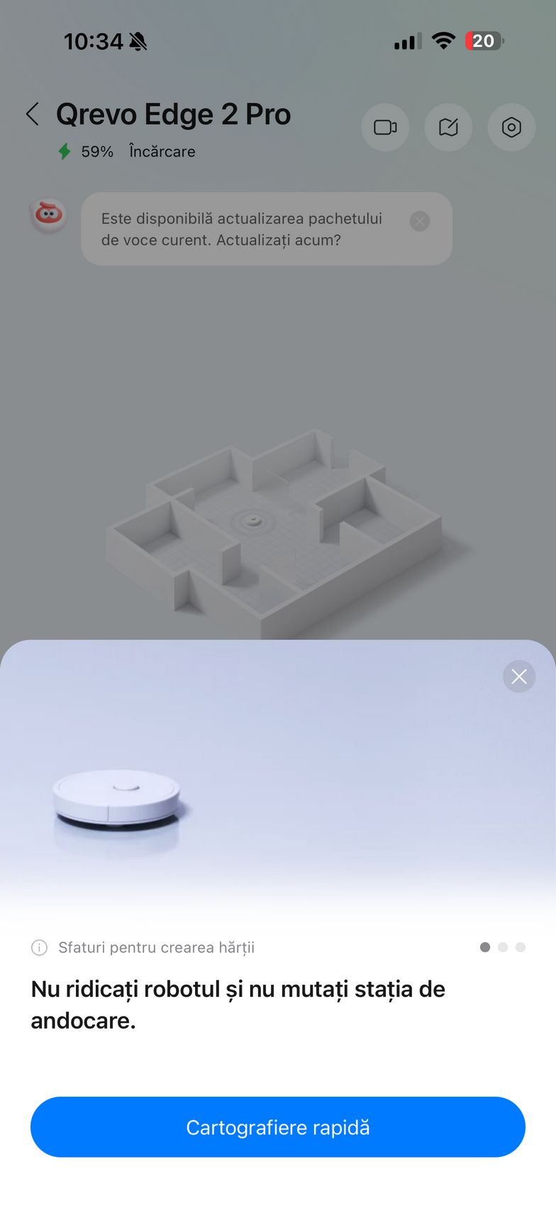 A urmat o cartografiere rapidă care nu cred că a durat mai mult de 10 minute și la acest pas am urmat indicațiile Roborock de a deschide larg ușile, ridica obiectele de pe podea, cablurile și toate cele pentru această primă tură de casă. M-am ales cu o hartă detaliată, camere împărțite și eu apoi doar am adăugat obiectele de mobilier în locurile fixate, plus zone no-go precum sub birou unde am foarte multe cabluri ce atârnă, cât și sub dulapurile din bucătărie unde la fel e risc mare de încurcare.