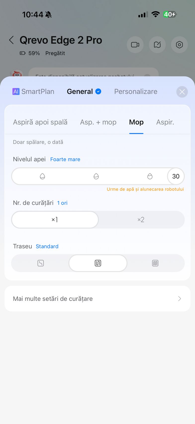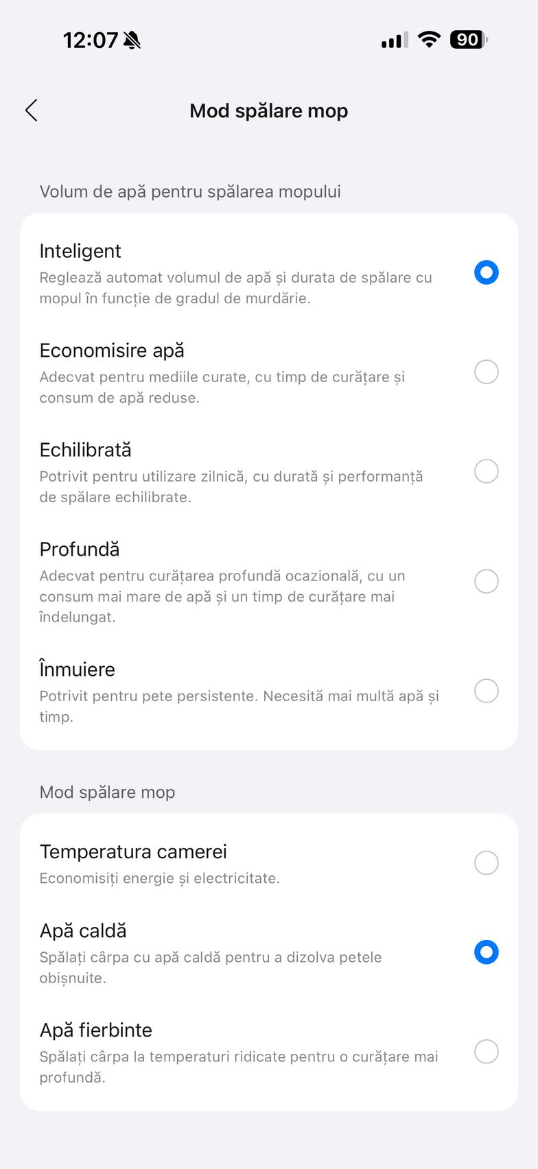 Spălarea mop permite setarea gradului de umezire a lavetelor, de la 1 până la 30, între nivel apă foarte mic, redus, mediu și până la foarte mare. Se poate seta și numărul de curățări, x1 sau x2, plus traseul - puternic, standard, intens. Spălarea lavetelor mop în dock se face la 100 grade Celsius. Aș mai puncta și faptul că spălarea podelelor se face prin rotirea mopurilor și presiune maximă de apăsare de 12 N. Se rotesc la 200 RPM și totodată avem acel braț mop extensibil pentru a ajunge sub mobilier.