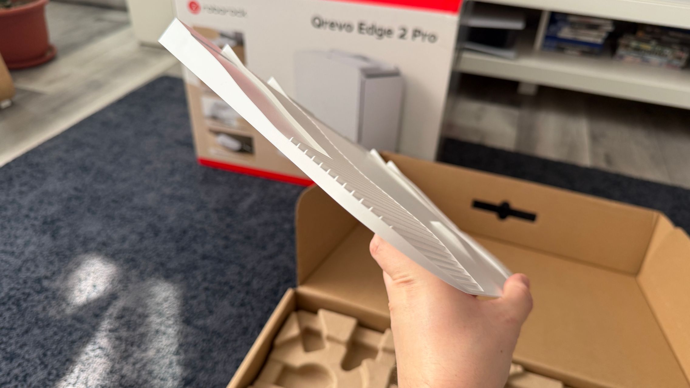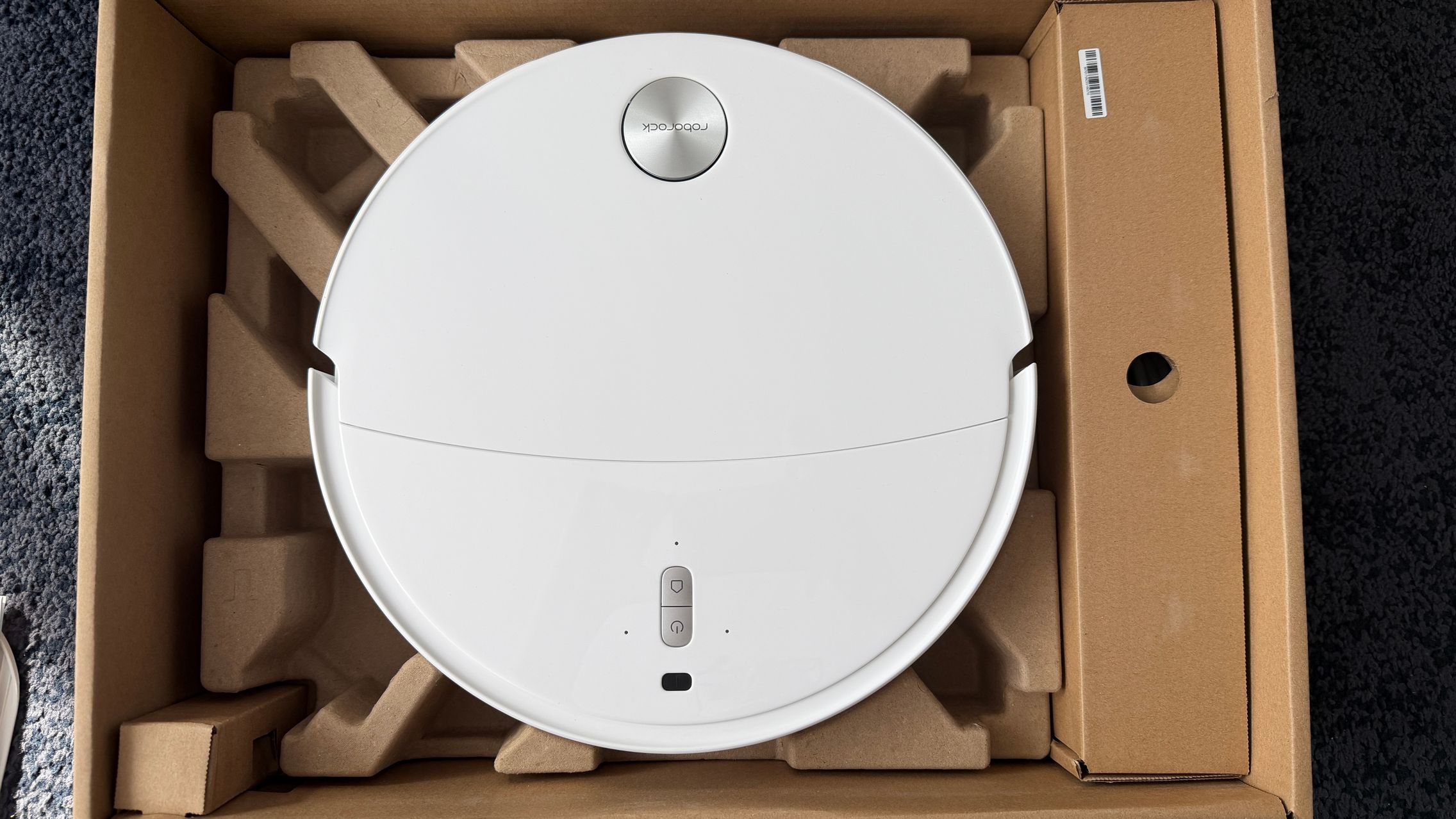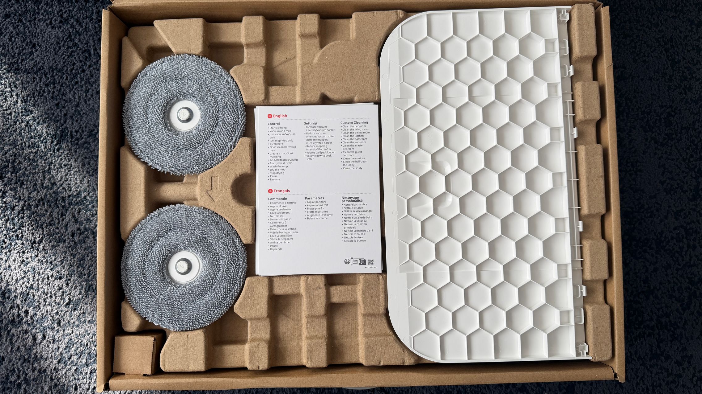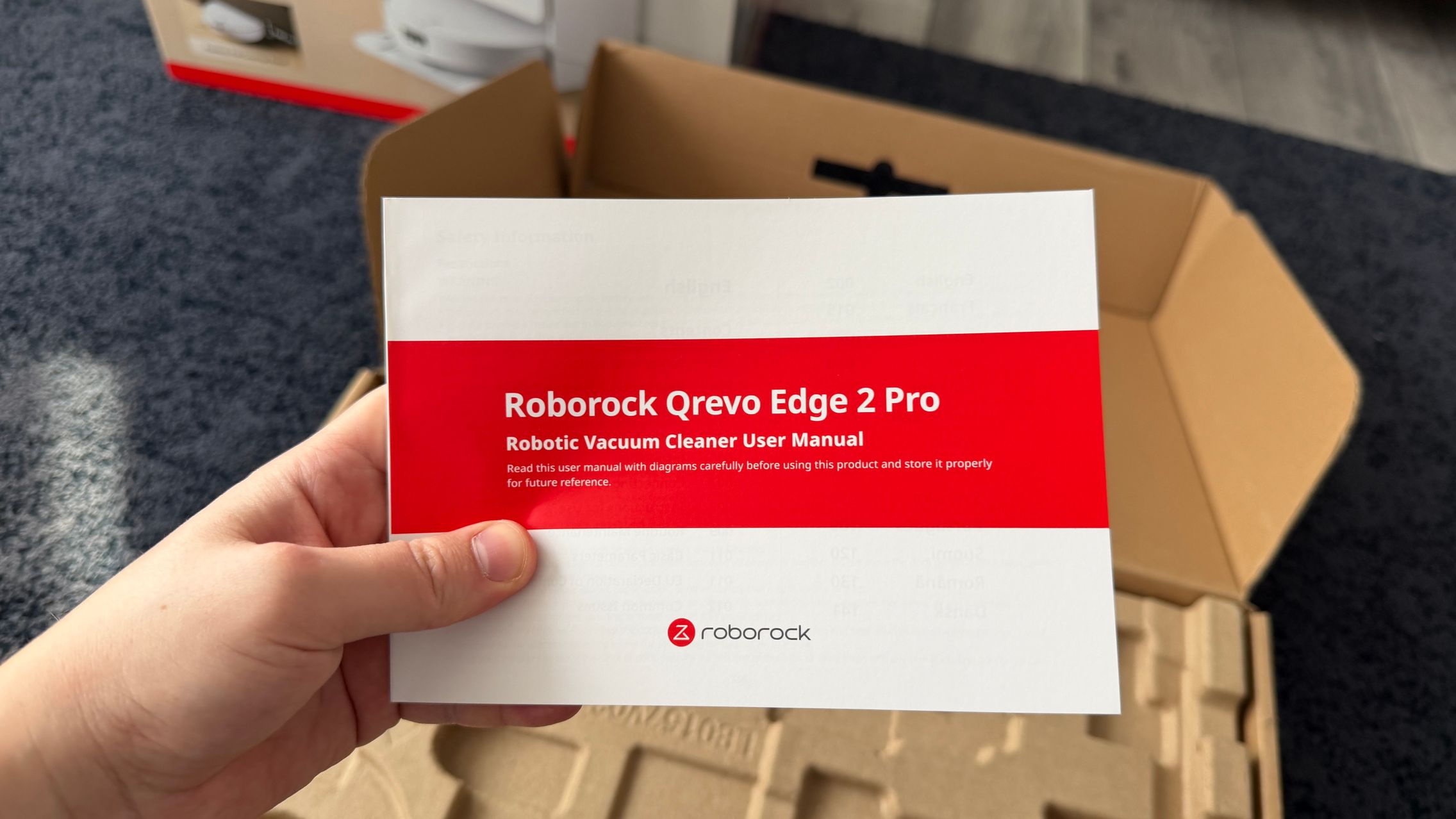 Cutia aspiratorului Roborock Qrevo Edge 2 Pro este destul de compactă pentru ce se ascunde la interior și chiar manevrabilă de unul singur, cum am procedat eu. Sunt multe date cheie pe ambalajul său, iar la interior am găsit rând pe rând următoarele: aspirator, dock (cu sac de praf preinstalat), 2x lavete mop, manual de utilizare și cablul de alimentare. Nu se oferă saci extra de praf și nici detergentul necesar pentru spălarea pad-urilor mop, accesorii la care mă așteptam la suma practicată ce-i drept..