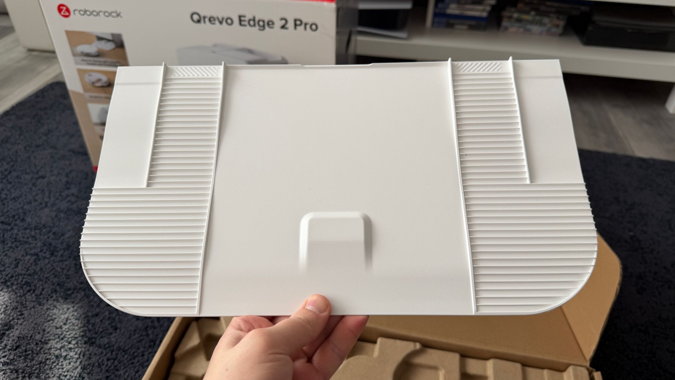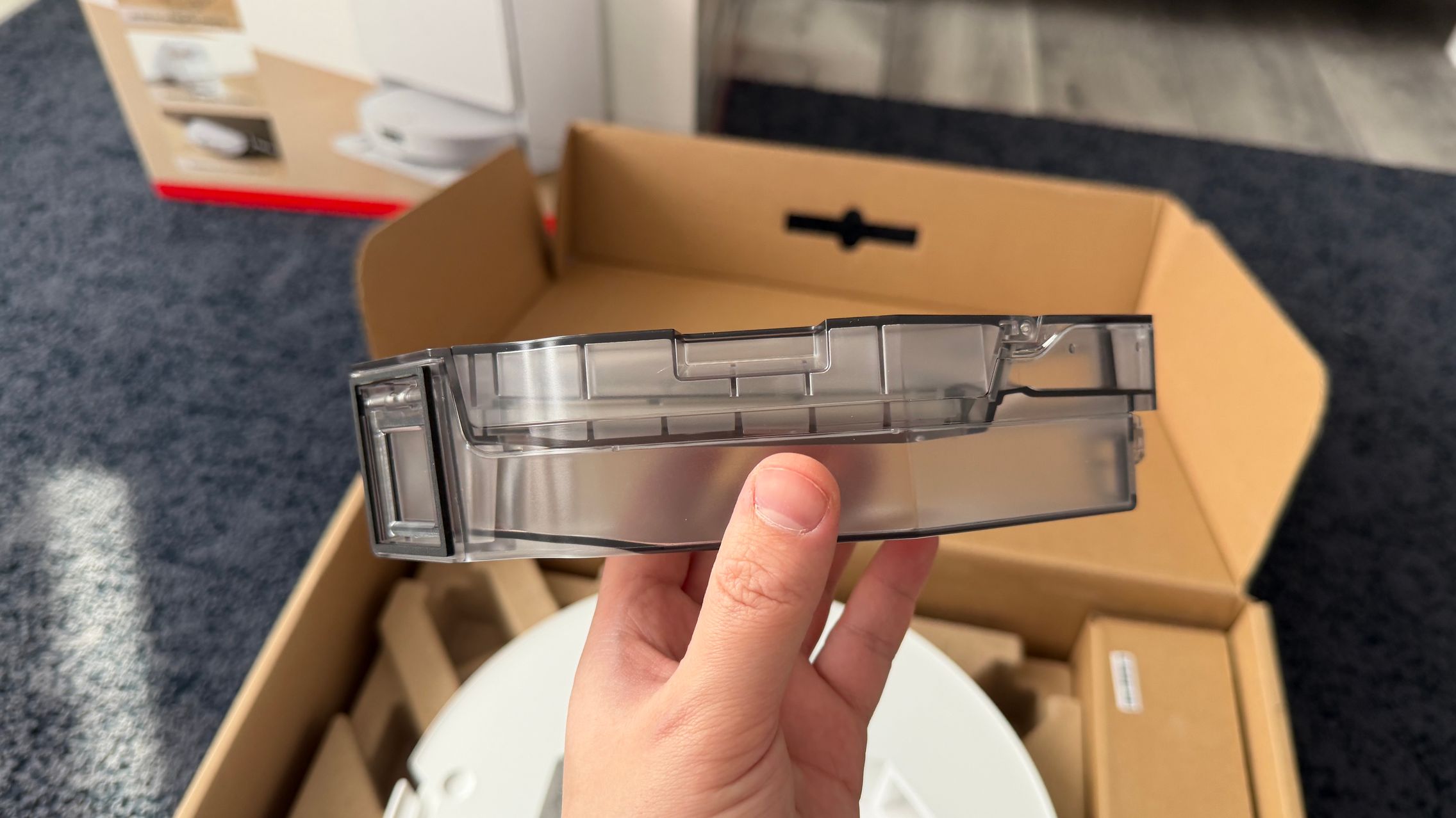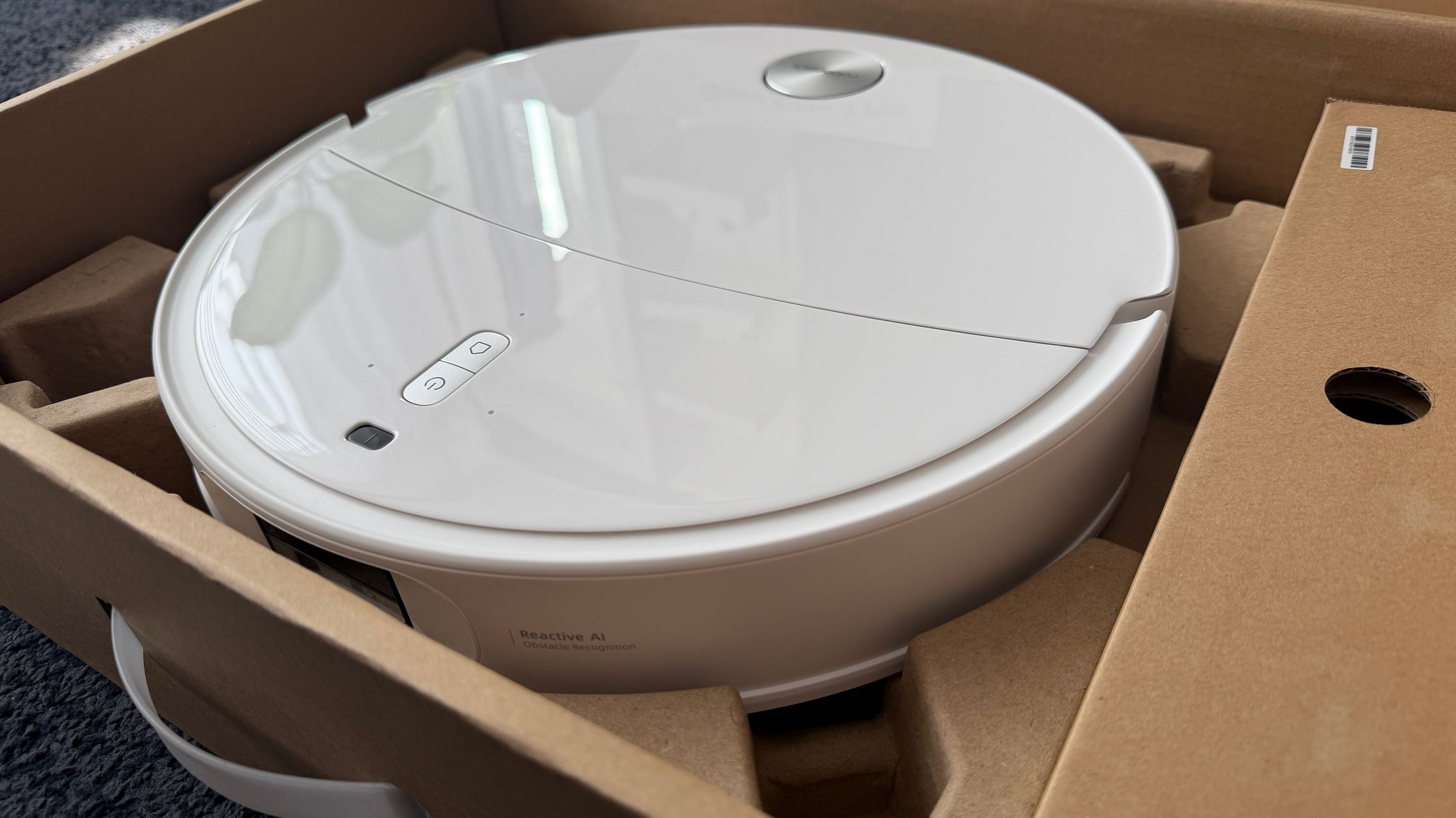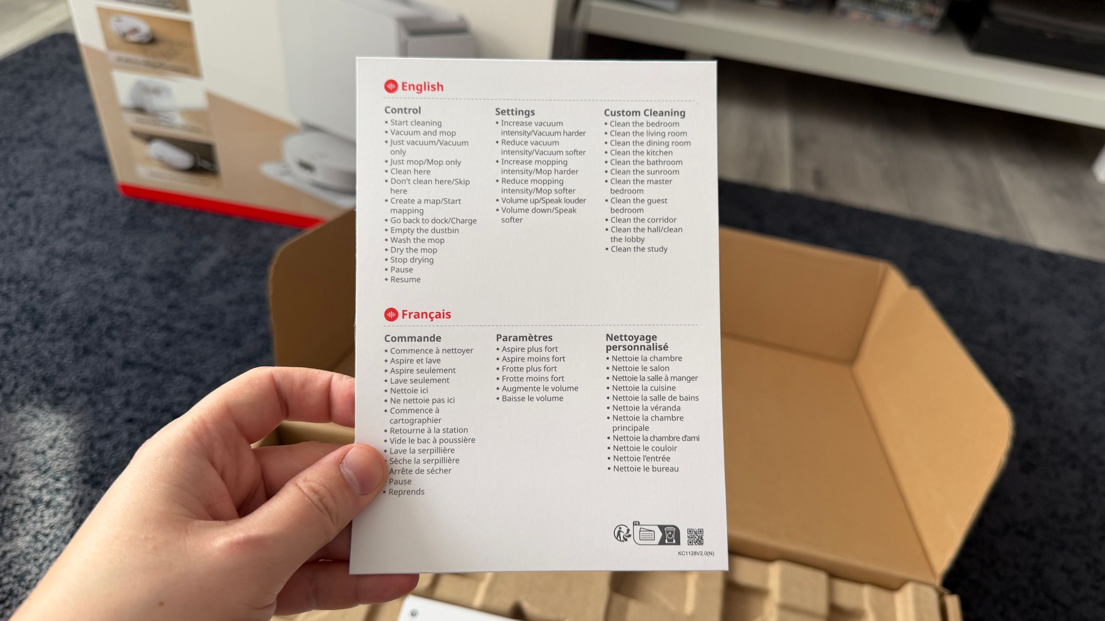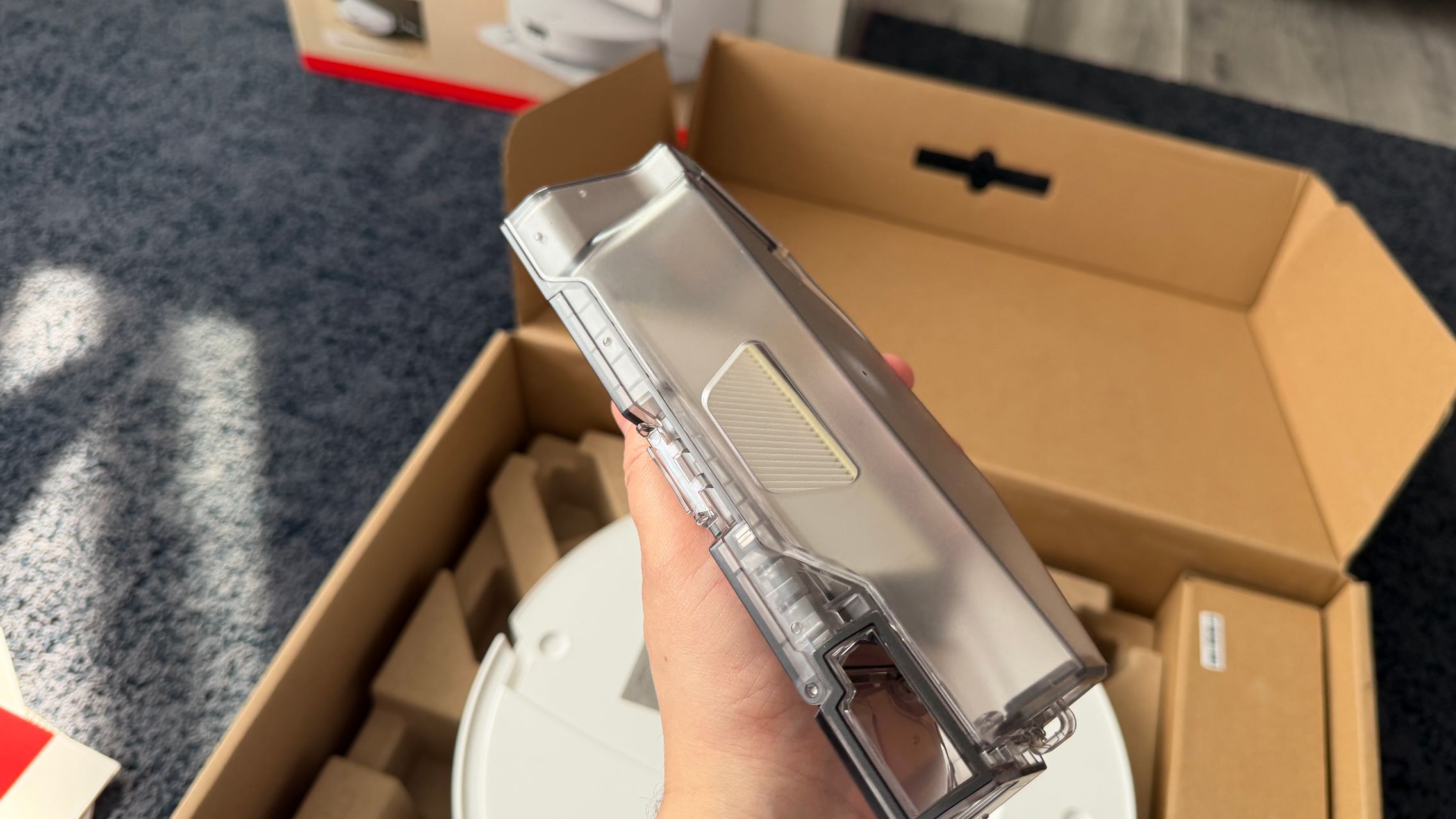 Cutia aspiratorului Roborock Qrevo Edge 2 Pro este destul de compactă pentru ce se ascunde la interior și chiar manevrabilă de unul singur, cum am procedat eu. Sunt multe date cheie pe ambalajul său, iar la interior am găsit rând pe rând următoarele: aspirator, dock (cu sac de praf preinstalat), 2x lavete mop, manual de utilizare și cablul de alimentare. Nu se oferă saci extra de praf și nici detergentul necesar pentru spălarea pad-urilor mop, accesorii la care mă așteptam la suma practicată ce-i drept..