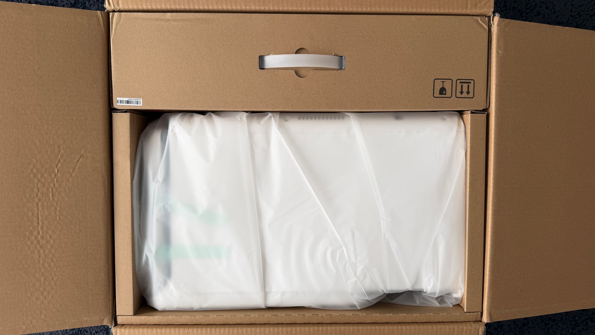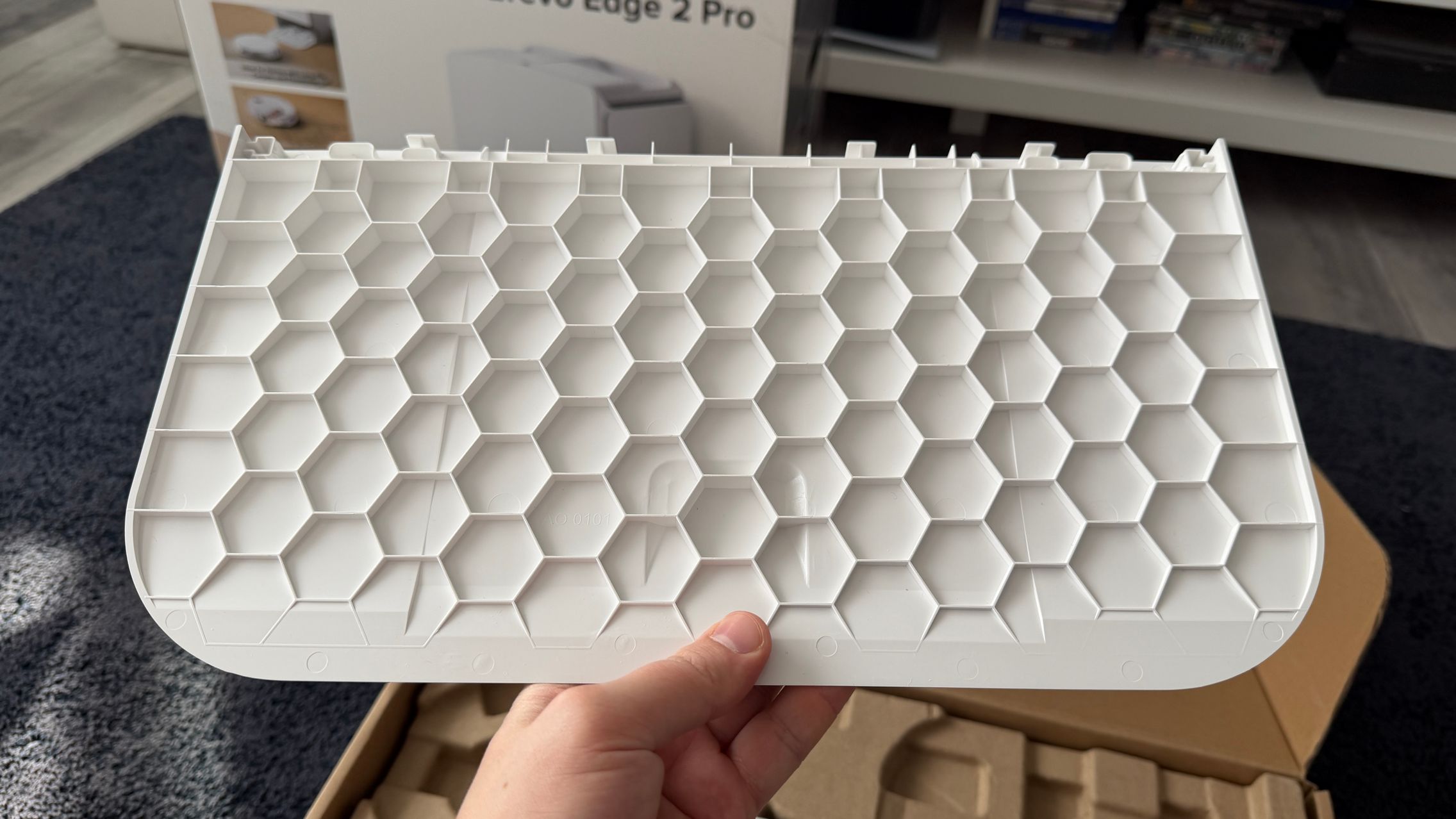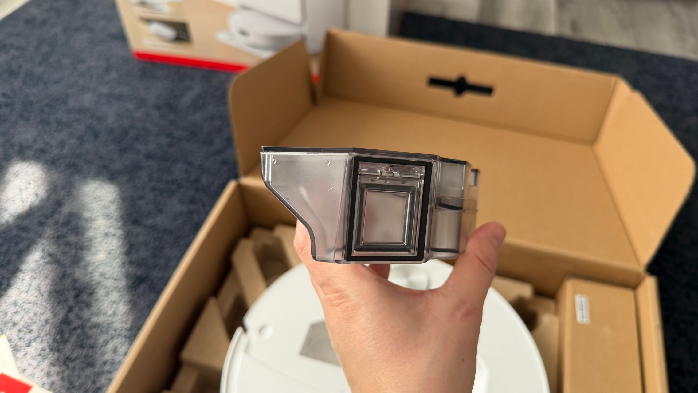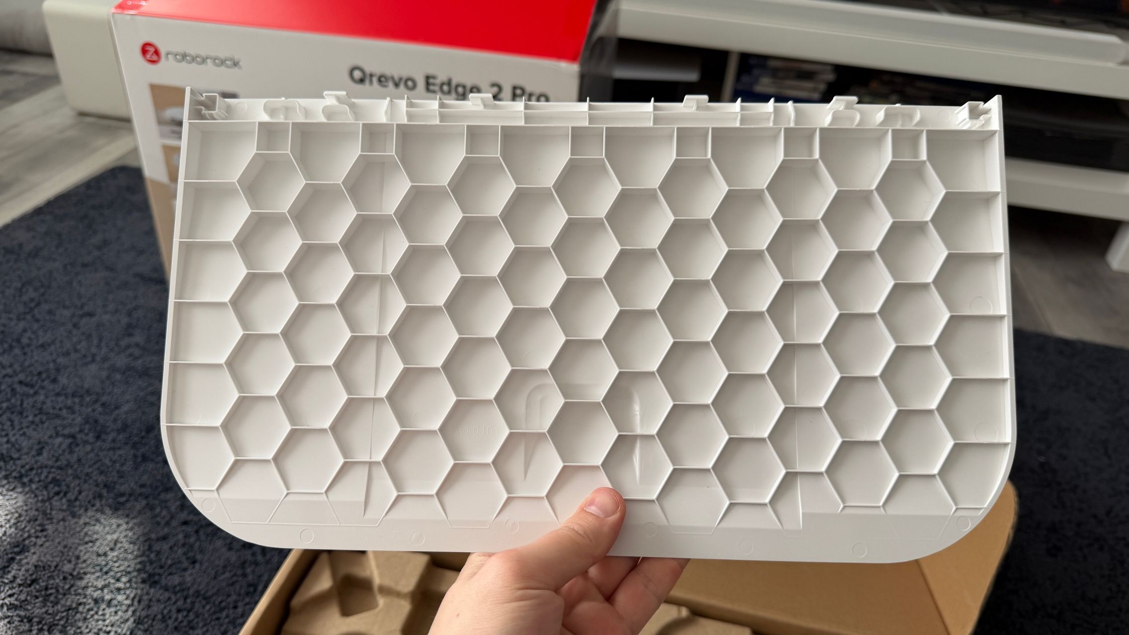 Cutia aspiratorului Roborock Qrevo Edge 2 Pro este destul de compactă pentru ce se ascunde la interior și chiar manevrabilă de unul singur, cum am procedat eu. Sunt multe date cheie pe ambalajul său, iar la interior am găsit rând pe rând următoarele: aspirator, dock (cu sac de praf preinstalat), 2x lavete mop, manual de utilizare și cablul de alimentare. Nu se oferă saci extra de praf și nici detergentul necesar pentru spălarea pad-urilor mop, accesorii la care mă așteptam la suma practicată ce-i drept..