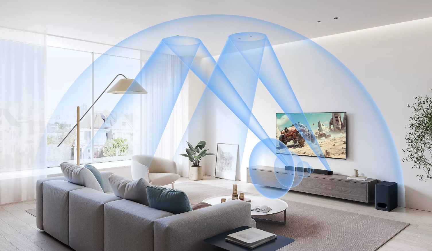 Întreaga cameră în care vei plasa soundbar-ul va fi cufundată în sunet surround, asta pentru că avem tehnologii audio de top plus boxe direcționate în sus spre tavan, o dimensiune care se simte, sunetul "ridicându-se". Sunetul se poate poziționa în spațiu vertical pentru acel efect de tridimensionalitate fără a avea boxe pe tavan precum se întâmplă în sala de cinema.
