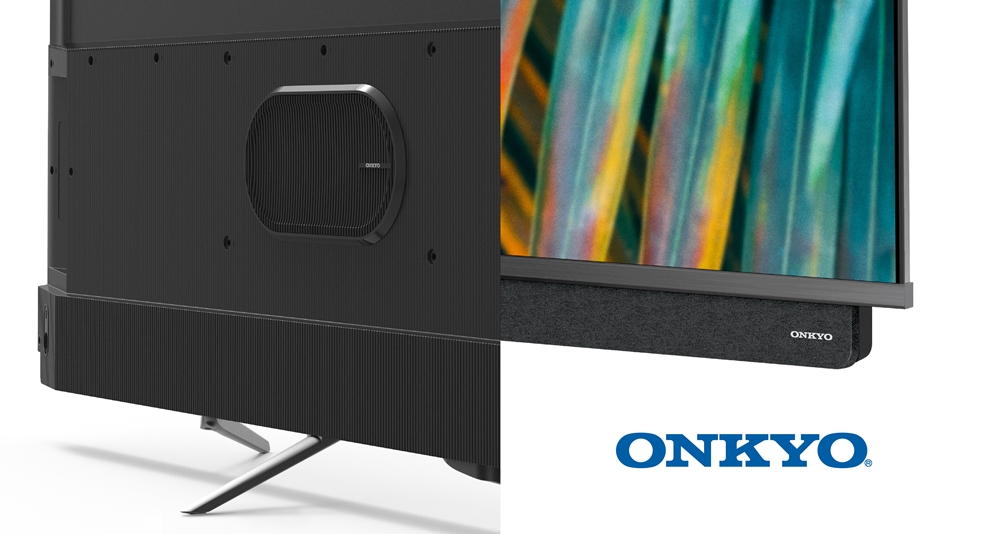 Mergem mai departe și ajunge la acustică, cu revenire la acea "parte" groasă din zona inferioară a televizorului. Ce se află aici sub forma unui soundbar este un sistem de sunet de ultimă oră ONKYO 2.1, cu difuzoare pentru față și un subwoofer dedicat în spatele televizorului.