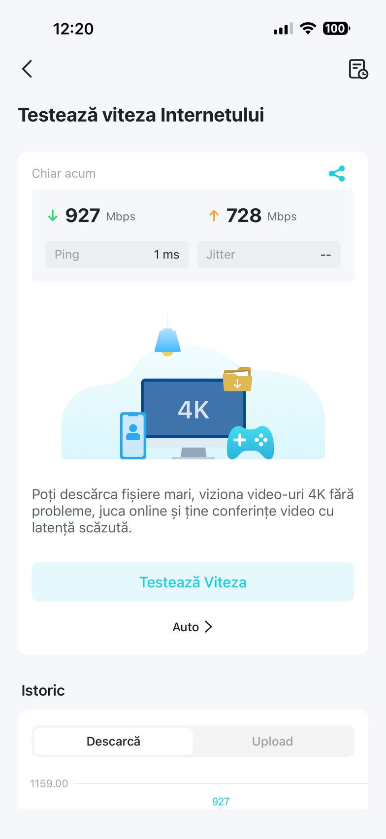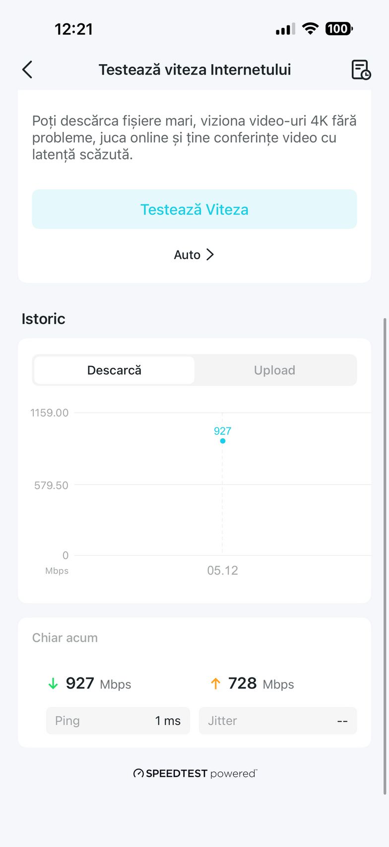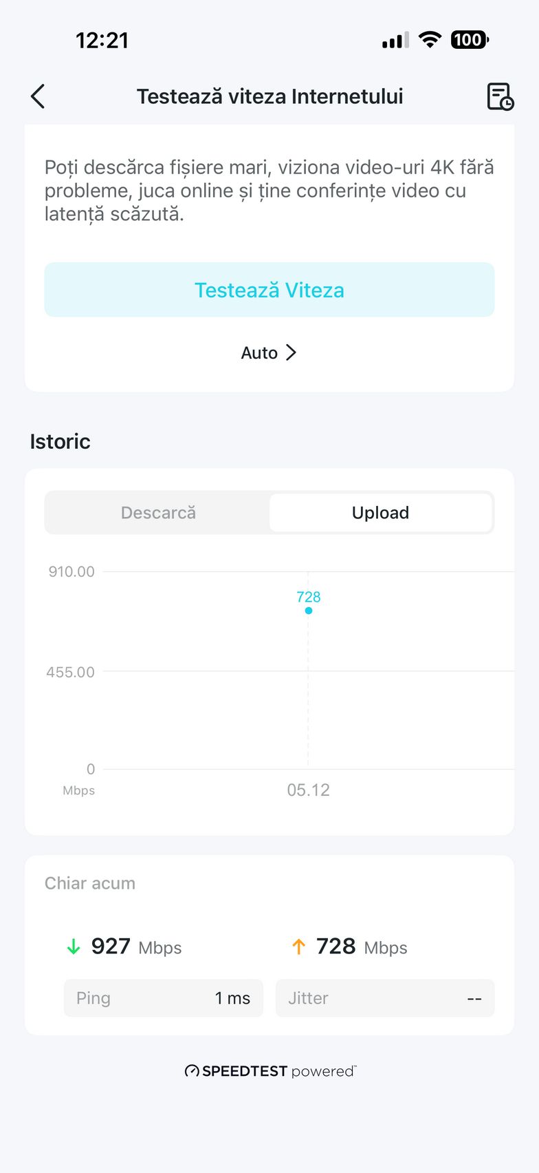 În cadrul testelor făcute în apartament nu am avut nici măcar un moment fără semnal și este doar o mică parte din acoperirea pe care o livrează un asemenea kit. SpeedTest mi-a livrat super viteze la download și upload, pe măsura abonamentului de 1 Gbps.