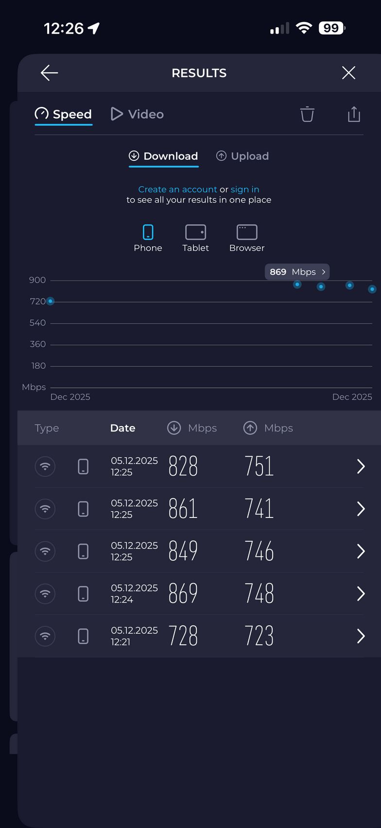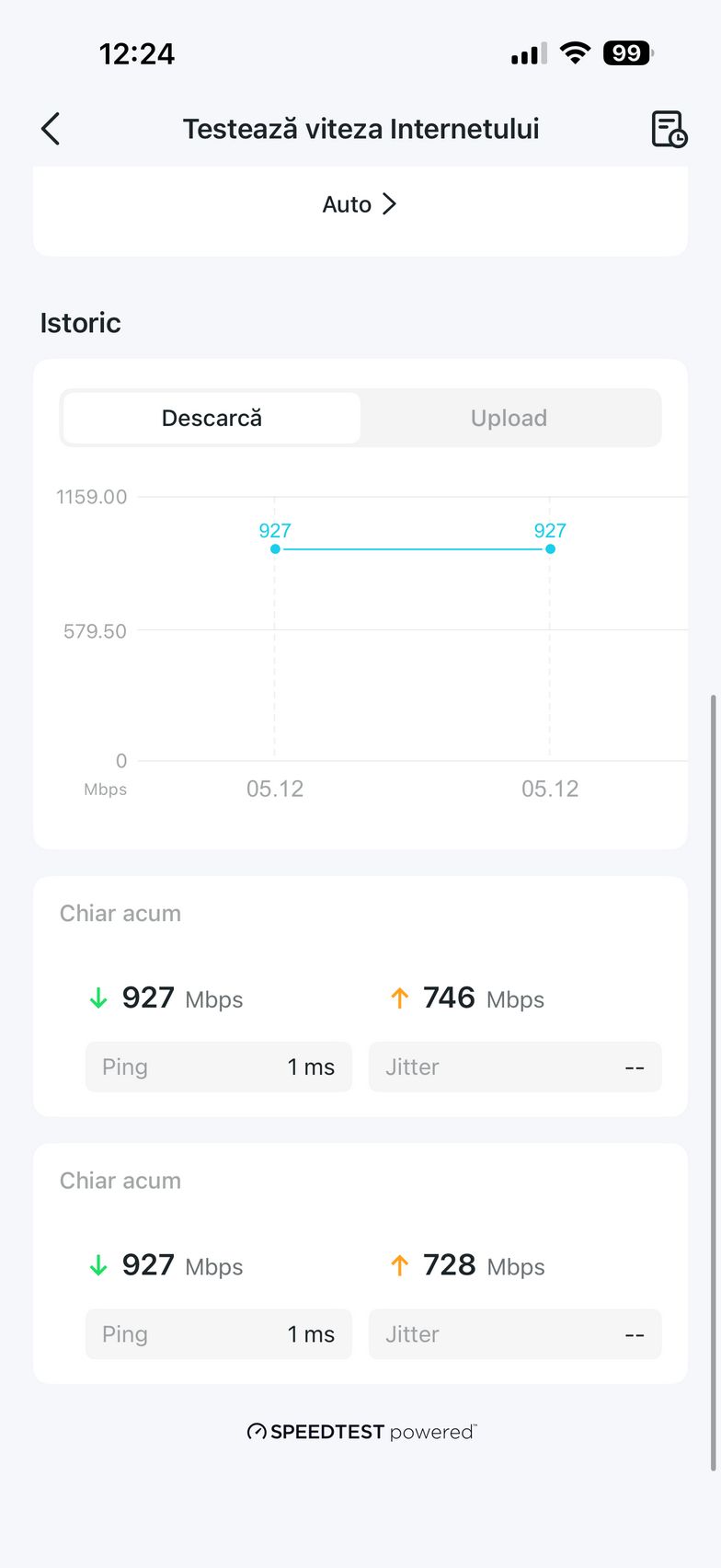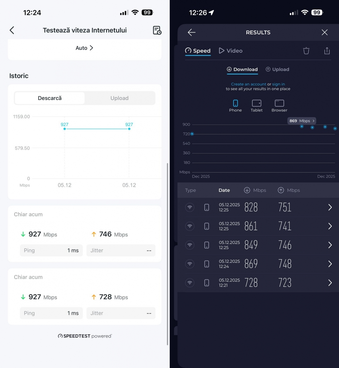 În cadrul testelor făcute în apartament nu am avut nici măcar un moment fără semnal și este doar o mică parte din acoperirea pe care o livrează un asemenea kit. SpeedTest mi-a livrat super viteze la download și upload, pe măsura abonamentului de 1 Gbps.