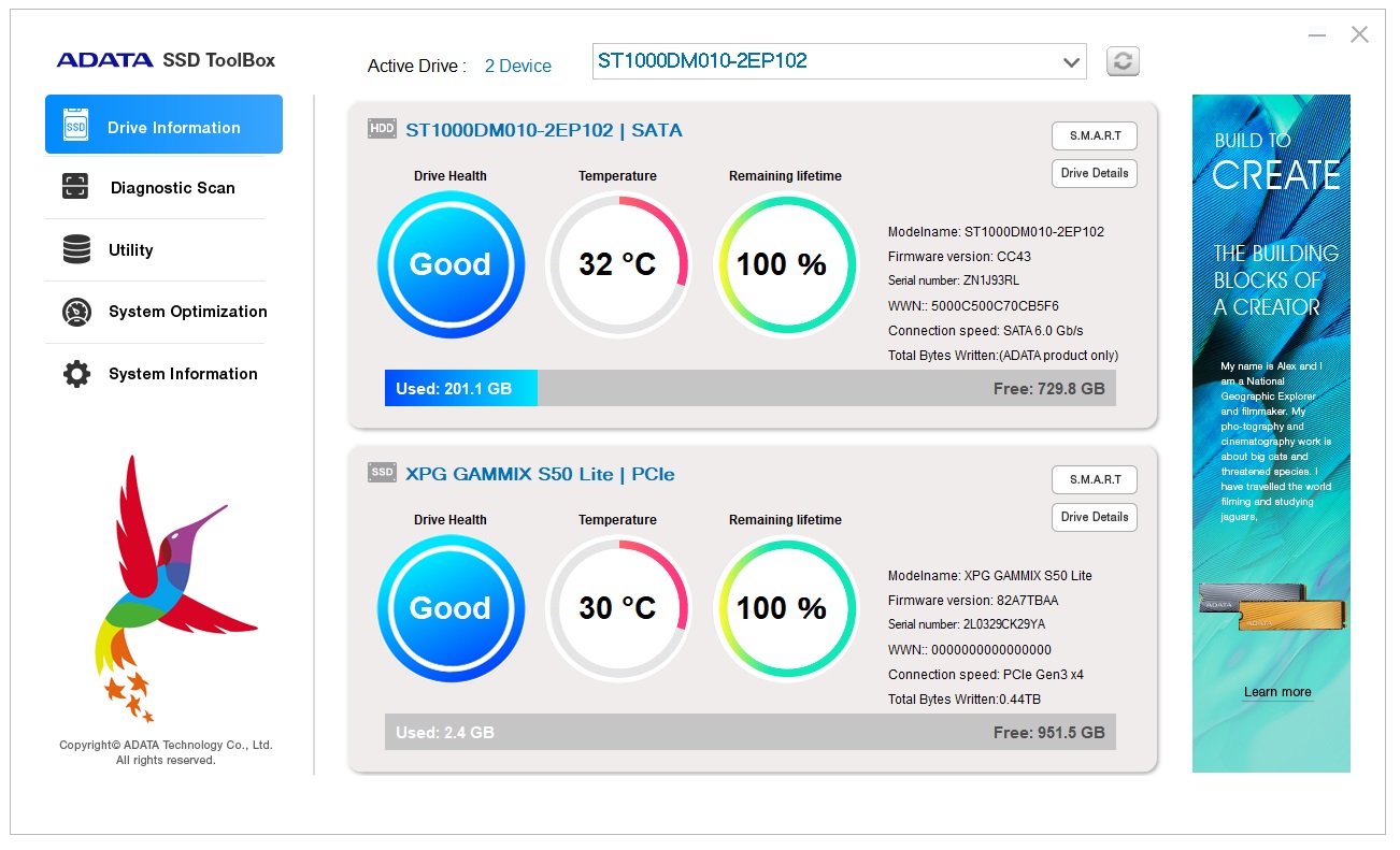 ADATA pune la dispoziție un software propriu și anume SSD ToolBox de unde poți vedea statusul SSD-ului tău, dar și al celorlalte unități de stocare pe care le ai instalate pe PC. Tot de aici poți derula scanări pentru diagnosticare, o funcție de ștergere completă a datelor de pe SSD care nu mai pot fi recuperate, cât și o funcție de optimizare. Cât despre performanțe, înainte de a trece la testele benchmark pe care le-am realizat, este important de precizat că sistemul pe care am instalat SSD-ul oferă suport PCIe 3.0. Deși XPG GAMMIX S50 Lite este un model pe tehnologia mai nouă PCIe 4.0, acesta este compatibil și cu generația anterioară, dar desigur performanțele nu vor fi atât de mari, dacă nu ai și o placă de bază cu slot PCIe 4.0.
