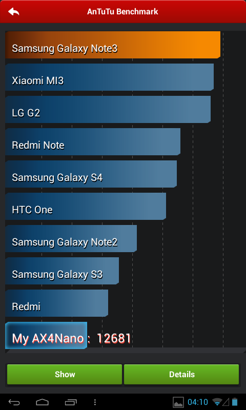 La capitolul benchmark am decis să îl compar pe AX4 Nano cu Samsung Galaxy Tab 3 Lite. Tableta Allview a câștigat mai toate duelurile având scoruri de 4122 și 12861 în Quadrant și AnTuTu, în vreme ce Tab 3 Lite atinge doar 3400 și 11000. în NenaMark am atins un scor exagerat de 75 FPS, mult peste cele 48.8 FPS ale tabletei Samsung, iar în Vellamo am avut din nou un scor mai bun, cu 1929 versus 1502. în schimb în 3DMark am avut un punctaj de 2516, cu 60 mai puțin decât Tab 3 Lite. Noul BrowserMark nu a funcționat pe device, iar în Sunspider rezultatul a fost foarte slab: 1339 puncte.
