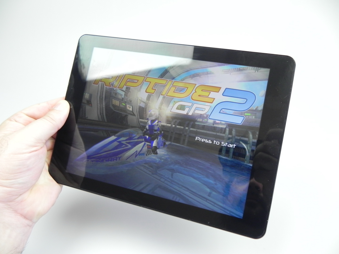 În zona inferioară găsim difuzoarele stereo, iar în stânga nu avem nimic. În dreapta regăsim butoanele de volum, cu feedback bun şi slotul microSD. Tableta stă bine în mâna la sesiunile de gaming sau vizionare video şi e destul de solidă, grea. Trecând la hardware, acest model aduce un display de 9.7 inch, un IPS LCD cu rezoluţie de 2048 x 1536 pixeli şi aspect 4:3.