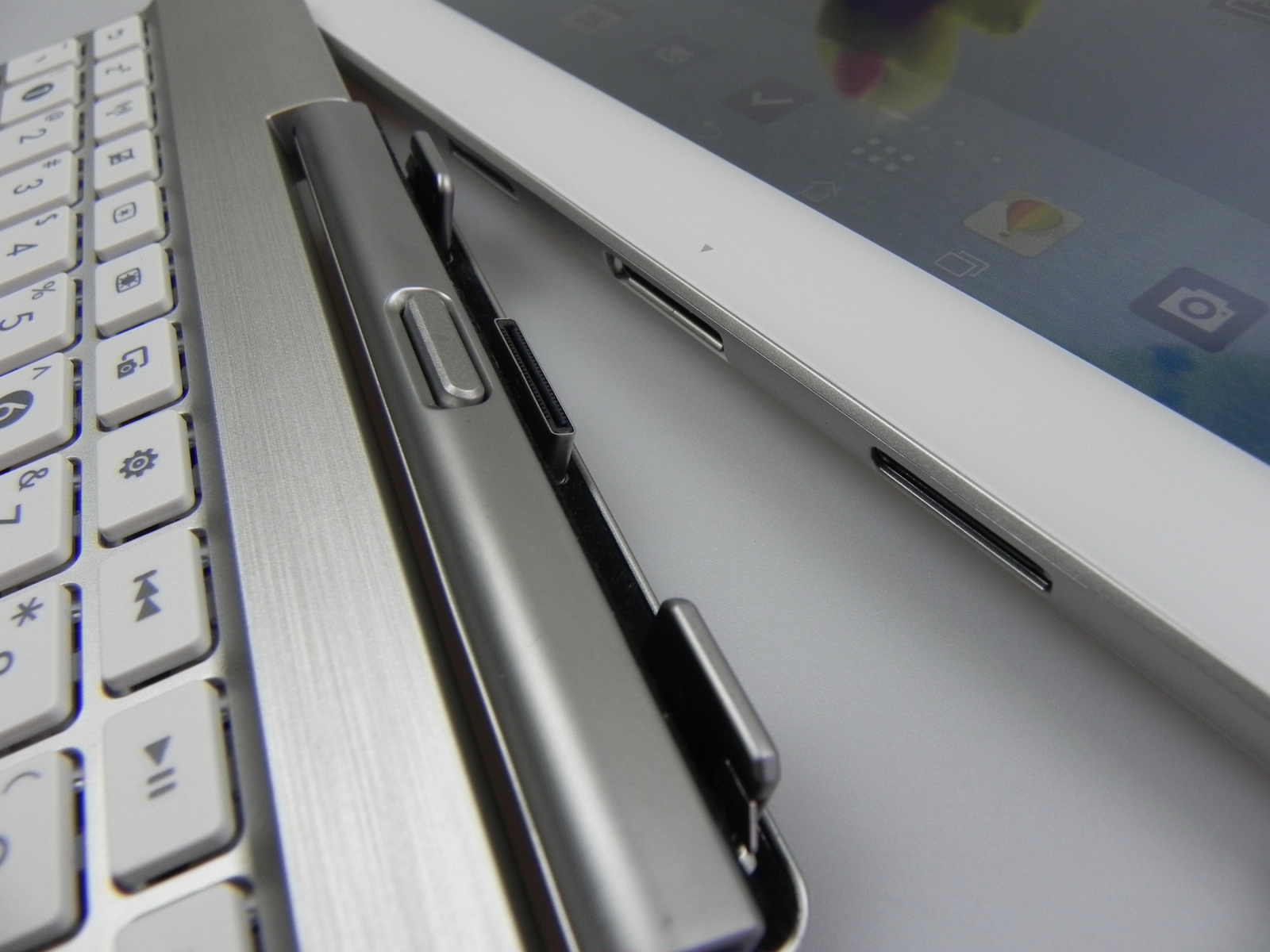 Sus regăsim butonul On/Off și microfonul, iar jos se află orificiile speciale pentru conectarea dock-ului. Avem parte de un mecanism nou de andocare, unul care funcționează mai rapid și eficient și implică utilizarea unui singur buton pe dock pentru a detașa tableta. Dock-ul vine cu o tastatură chiclet comodă, cu un touchpad bun și o serie de butoane shortcut utile și binevenite. Acest dock integrează și un port USB 2.0, iar dacă acesta a evoluat față de precedentele modele Transformer Pad, ei bine am dori să mai vedem puțină variațiune de la ASUS când vine vorba de designul tabletei, pe generațiile viitoare.