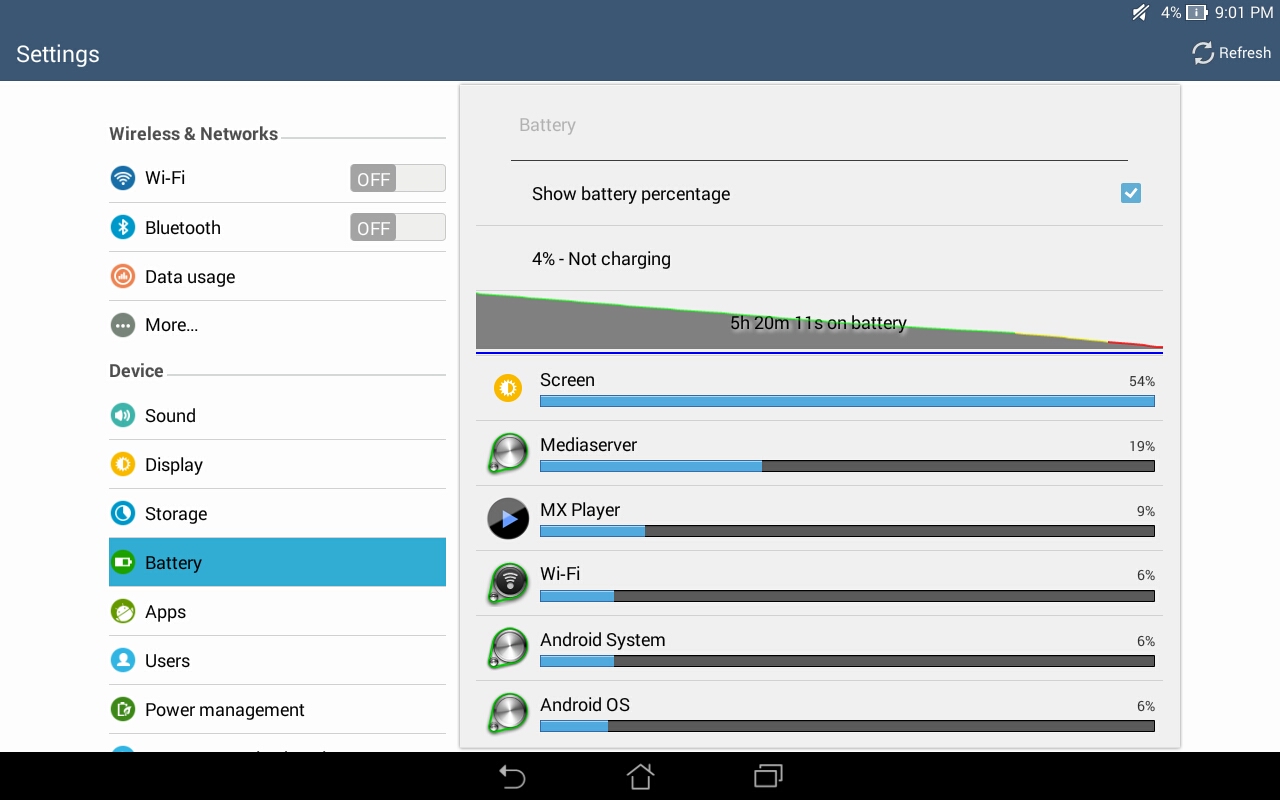 în zona de Setări găsim opțiunea Power Saver, cu 3 sub opțiuni: Ultra Save, care deconectează rețeaua atunci când ecranul nu e pornit, Extend cu păstrarea conexiunilor și Customize. Aceasta din urmă opțiune va permite să alegeți nivelul de luminozitate pentru diferite aplicații sau funcții. Trecem mai departe, la acustică, unde ne întâmpină difuzoare stereo și o aplicație muzicală cu interfața simplă și egalizator stock Android. Difuzoarele se aud bine și când tableta e plasată pe o suprafață plată, iar ele oferă volum ridicat, bas bun și claritate deosebită.