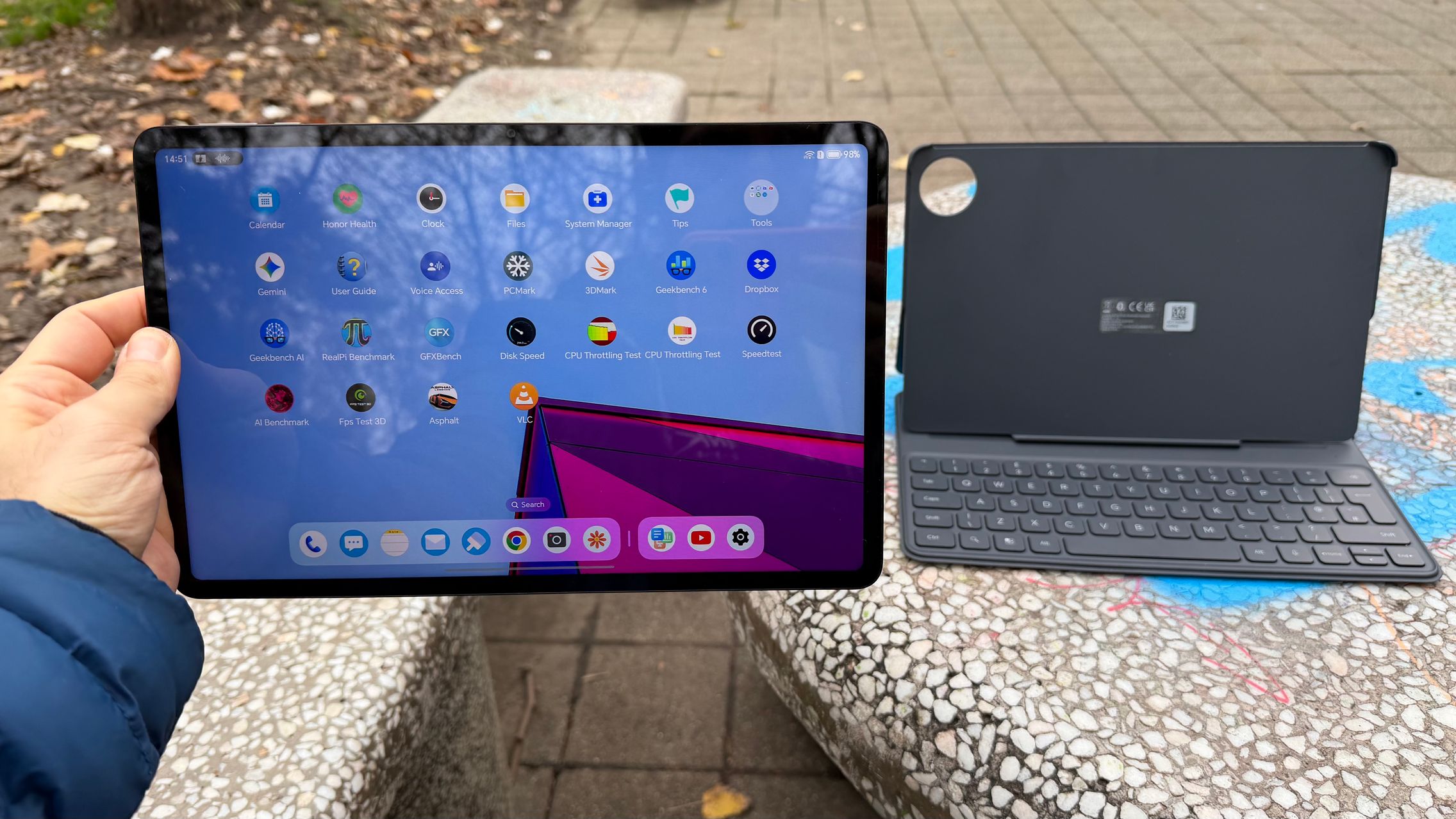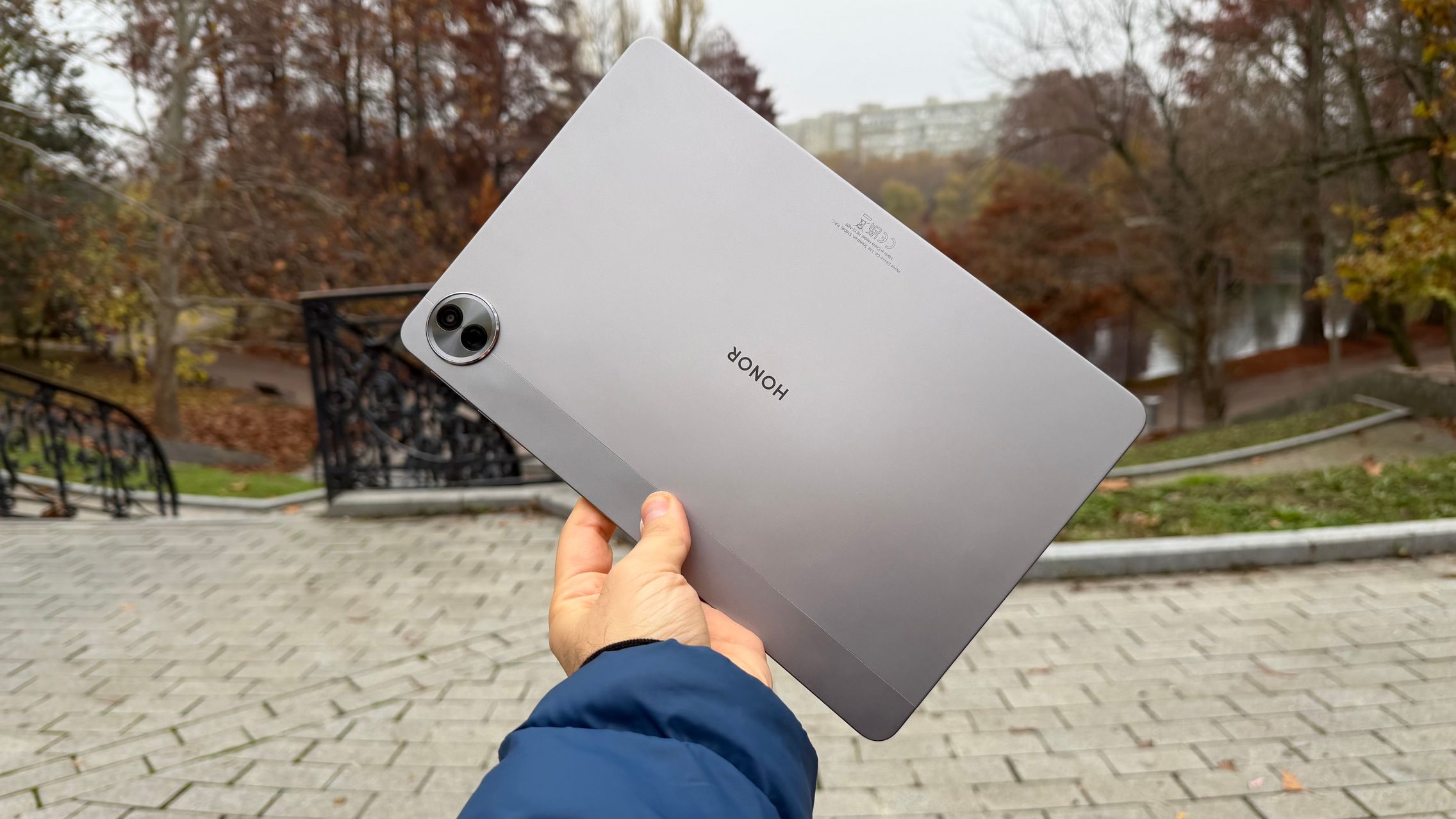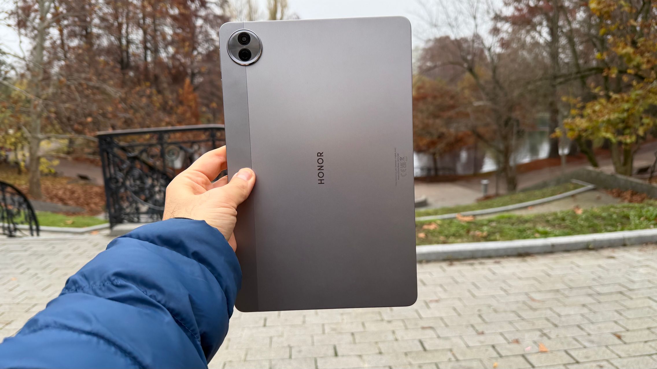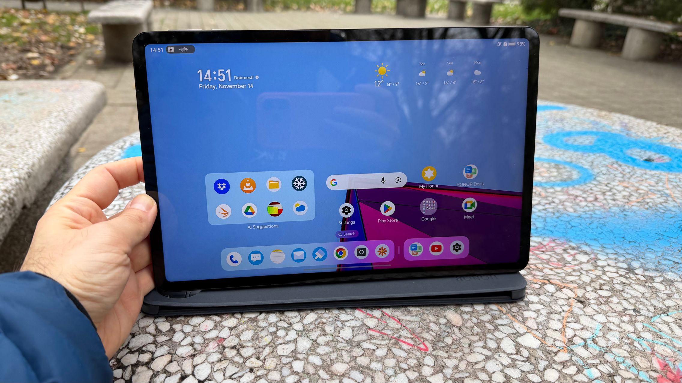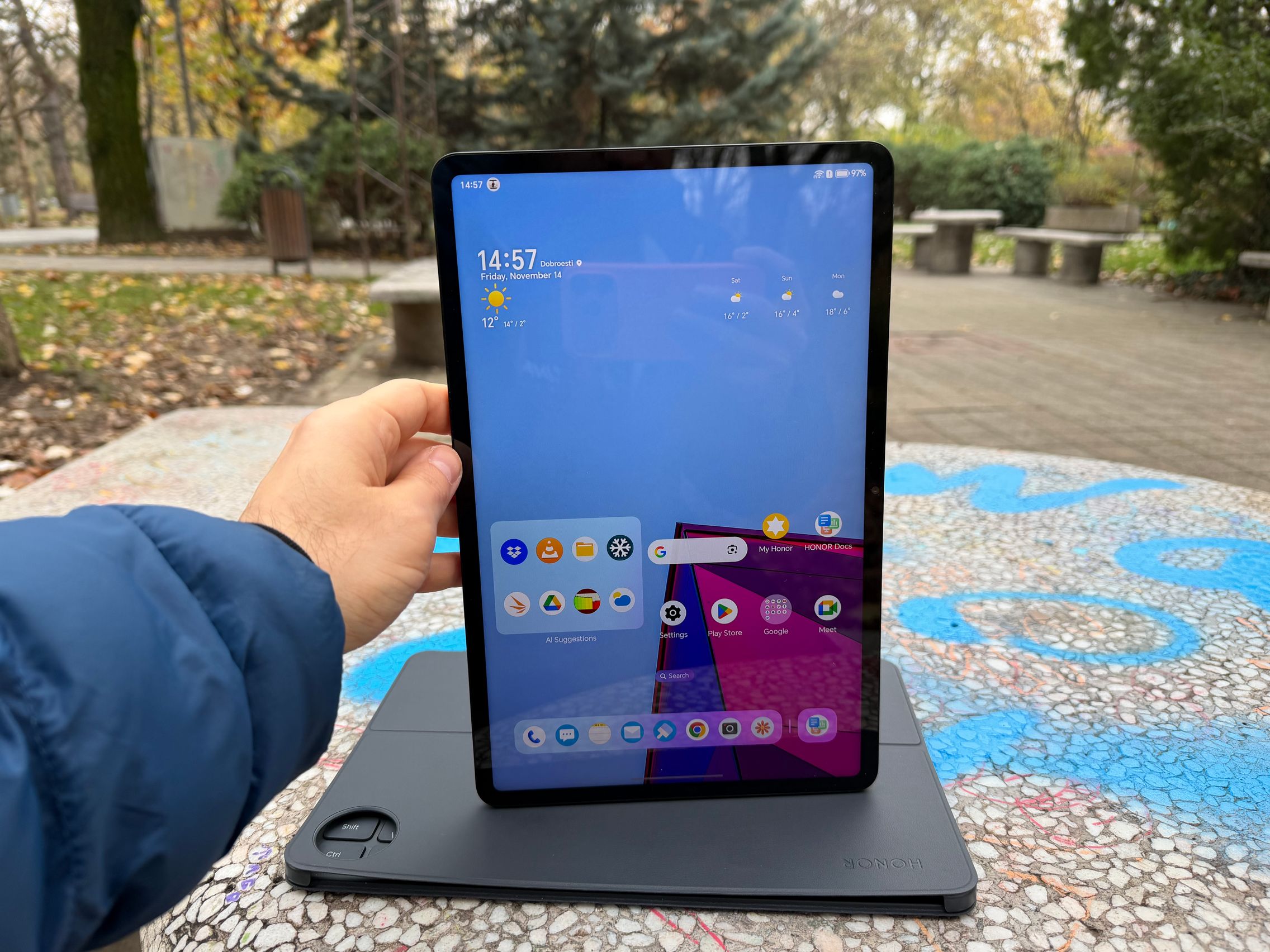 În față apare o cameră selfie de 8 MP cu autofocus, în spate alta de 8 MP ce filmează la calitate Full HD la 30 FPS. Avem baterie de 10.100 mAh, iar alimentarea se realizează la 33W pe fir. Rulăm Android 15 cu interfața MagicOS 9, dar e pe drum și MagicOS 10, bazat pe Android 16. Surprins sunt că avem un număr de 6 difuzoare aici, stereo, ce oferă senzație de spațialitate și conferă o experiență multimedia plăcută.