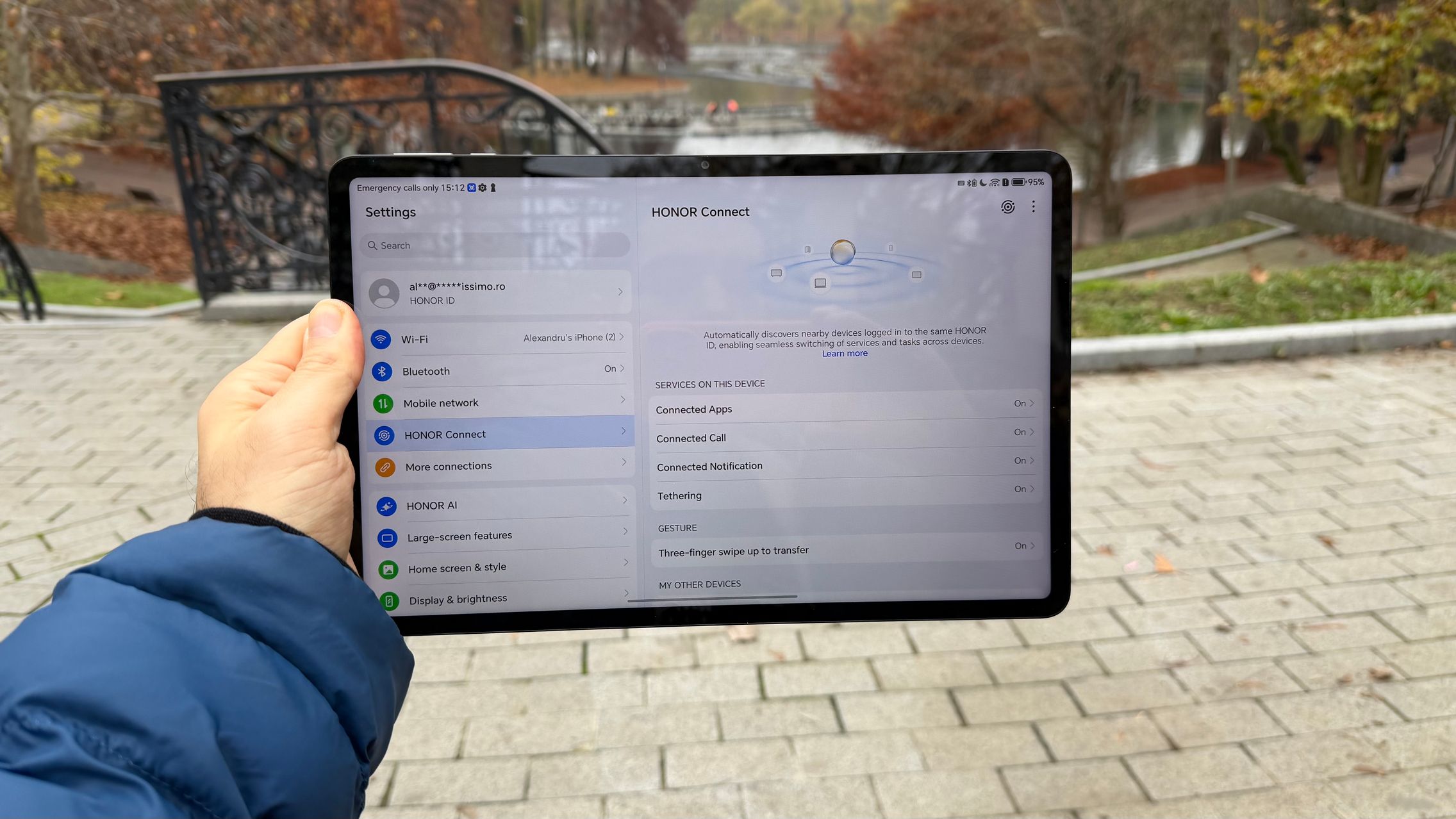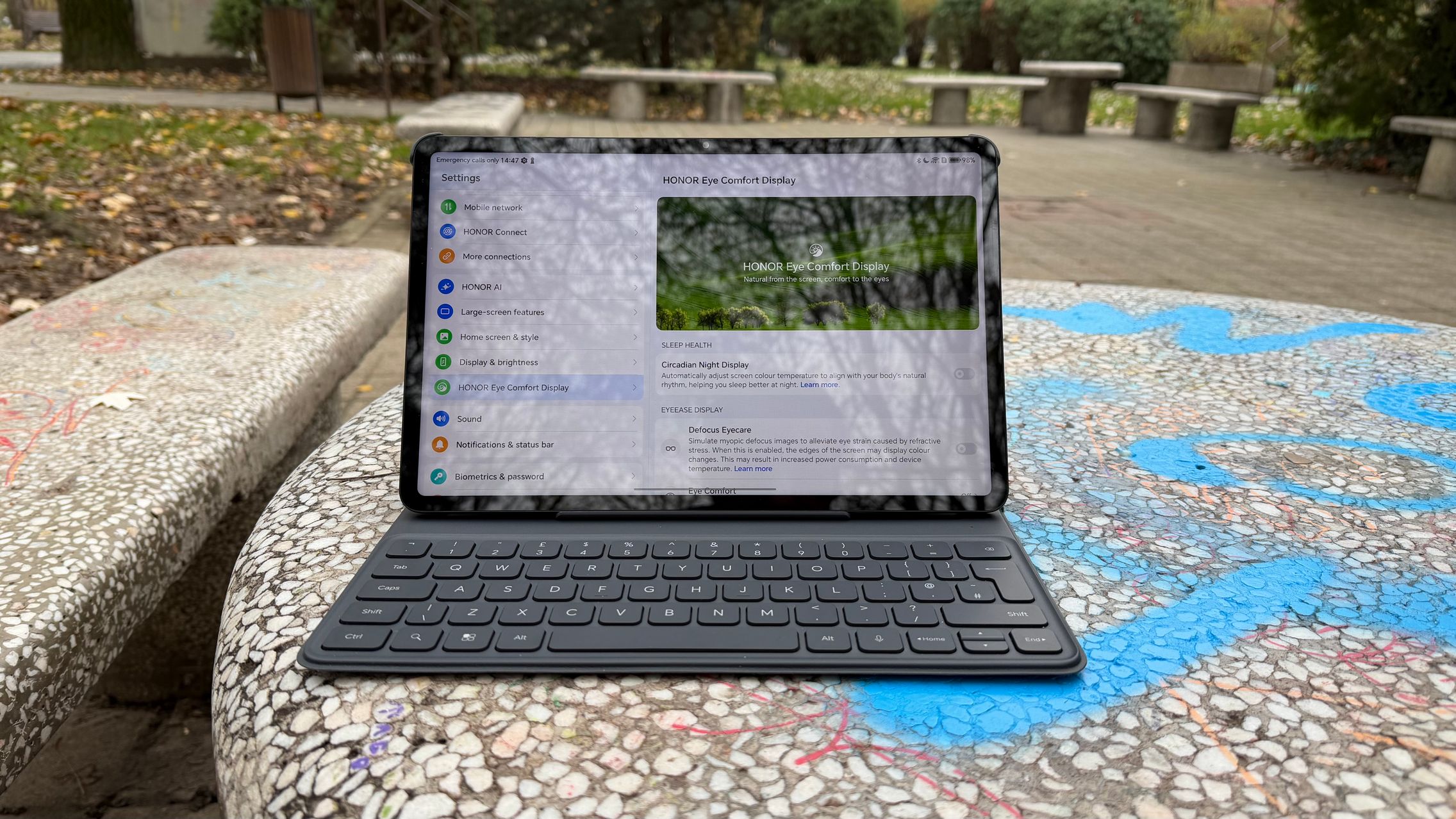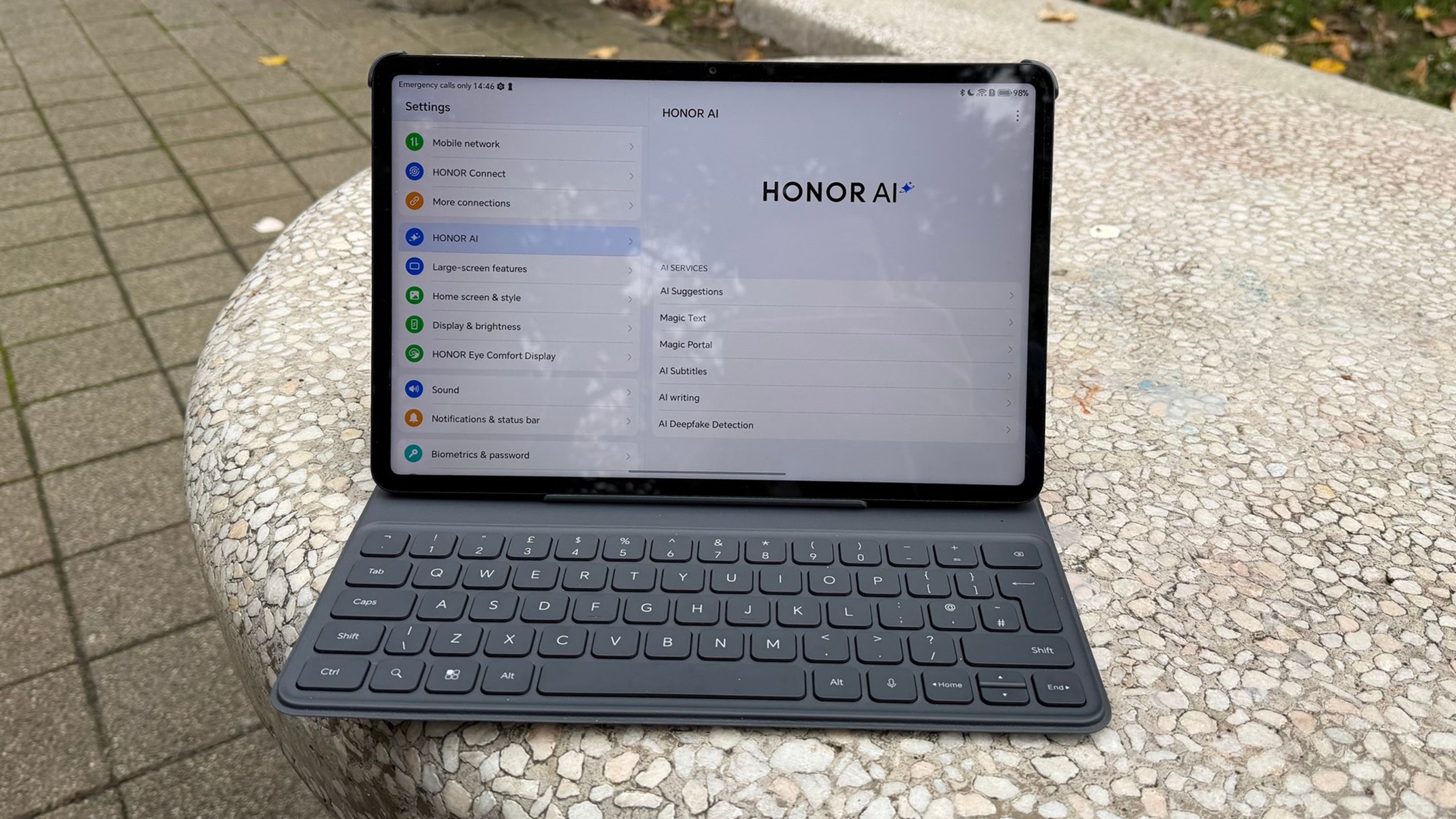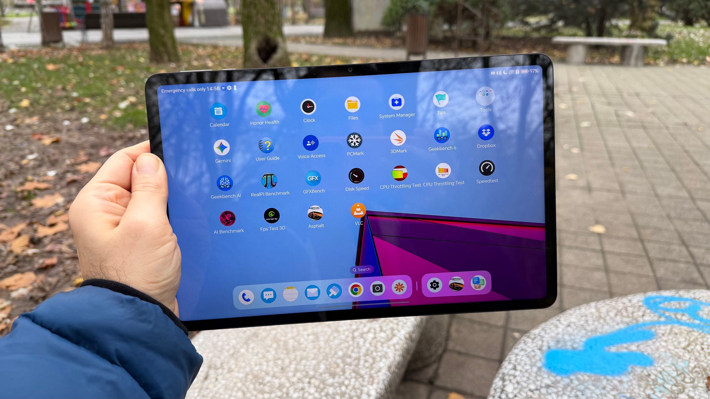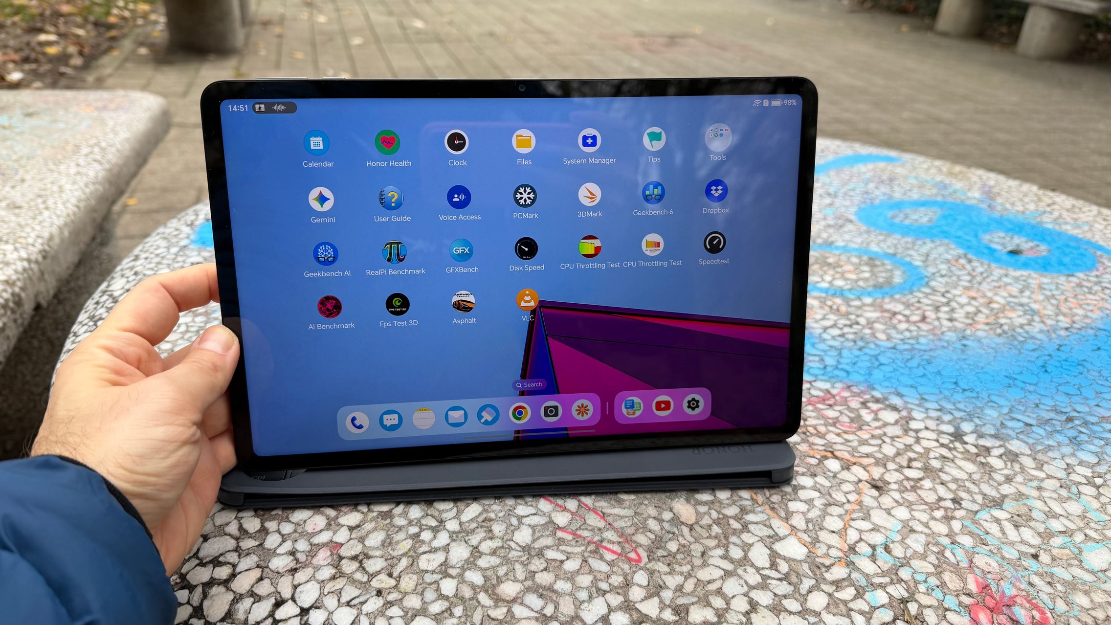 În față apare o cameră selfie de 8 MP cu autofocus, în spate alta de 8 MP ce filmează la calitate Full HD la 30 FPS. Avem baterie de 10.100 mAh, iar alimentarea se realizează la 33W pe fir. Rulăm Android 15 cu interfața MagicOS 9, dar e pe drum și MagicOS 10, bazat pe Android 16. Surprins sunt că avem un număr de 6 difuzoare aici, stereo, ce oferă senzație de spațialitate și conferă o experiență multimedia plăcută.