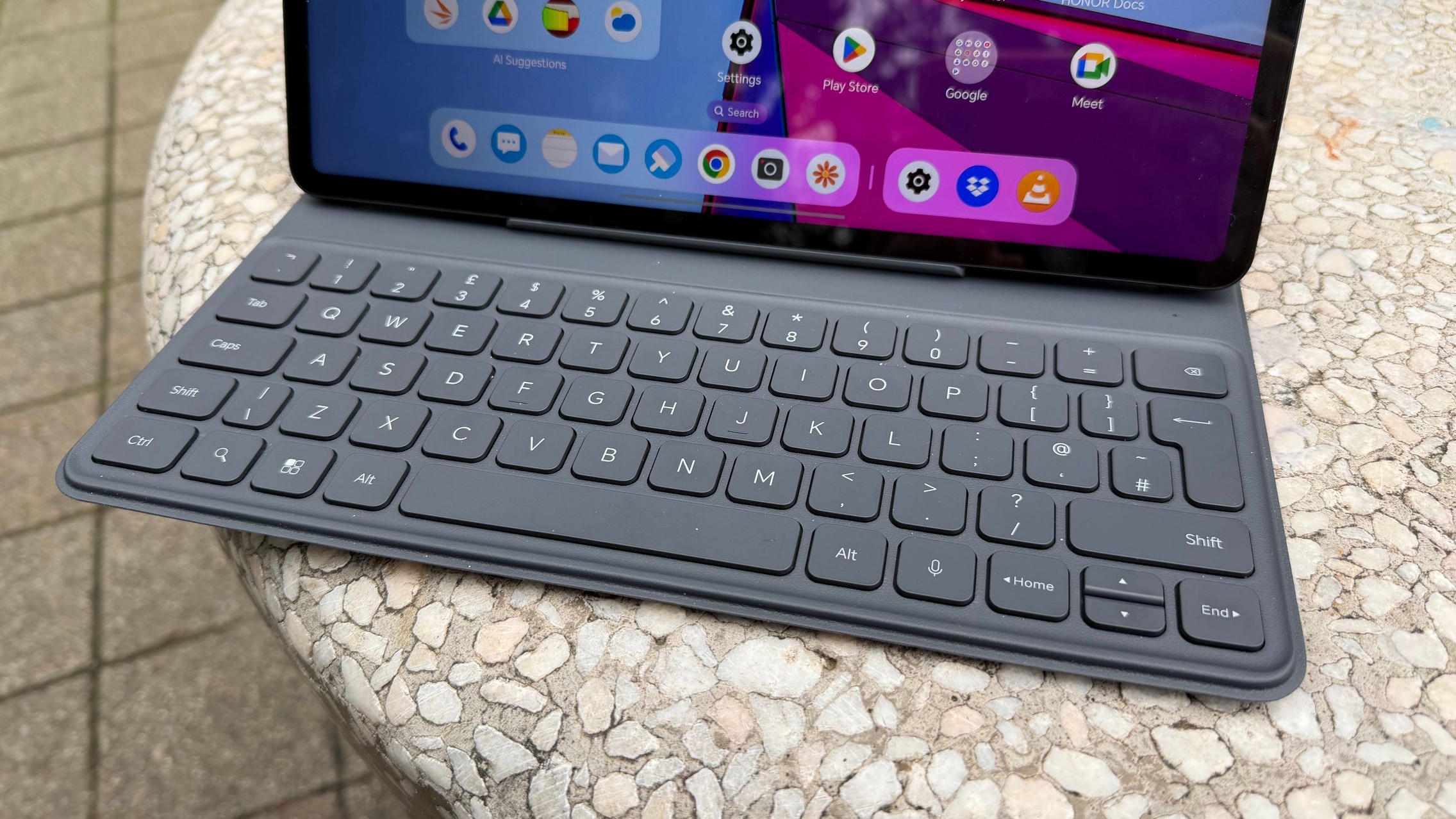 Şi tastatura e comodă, are travel comod pentru a scrie rapid şi sunt generos spaţiate tastele. Are buton ON/OFF şi alimentare pe USB-C. Husa cu tastatură e groasă şi apără cum trebuie tableta.