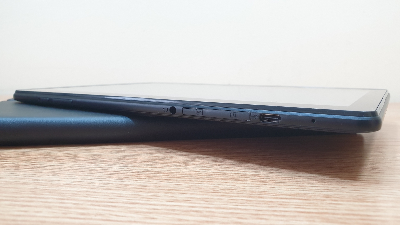 Pe partea audio avem în continuare un setup de difuzoare stereo care se aud foarte bine, având volum puternic pentru a nu avea probleme în a înțelege ce vrea să spună profesoara la cursuri. Tableta mai are și jack audio dacă vreți să folosiți căști, iar ca accesorii, așa cum v-am spus și mai sus, oferă o husă kickstand foarte utilă. Aceasta este realizată dintr-un material similar cu pielea la exterior, pentru un feeling premium, iar partea interioară este la rândul său soft la atingere. Cu ajutorul acestei huse tableta poate fi plasată în diferite unghiuri pentru a face mai ușoară interacțiunea.
