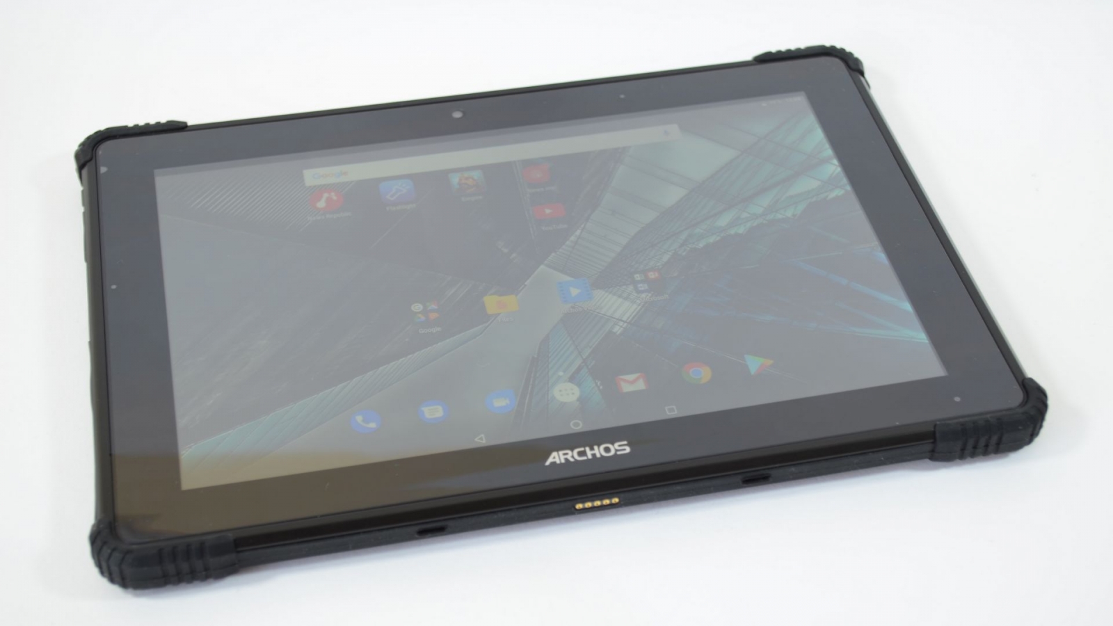 Primul aspect de care mă leg aici este design-ul, capitol unde tableta se prezintă chiar bine ținând cont de alura sa de terminal semi-rugged. După cum era de așteptat, are muchii generoase în jurul ecranului și carcasă realizată dintr-un policarbonat dur peste care a fost aplicată o protecție din cauciuc rigid, fiind prezente aceste întărituri în cele 4 colțuri care sunt predispuse contactului cu suprafețele dure la căzăturile minore.