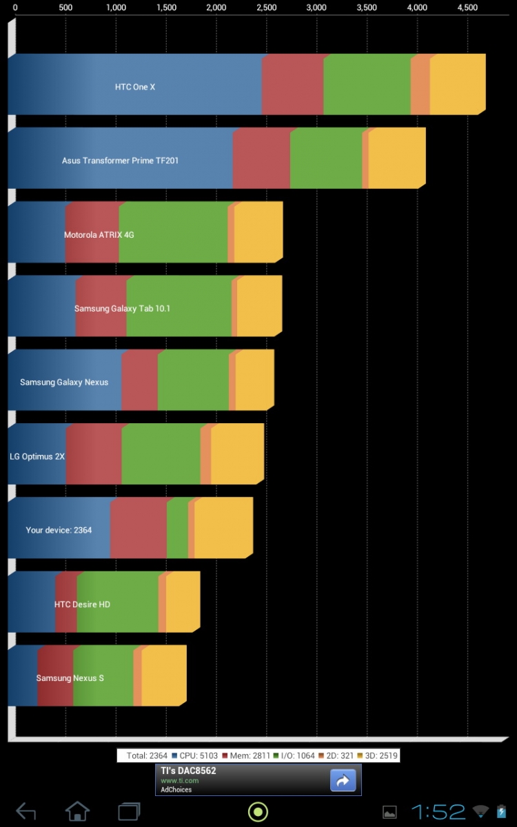 Aici apare și o problemă: tableta se încarcă în 8 ore sau chiar 10, ceea ce devine foarte deranjant. Trecând la zona de benchmark, am scos 2364 de puncte în Quadrant, față de cele 4600 ale lui ASUS Infinity sau cele 3700 ale lui ASUS Transformer Pad 300, ambele dotate tot cu procesor quad core Tegra 3, deci e o problemă aici. în AnTuTu am scos un foarte bun scor de 11.046, pe care îl comparăm cu cel de 11.700 al lui ASUS Transformer Pad Infinity 700, sau cel de 10.000 al lui Pad 300. în NenaMark 2 am obținut 59.9 FPS, față de cei 46 FPS ai lui Pad 300 și 34.6 FPS ai lui Infinity Pad 700, dar acesta din urmă are de mișcat mai mulți pixeli pe o rezoluție full HD, deci se justifică astfel.