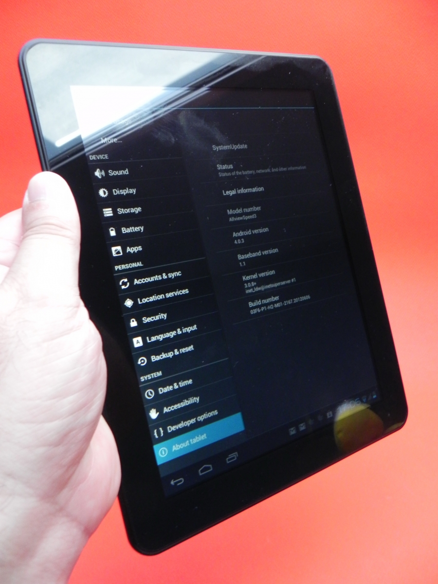 Din păcate bateria se încarcă foarte greu și va fi nevoie uneori de peste 3-4 ore pentru încărcare full. Terminalul rulează Android 4.0.3 ICS fără vreo personalizare din partea Allview. Hai să vedem cum stăm la capitolul benchmark-uri. Allview Alldro 3 Speed scoate 1685 de puncte în Quadrant, aproape de cele 1748 ale lui Yarvik GoTab Zetta, dar mult sub cele 2600 ale lui Samsung Galaxy Tab 2 7.0. Amintesc de această tabletă deoarece ea costă doar cu 200-300 mai mult decât Allview Alldro 3 Speed și servește drept punct de referință.