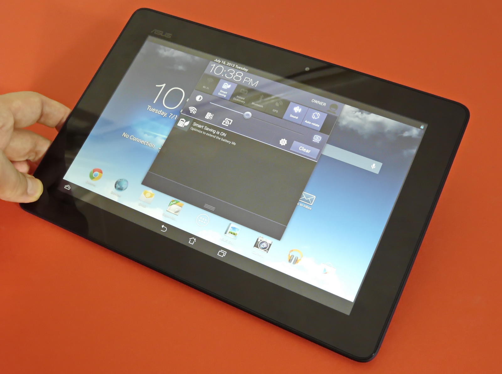 Noul MeMo Pad suporta conectivitate WiFi, Bluetooth 3.0, Miracast, WiFi Direct și vine cu o cameră de 5 megapixeli cu autofocus și captură Full HD, plus o cameră frontală de 1.2 MP cu captura 720p. Avem la dispoziție și un G Sensor, giroscop, busolă digitală, senzor de lumină ambientală și o baterie de 6760 mAh, care pe hârtie asigura 10 ore de funcționare. La testele noastre, bateria a atins 10 ore de playback HD pe YouTube, cu luminozitate la 50% și WiFi pornit, sau 5 ore de gaming continuu. Există și o opțiune Smart Saving, dacă vreți să administrați mai bine bateria. Ea va dezactiva conectivitatea atunci când tableta este în standby, printre altele.