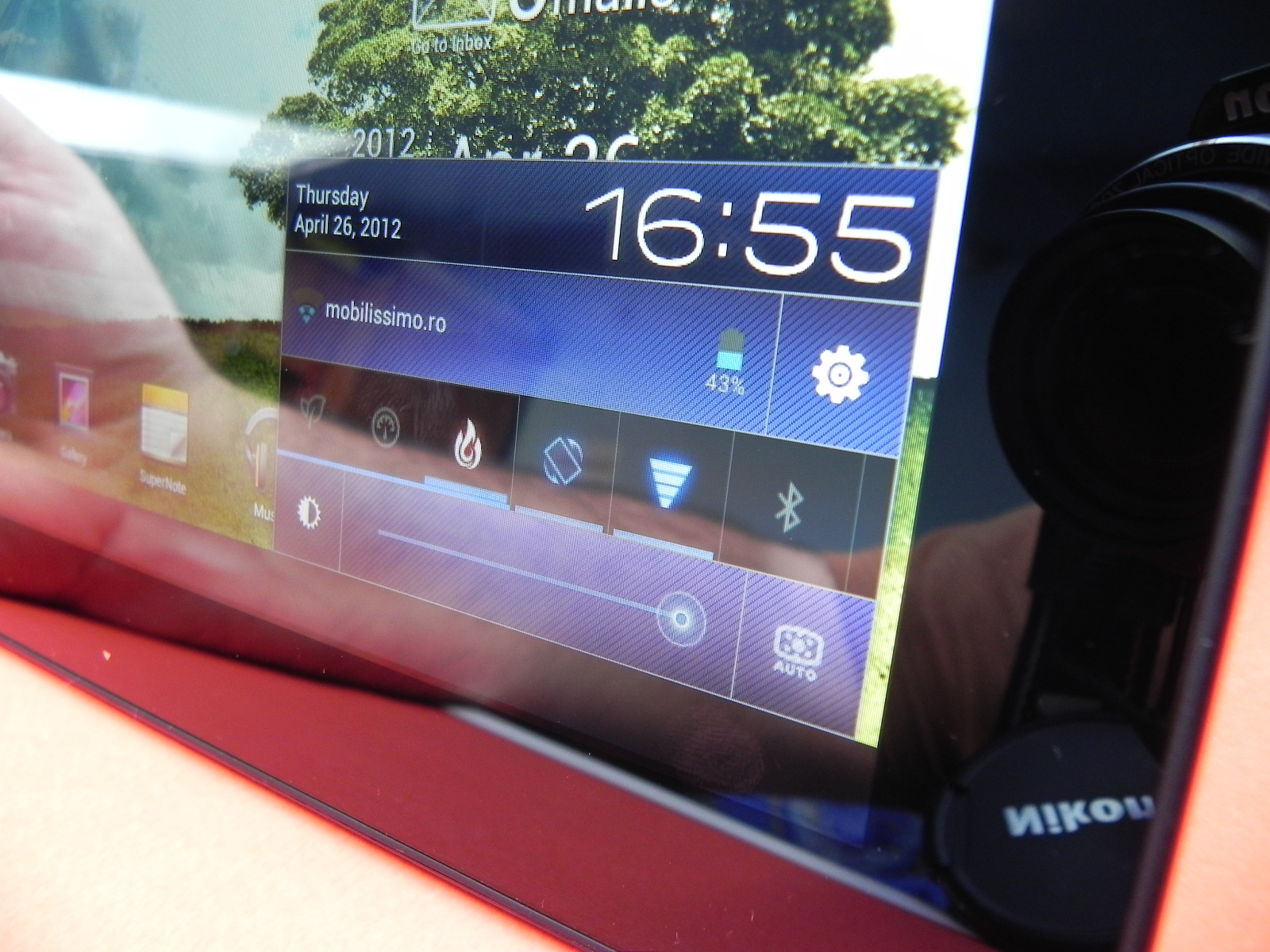 Trecând la software, trebuie să aflați că tableta rulează Android 4.0.3, care aduce faimosul multitasking pe bază de swipe pentru a închide aplicațiile, printre altele. Avem și o schimbare de look al iconurilor și widgeturilor, iar revenind la butonul de multitasking, dacă îl veți ține apăsat veți realiza un screenshot astfel, dar funcția trebuie activată din setări. și vorbind de setări, meniul asociat este disponibil în zona dreapta-jos a ecranului, unde găsiți de obicei notificările pe tabletele Android. Tot aici reglăm modul de performanță al tabletei și găsim și acele butoane care dezactivează opțiunile de conectivitate.