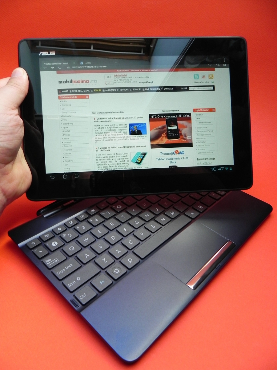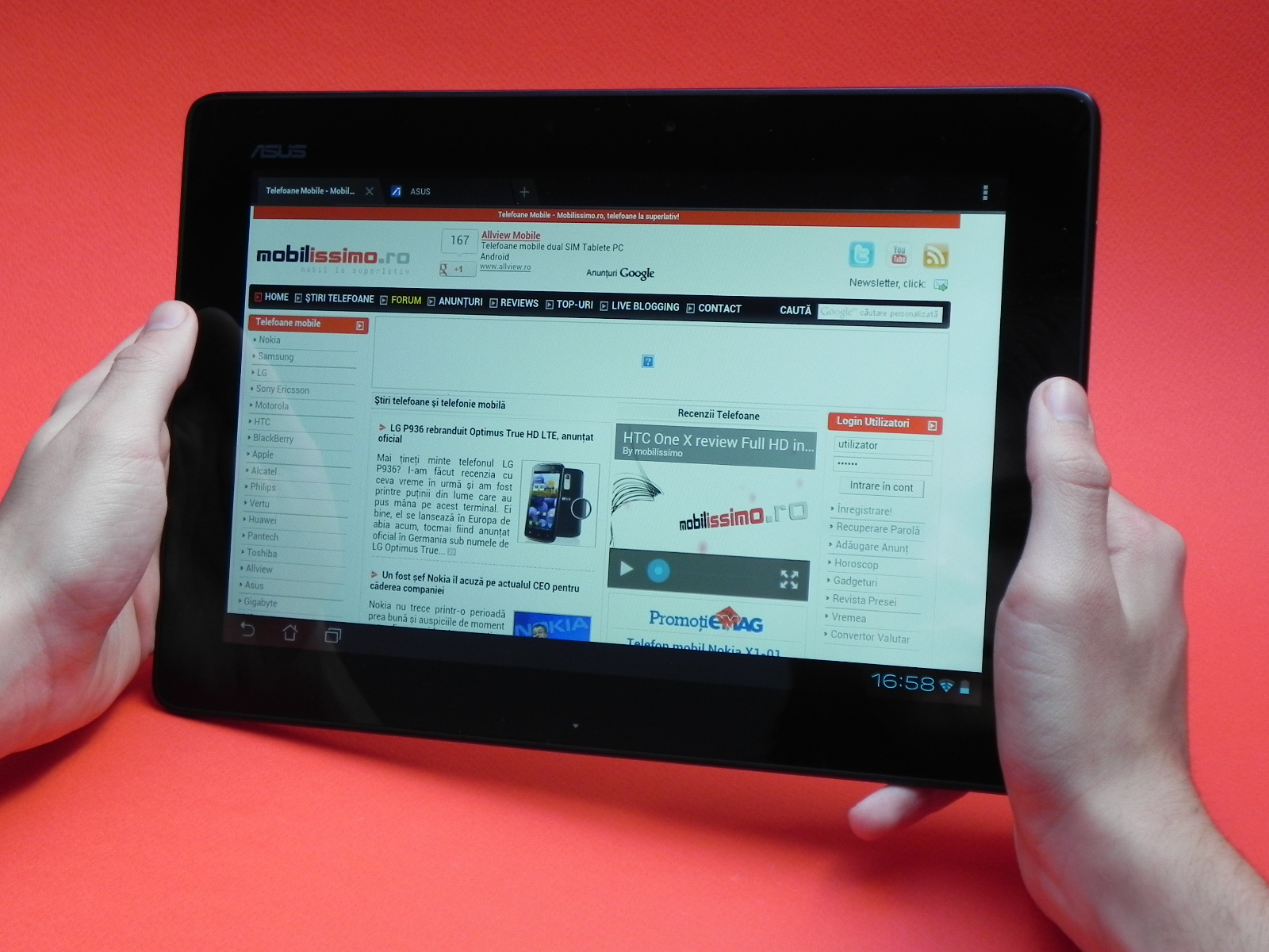 Avem și un GPU GeForce 12 core pe care l-am pus la treabă într-o recenzie a unui joc special creat pentru tabletele Tegra și pe care îl vedeți pe canalul YouTube Mobilissimo. Alte dotări includ 1 GB RAM, 32 GB memorie internă, o cameră de 8 megapixeli cu autofocus, camera frontală de 1.2 megapixeli și ecranul de 10.1 inch, cu rezoluție de 1280 x 800 pixeli și bazat pe tehnologie IPS cu iluminare LED. Aflați și că ASUS a inclus tehnologia SonicMaster Audio pe acest terminal, pentru o experiență audio de calitate. Avem și un egalizator cu multe presetări și opțiuni, iar difuzorul singular din spatele tabletei sună excelent, are bas bun și nu produce vibrații în structura tabletei cum se întâmplă la Motorola Xoom 2.