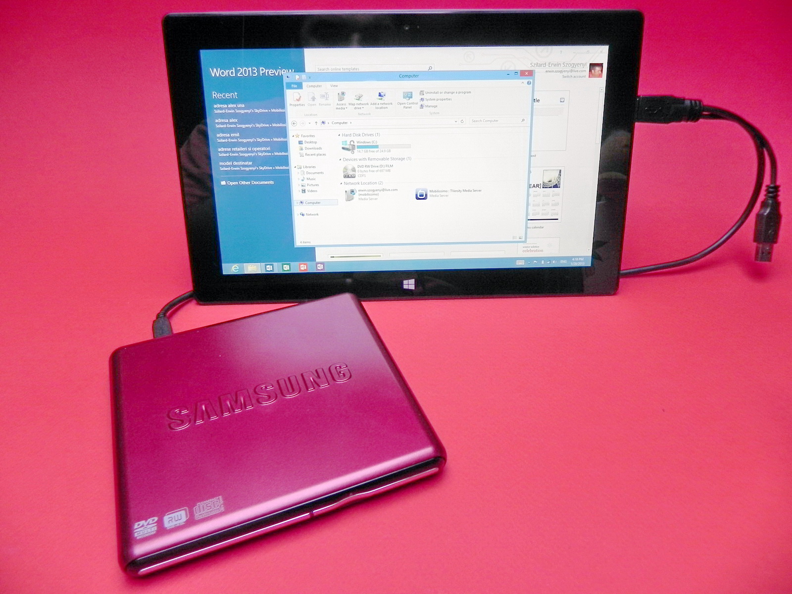 Am conectat și un CD Writer la tabletă, el fiind depistat ca unitate optică, în cazul în care vreți să folosiți un DVD sau anticul deja CD. Evident, la USB puteți conecta și un mouse sau o tastatură sau le puteți conecta pe cele speciale de la Microsoft. și acum hai să trecem la concluzii și să vedem ce ne-a încântat la Surface și ce ne-a displăcut.