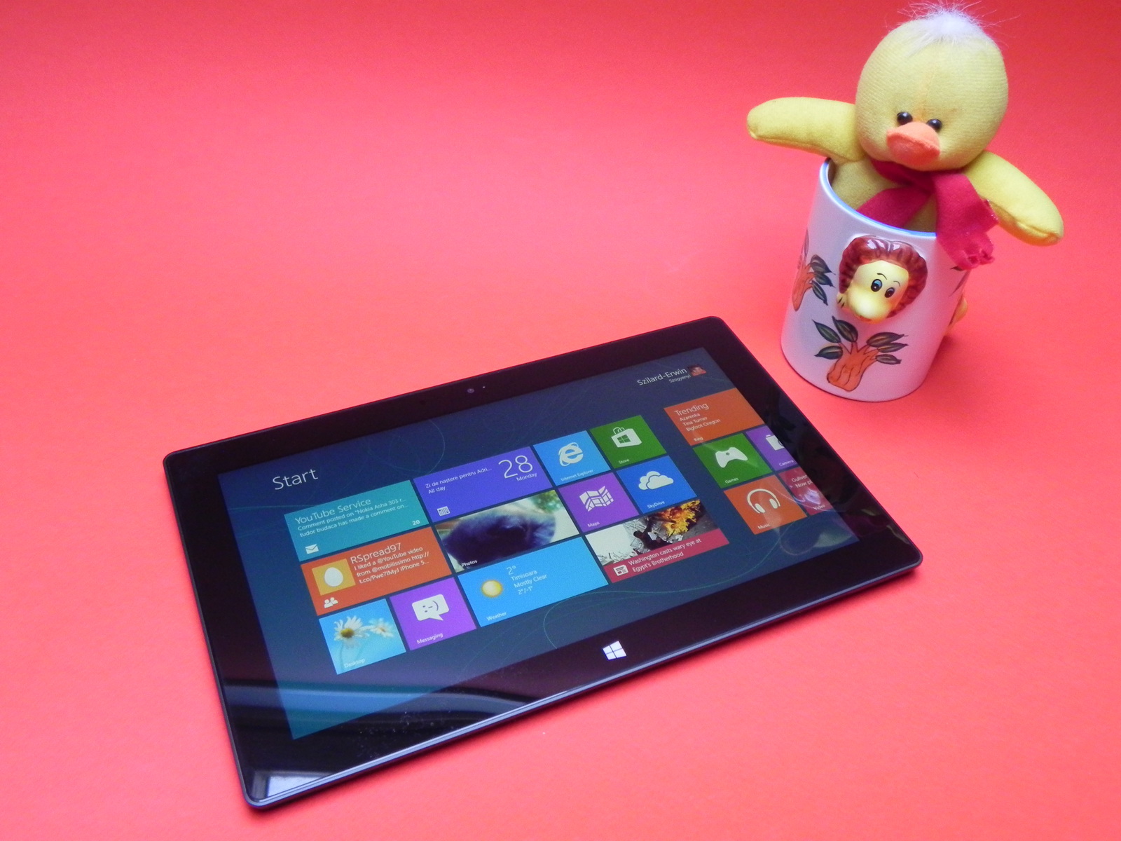 Aici intervine Windows Store, din care vă luați aplicațiile și trebuie să recunosc că acesta a început să fie destul de populat cu jocuri interesante în ultima vreme. V-am prezentat în video review și zona desktop, pe care sincer o găsesc inutilă, poate doar ca file manager, altfel nu îi văd rostul. SkyDrive e la posturi pentru stocarea în cloud, plus o suită de aplicații Bing de știri, căutare, turism și sport. La pachet cu tableta vine și suita Office 2013, care nu pare totuși adaptată epocii Post PC și necesită un mouse și o tastatură pentru a lucra cu interfața migăloasa.