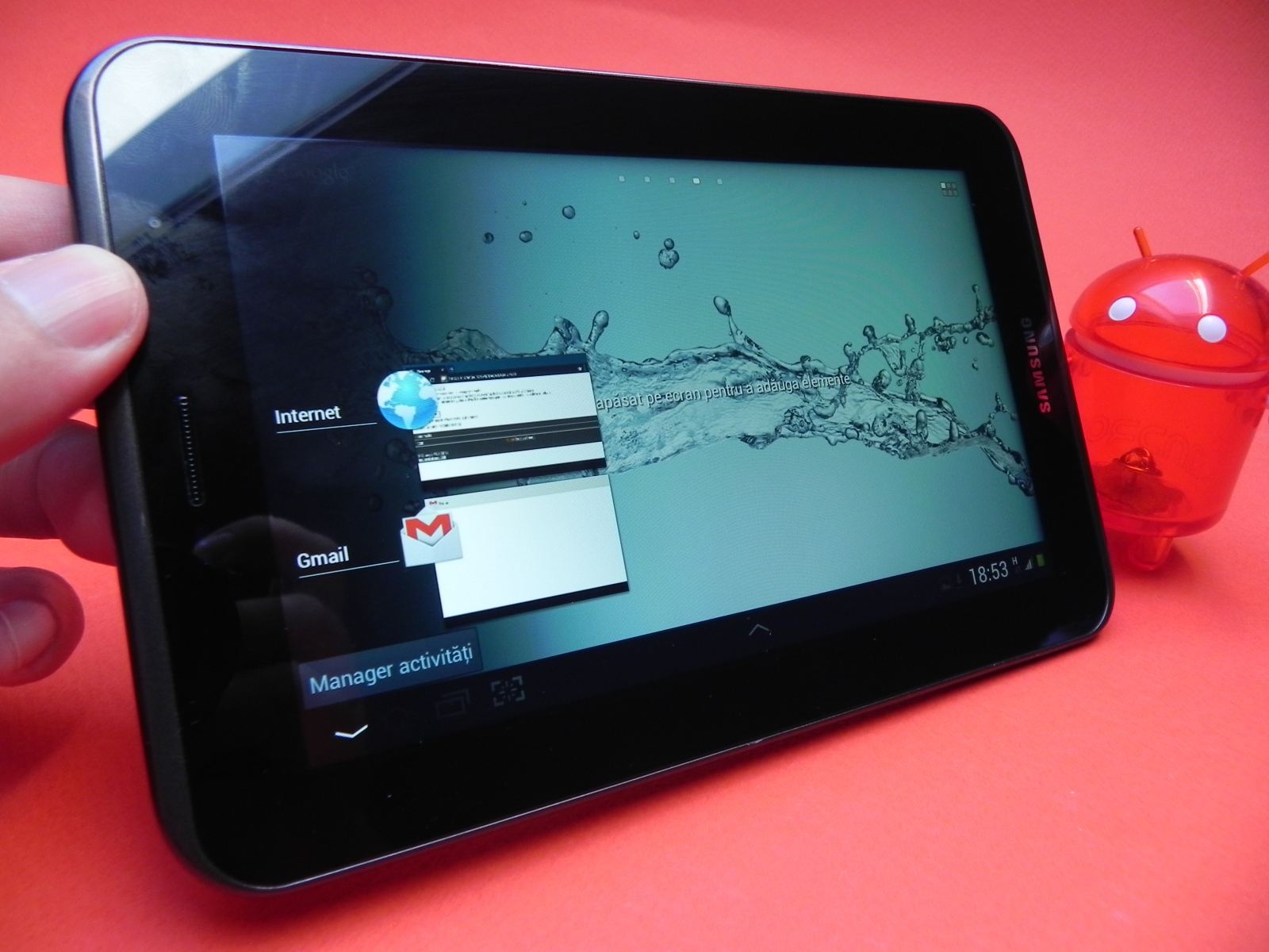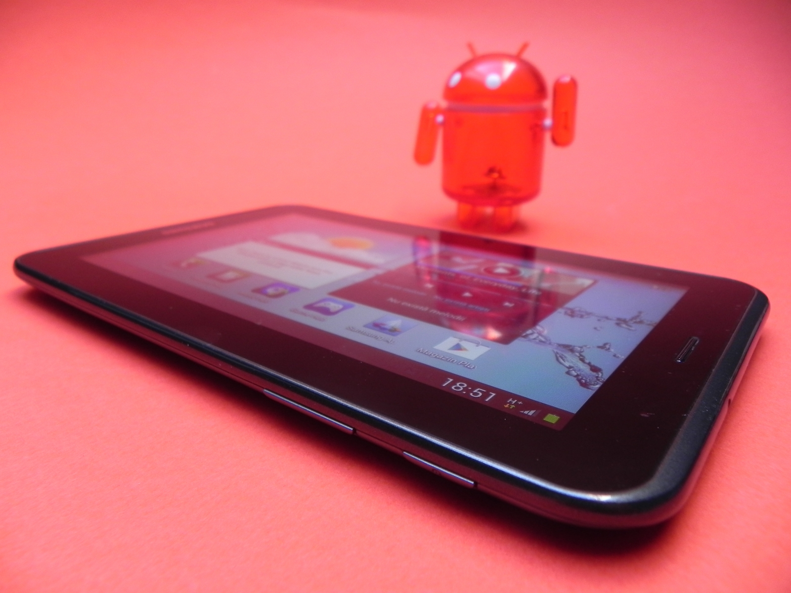în rest, experienta Android 4.0 ICS este cea standard, cu buton de multitasking în partea stângă jos, aplicații și widgeturi disponibile spre accesare în partea dreaptă sus și o zonă de setări în partea dreaptă jos. Tableta folosește incomoda interfața TouchWiz și obișnuitele Huburi Readers, Music și Game, plus magazinul de aplicații Samsung, care a primit și o actualizare între timp. în schimb în recenzia noastră magazinul de aplicații nu funcționa, pregătindu-se probabil pentru update.