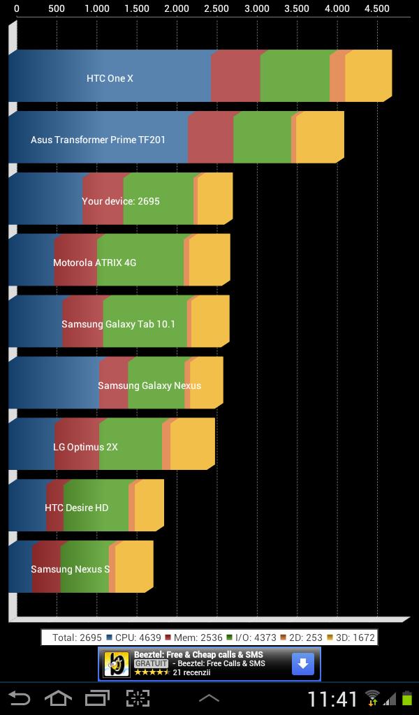 Tastatura virtuală este comodă, cu un rând numeric binevenit, iar browserul web este rapid și eficient, răspunzând destul de bine la pinch to zoom și scrolling. în ce privește testarea performanțelor, Samsung Galaxy Tab 2 7.0 a scos 2965 de puncte în Quadrant, aproape identic cu Galaxy Tab 2 10.1, la 2.647, doar au aceleași dotări. în schimb aflați că Galaxy Tab 7.7 a scos 1947 dacă vreți o comparație, iar o tabletă similară, Motorola Xoom 2 de 8.2 inch scoate sub 1700 de puncte. în AnTuTu am scos 5.366 de puncte, deci cam jumătate din performanta unui HTC One X și Galaxy S III, dacă vreți să vă faceți o idee. în privința lui NenaMark 2, în acest benchmark am obtinuit 26.3 FPS, față de cele 18 frame-uri de pe Galaxy Tab 2 10.1, care trebuie să miște mai mulți pixeli pe un ecran mai mare. între timp Galaxy Tab 7.7 scoate 37 fps, iar Motorola Xoom 2 8. 2doar 19.27, deci Galaxy Tab 2 7.0 nu sta chiar rău.