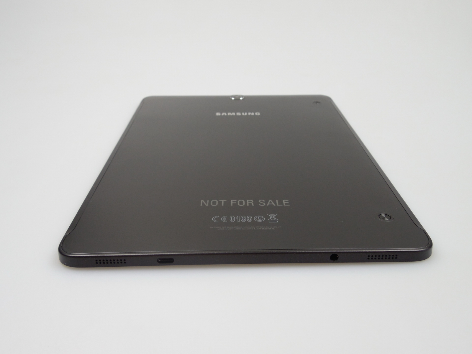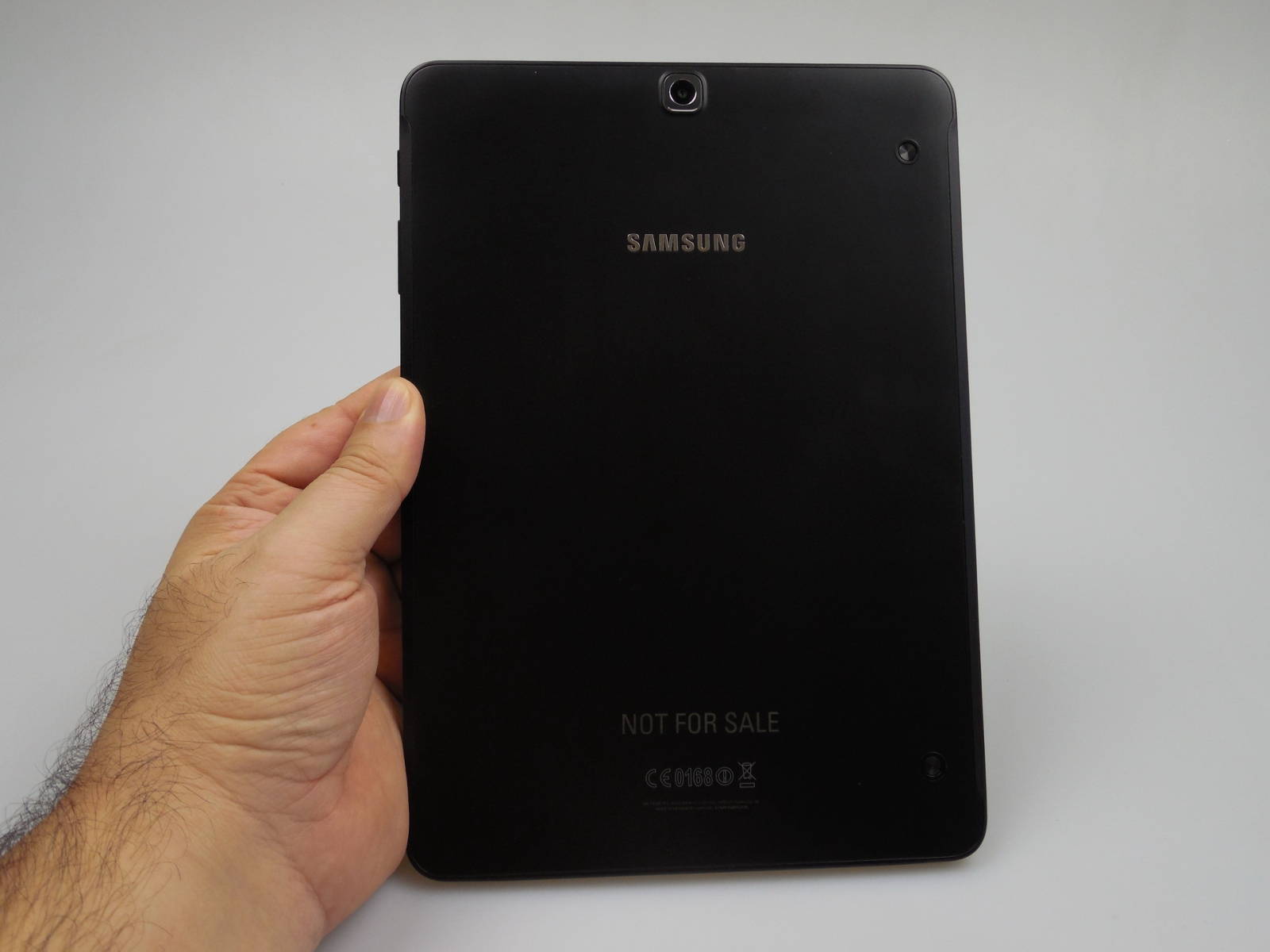 În spate găsim camera principală şi doi conectori pentru husele şi accesoriile speciale. Nu avem nici un element deosebit de design în zona superioară, în vreme ce jos luăm contact cu jackul audio, portul microUSB şi două difuzoare. În stânga nu se află nimic, iar în dreapta accesăm butoanele de volum şi cel Power, cu feedback OK. Tab S2 9.7 este o tabletă foarte comodă şi ultraslim, cu avantajul că nu devine extrem de rece iarnă că iPad-ul.Nota pentru design este de 9.2 din 10. Acest produs vine pe alb, auriu şi negru.